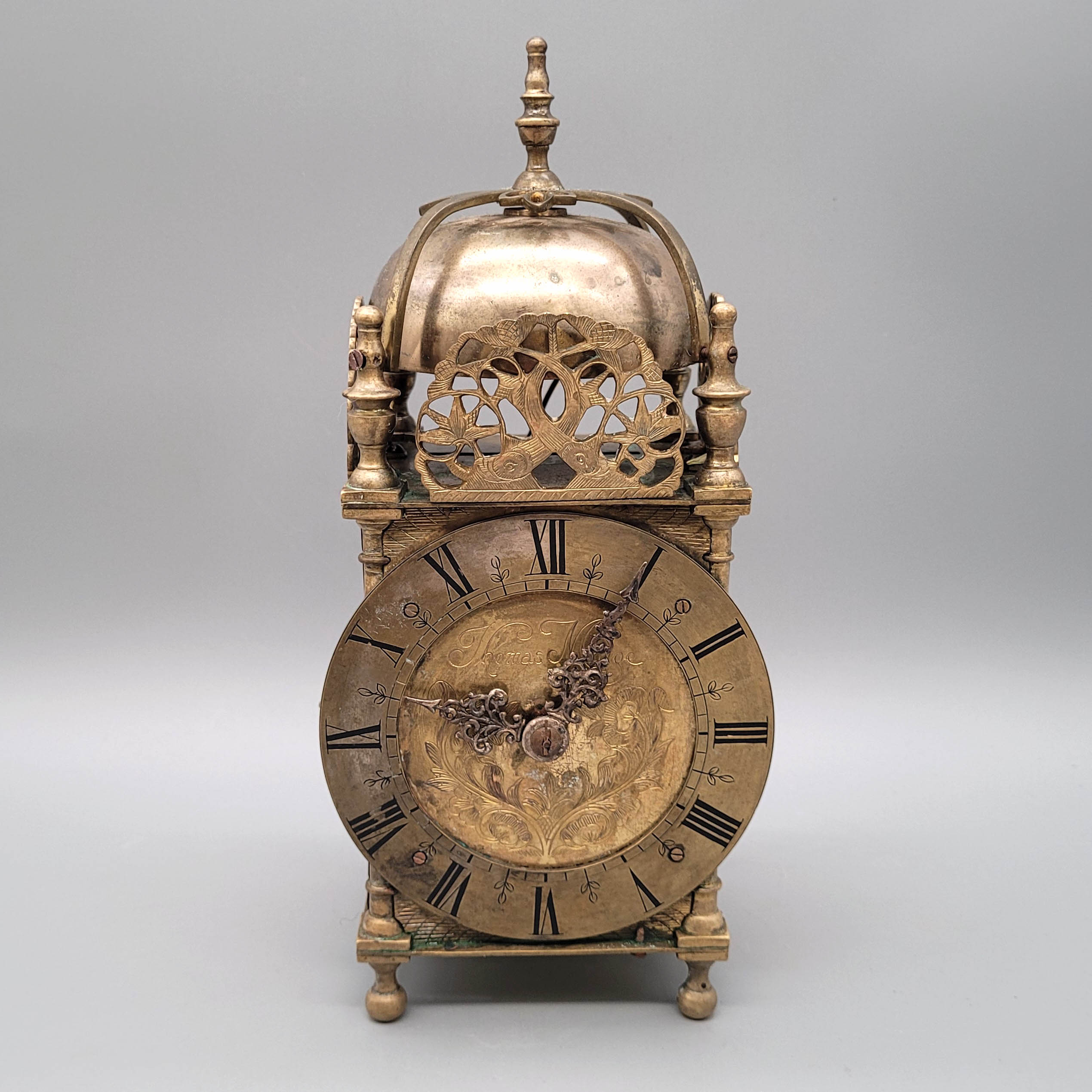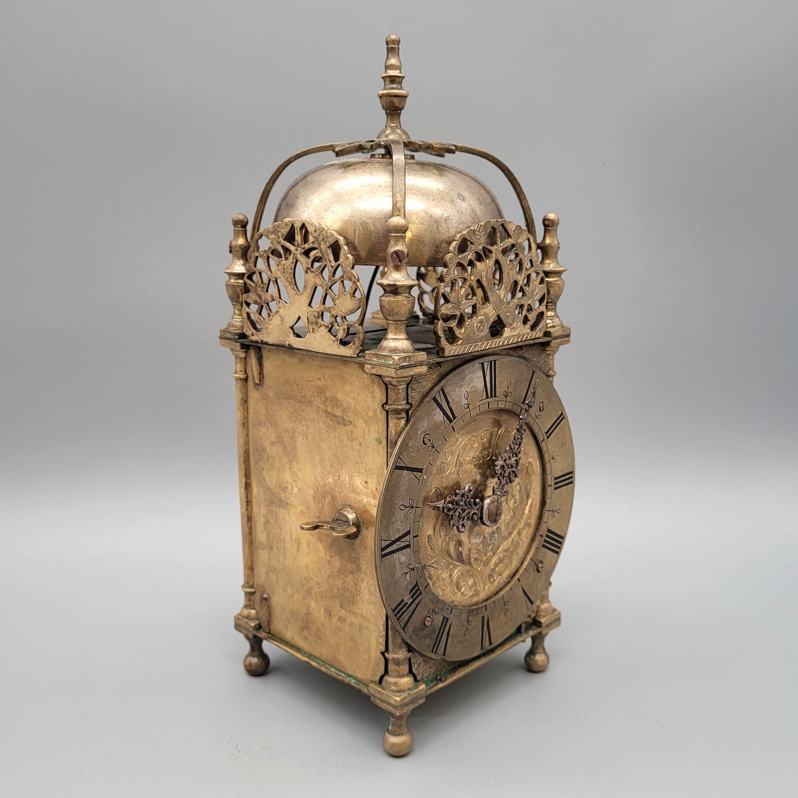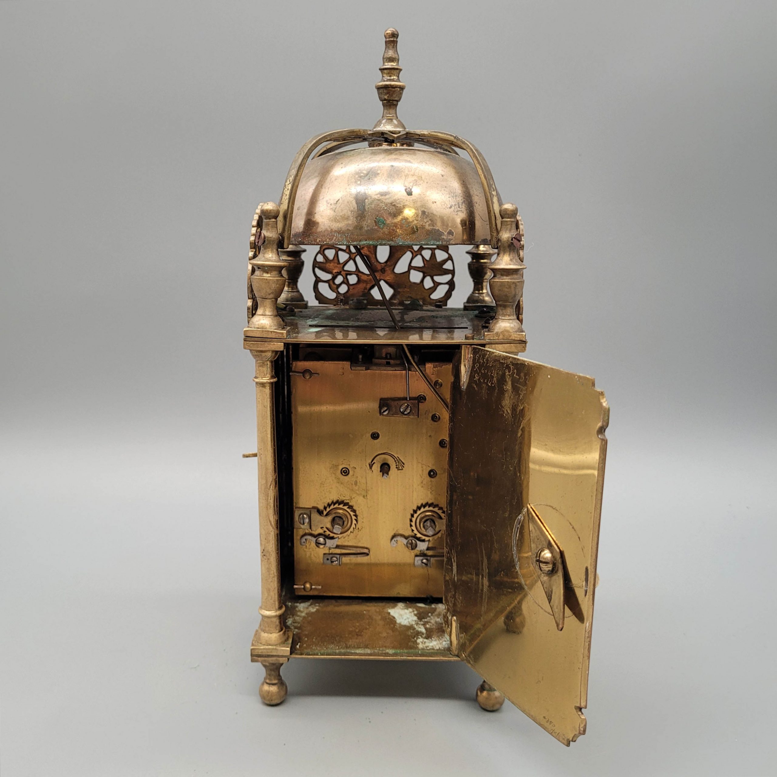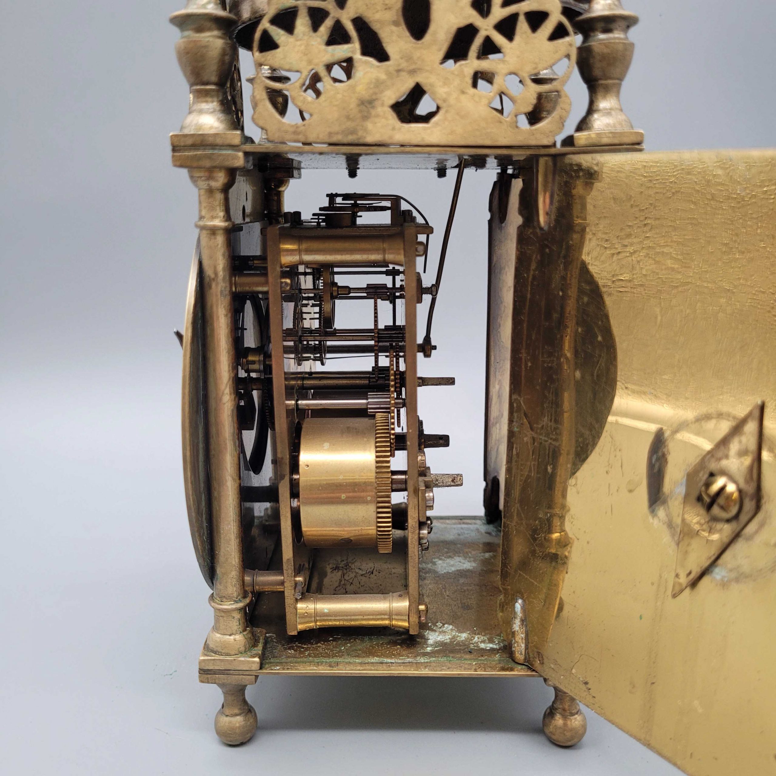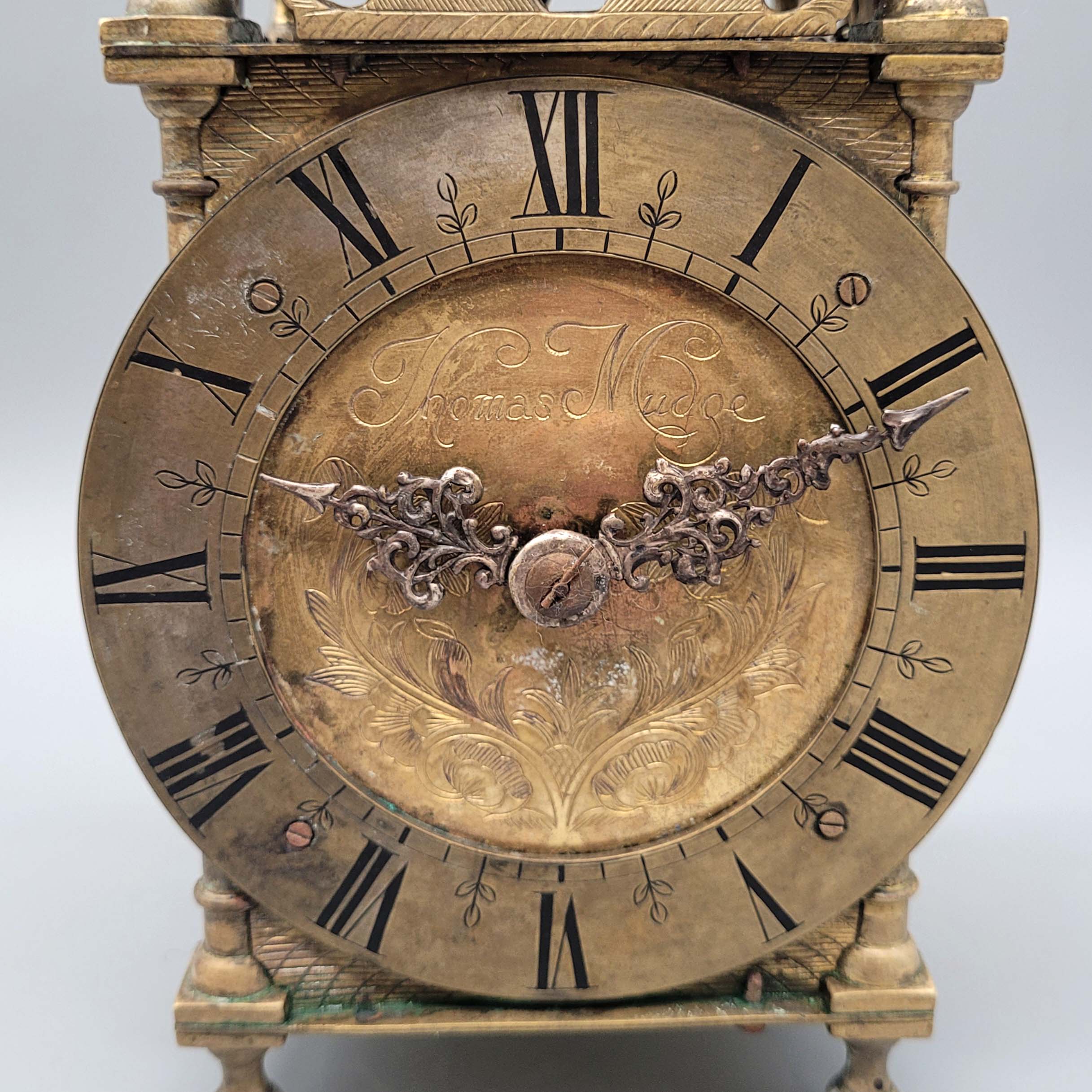 Messing, Schlüsselaufzug, Ziffernring mit römischer Stundenanzeige, Minutenbalken, ausgeschnittene Silberzeiger, Zifferblatt bezeichnet „Thomas Mudge“ (1715-1794), Glockenhelm, Stundenschlag auf Glocke, London 2. Hälfte 18. Jahrhundert, 25 x 11 x 9,5 cm (Uhrwerk läuft nicht an)