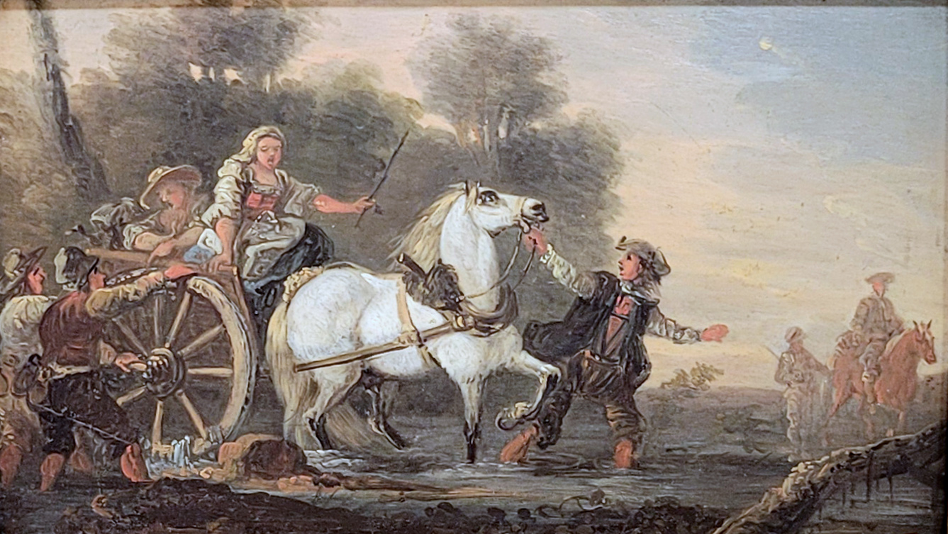 DEUTSCHER MEISTER (18. Jh.): Die Durchquerung des BachesStudie, Öl auf Holz, verso Aufkleber mit einer Zuschreibung an Johann Conrad Seekatz, 12,5 x 20,5 cm, Rahmen