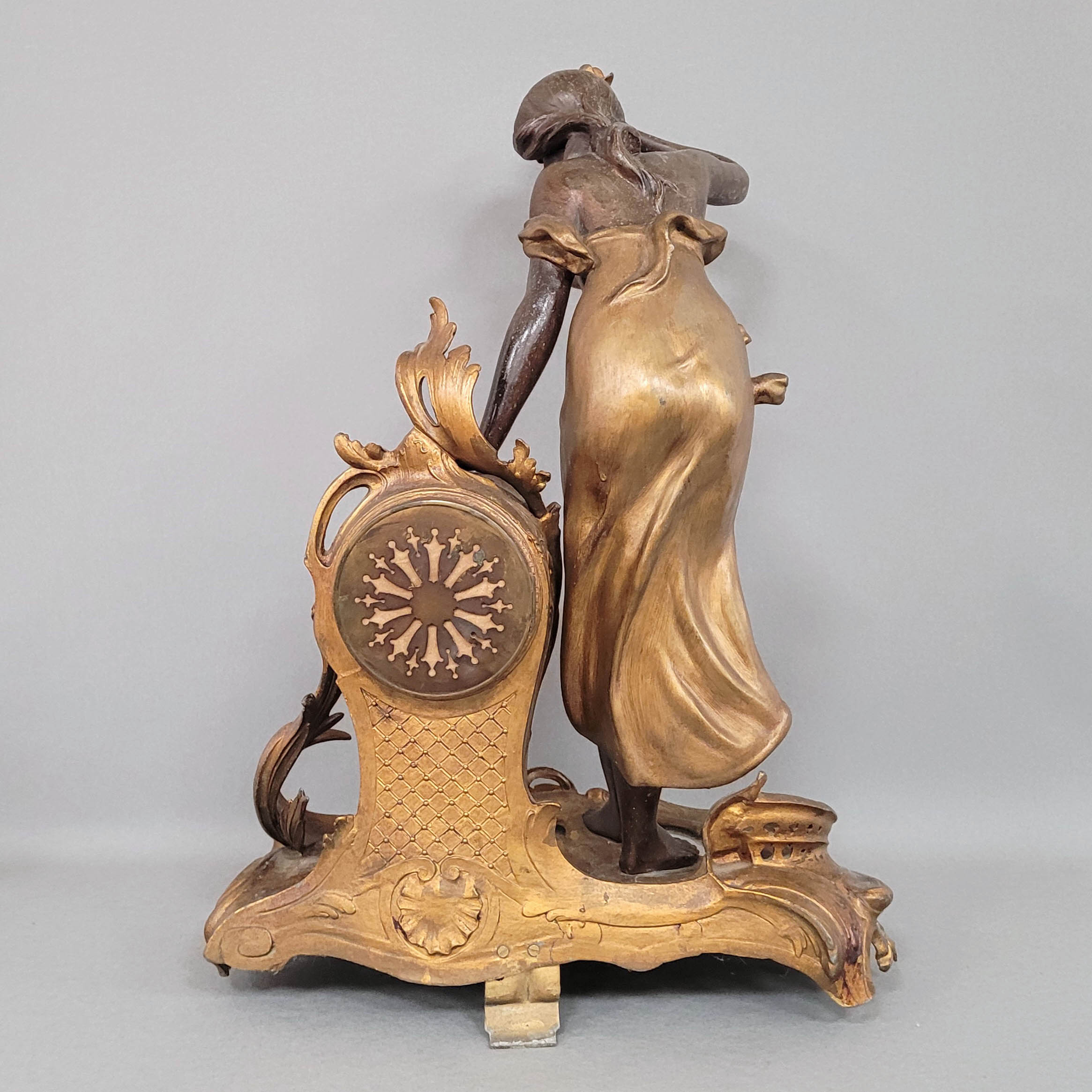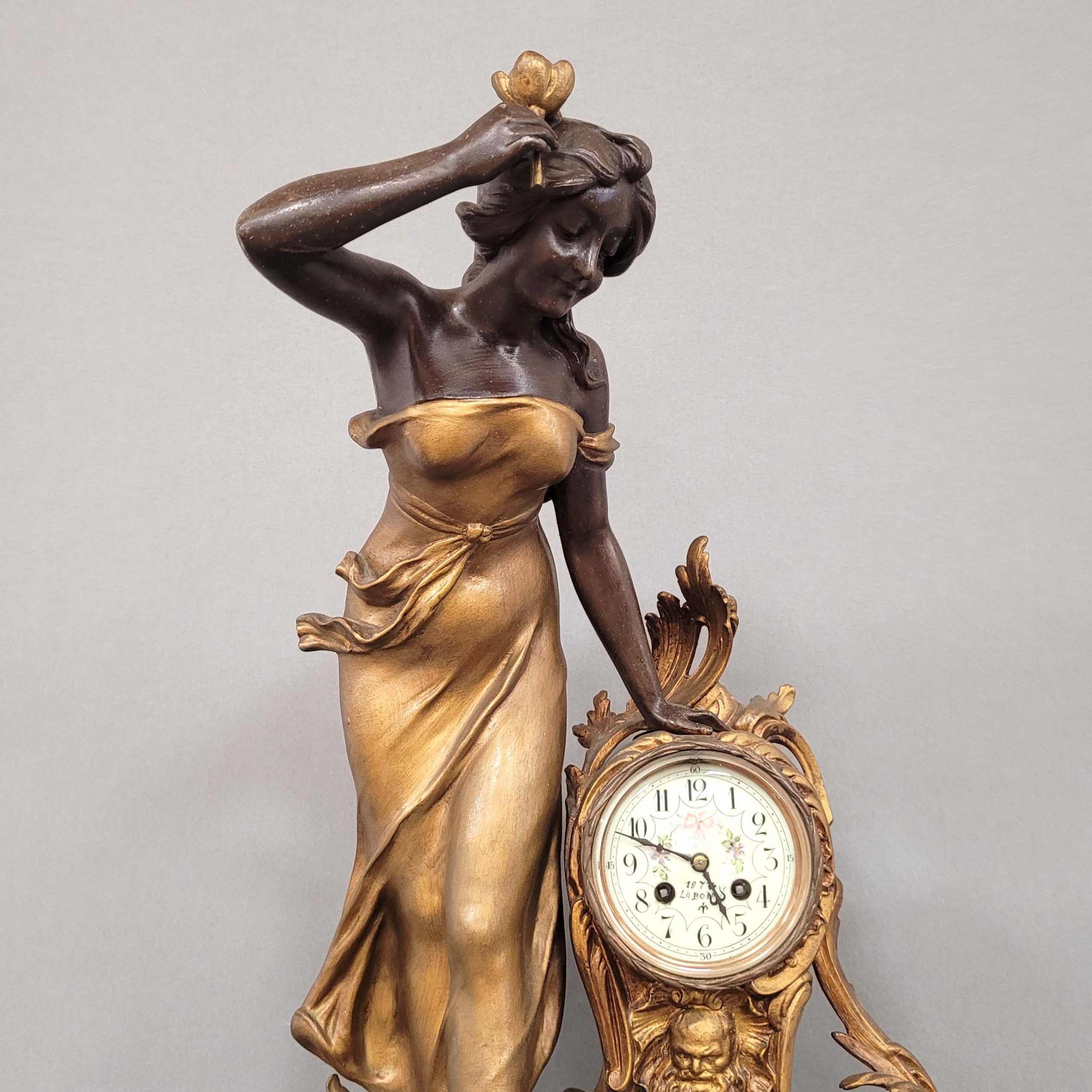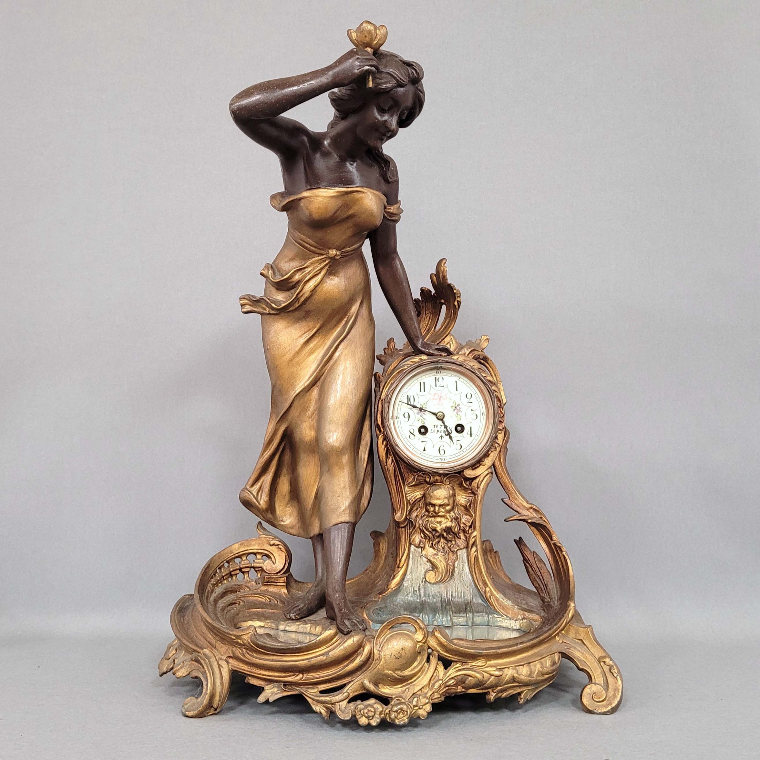 Zinkguss, verschiedenfarbig patiniert, bronziert, Standplatte mit Glaseinlagen, große Frauenfigur mit Blume, Emaillezifferblatt, Blumengirlande, datiert 1871, arabische Stundenanzeige, Pendelwerk, Halbstundenschlag auf Glocke, Frankreich 19. Jahrhundert, Höhe 60 cm (Uhrwerk läuft an, Pendel fehlt)