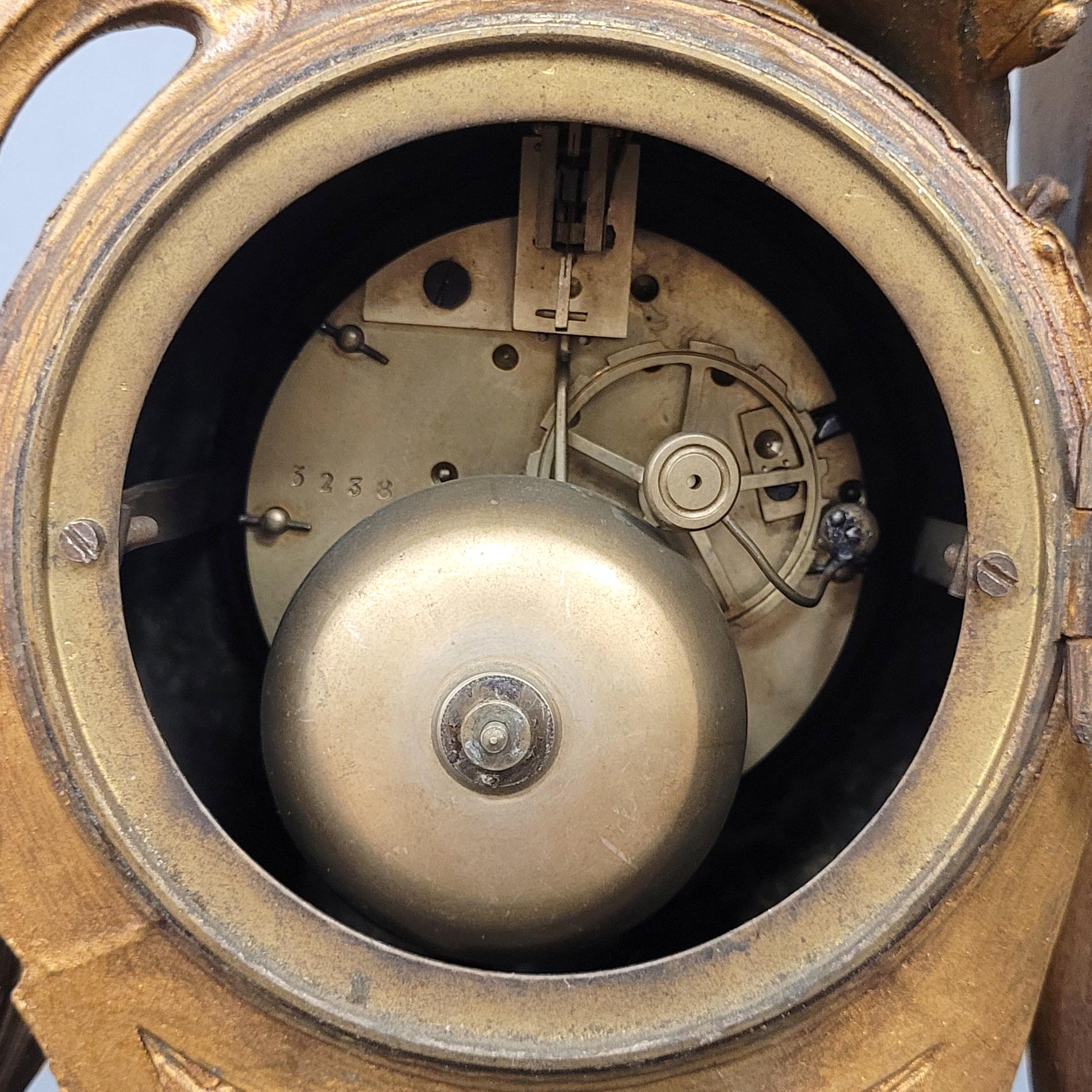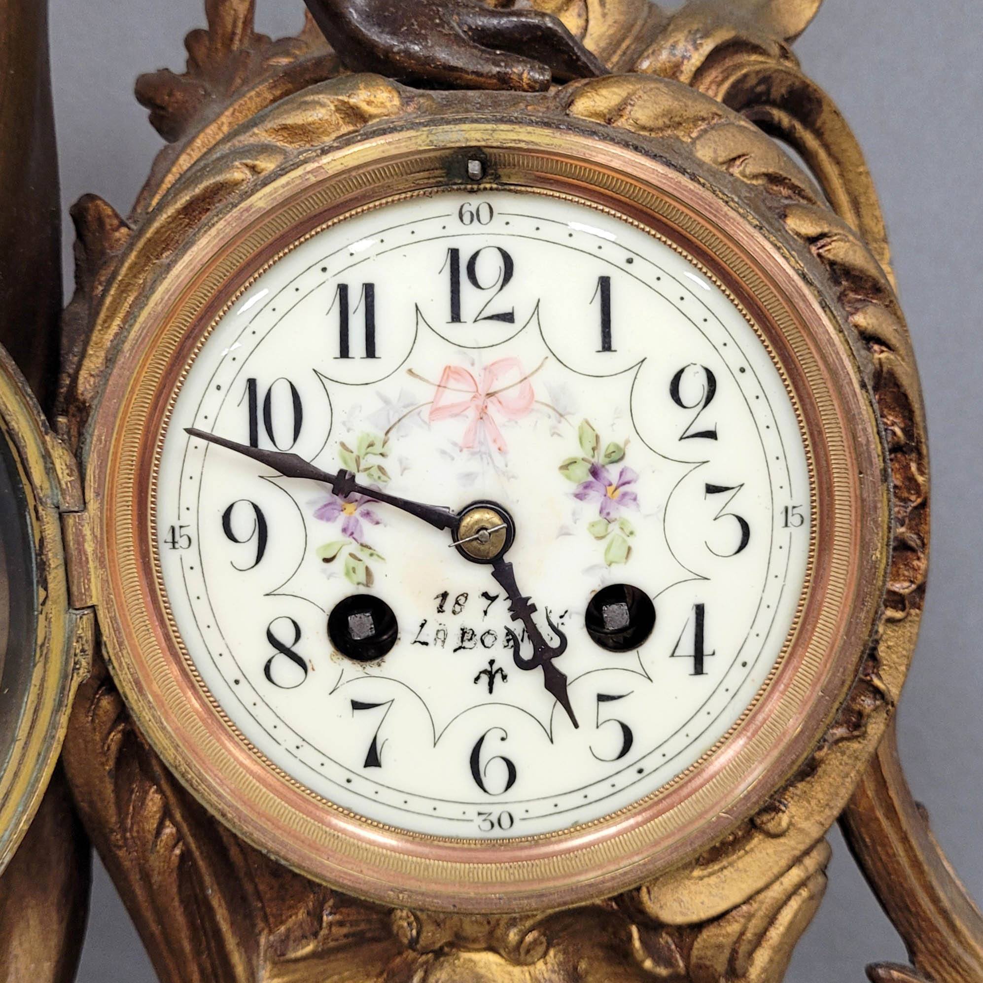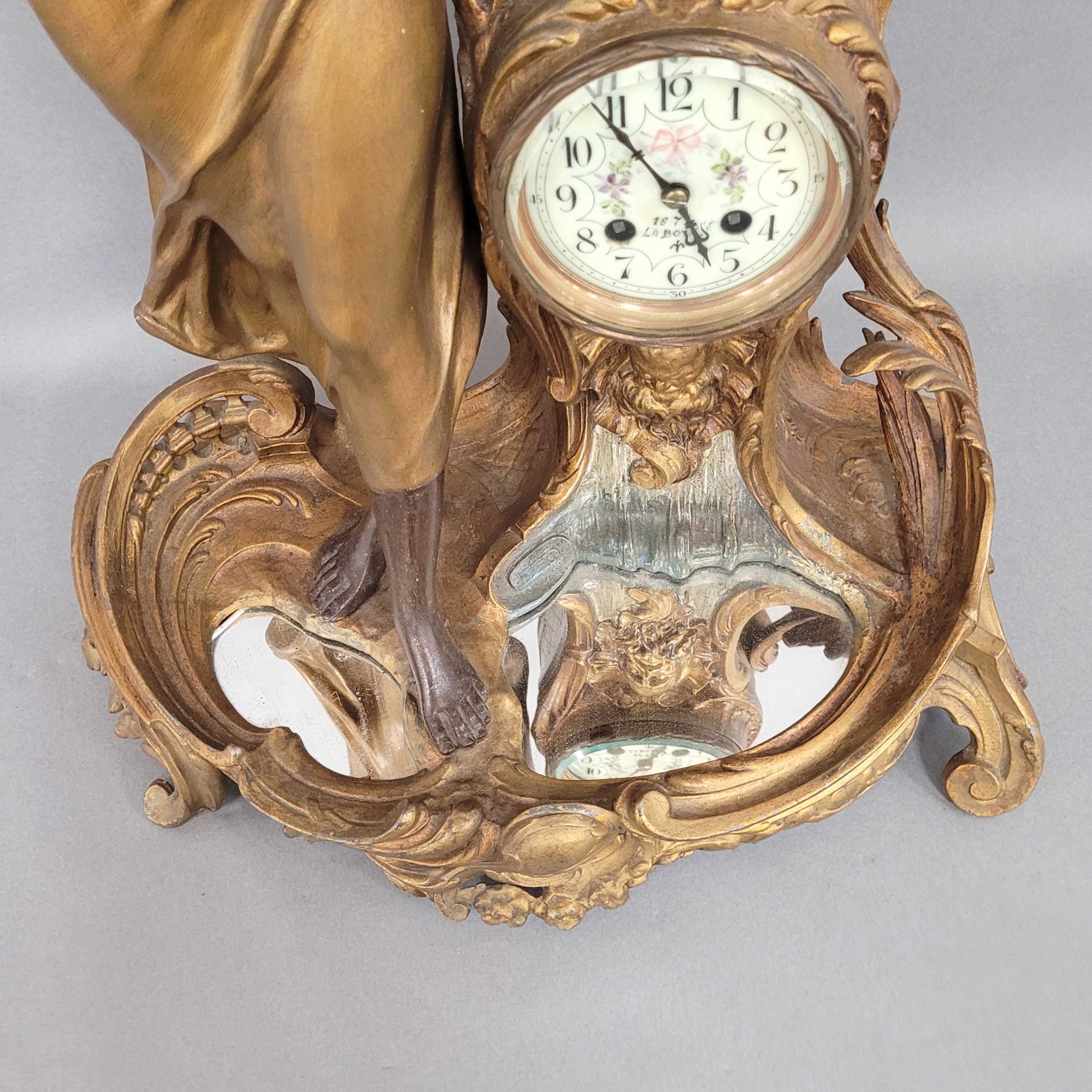 Zinkguss, verschiedenfarbig patiniert, bronziert, Standplatte mit Glaseinlagen, große Frauenfigur mit Blume, Emaillezifferblatt, Blumengirlande, datiert 1871, arabische Stundenanzeige, Pendelwerk, Halbstundenschlag auf Glocke, Frankreich 19. Jahrhundert, Höhe 60 cm (Uhrwerk läuft an, Pendel fehlt)