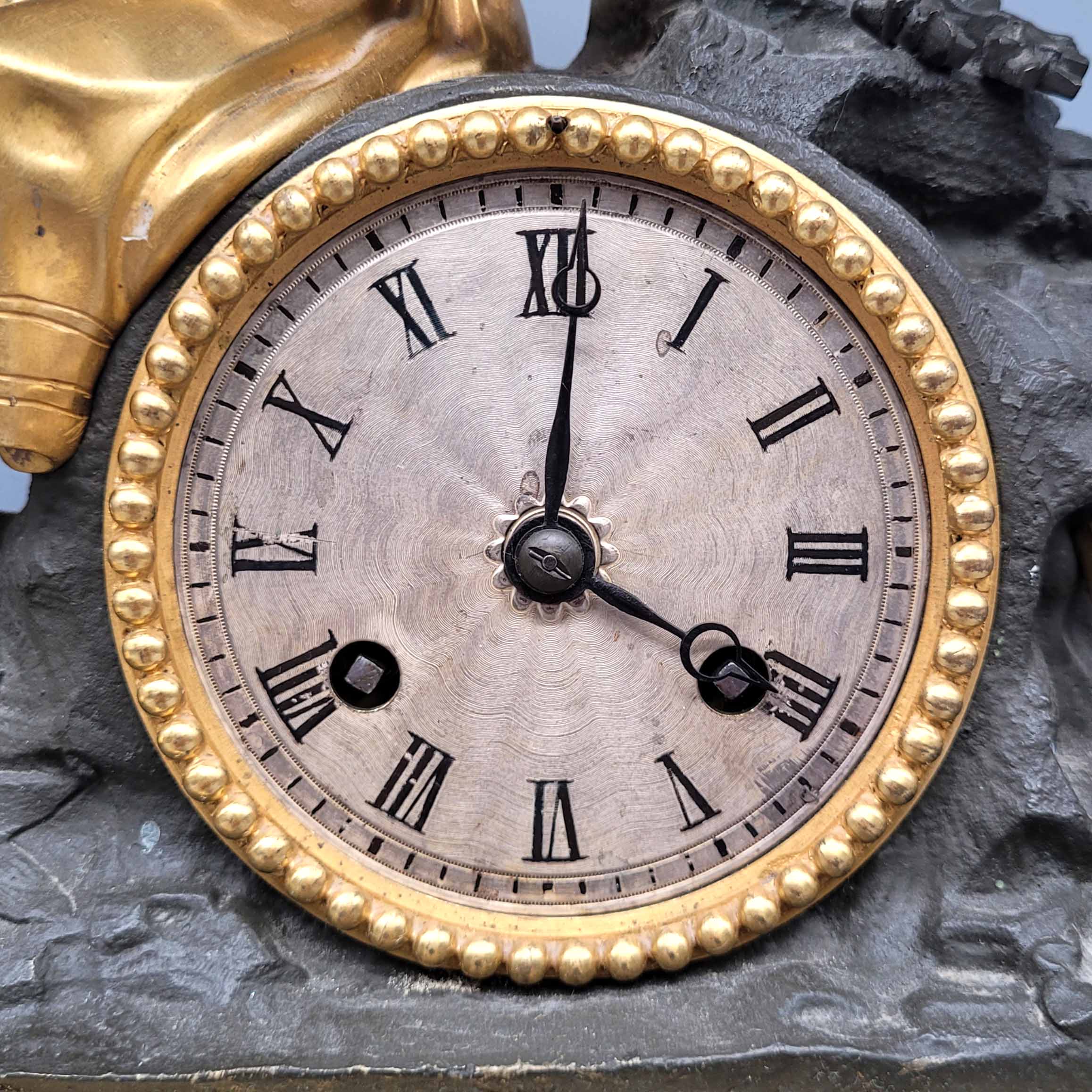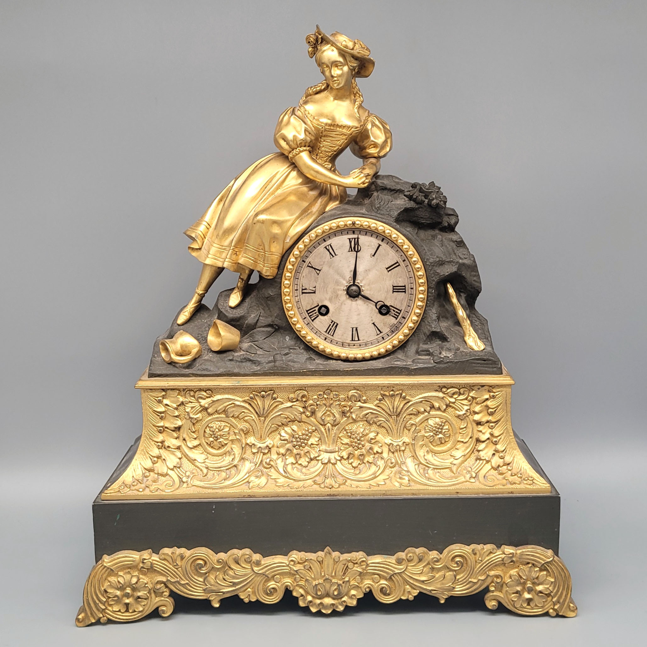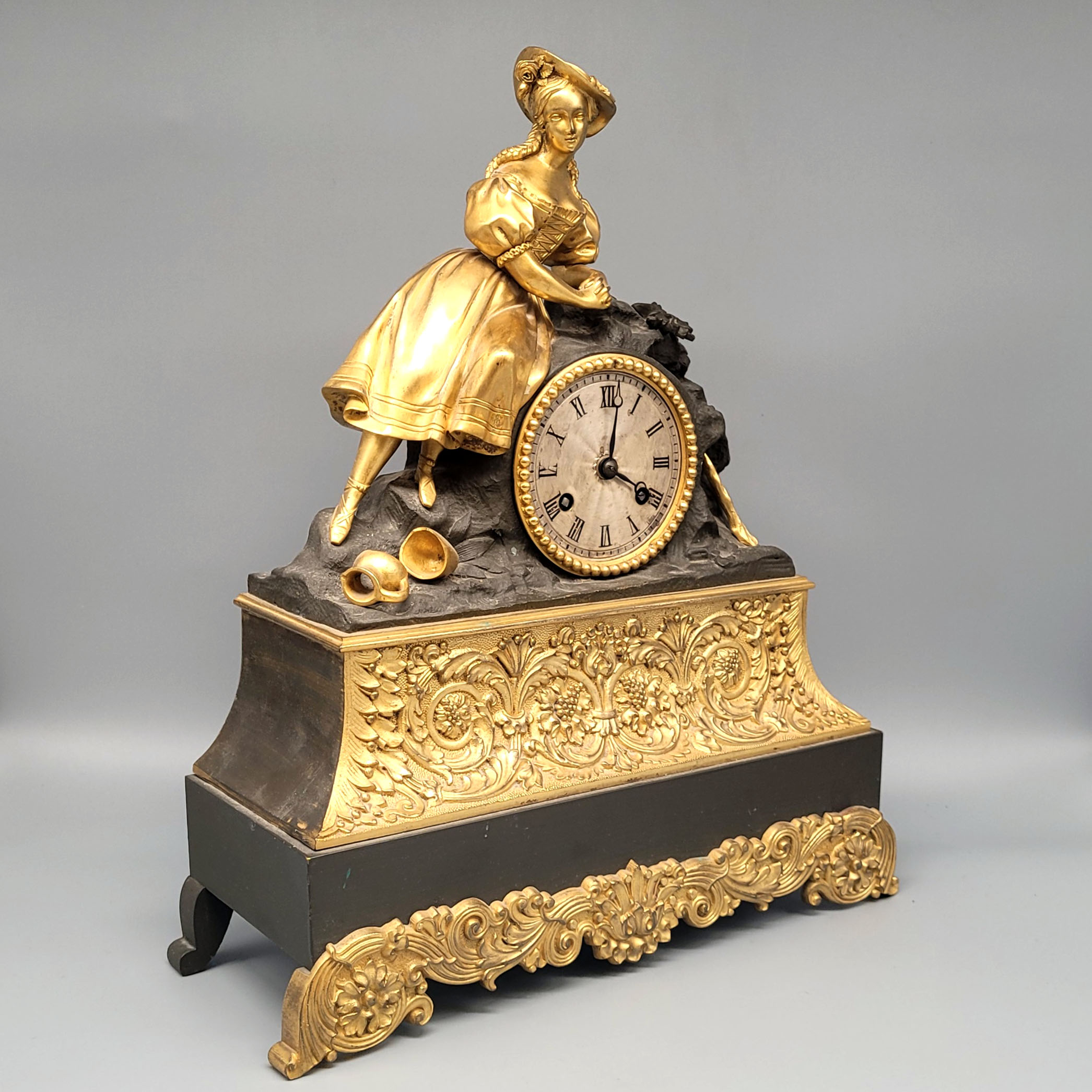 Bronze partiell vergoldet, Frau mit zerbrochenem Krug, silbernes Zifferblatt mit römischer Stundenanzeige, Pendelwerk mit Fadenaufhängung (Pendel fehlt), bezeichnet auf der Platine „Dehuc à Paris“, Frankreich Mitte 19. Jahrhundert, Höhe 37 cm (Uhrwerk läuft nicht an)