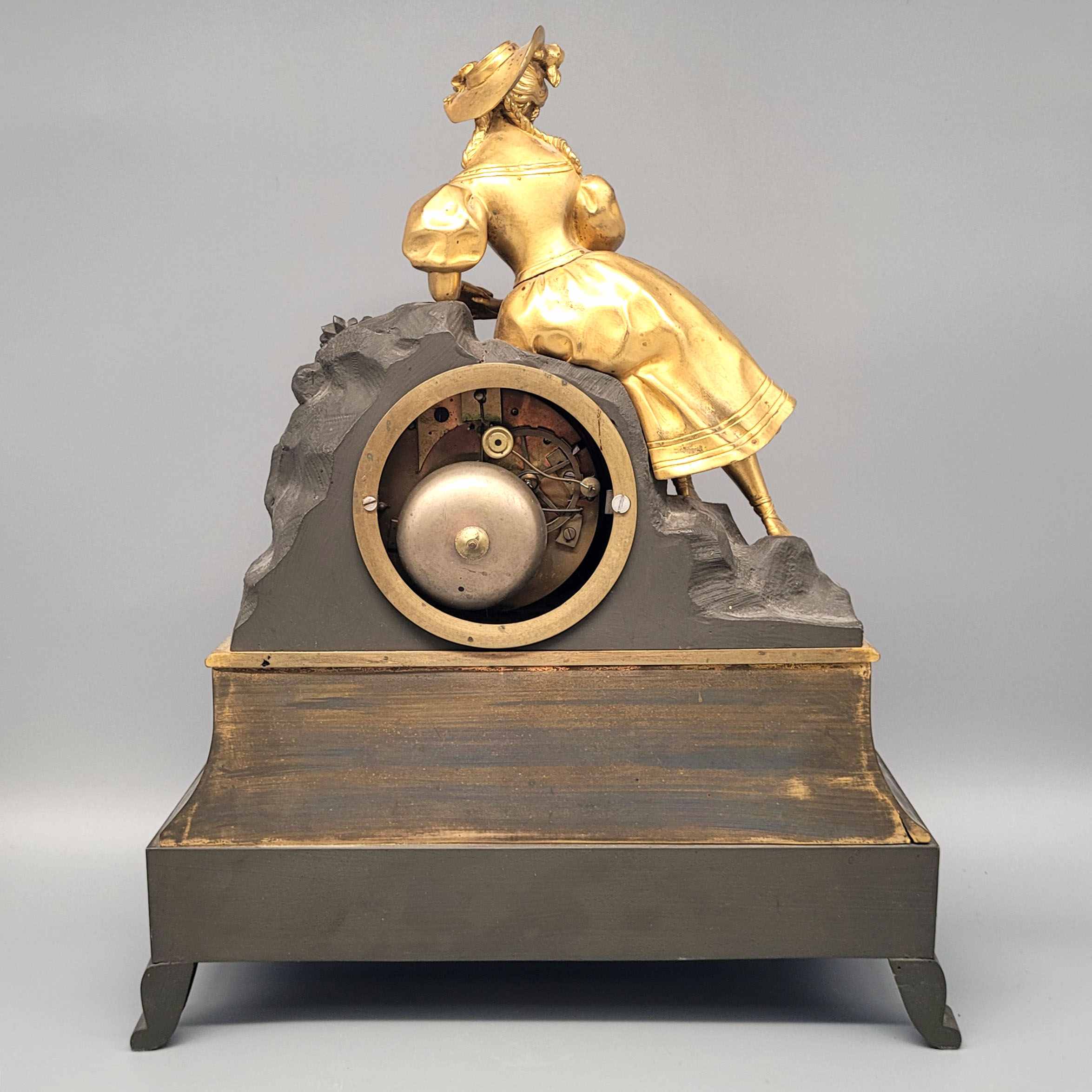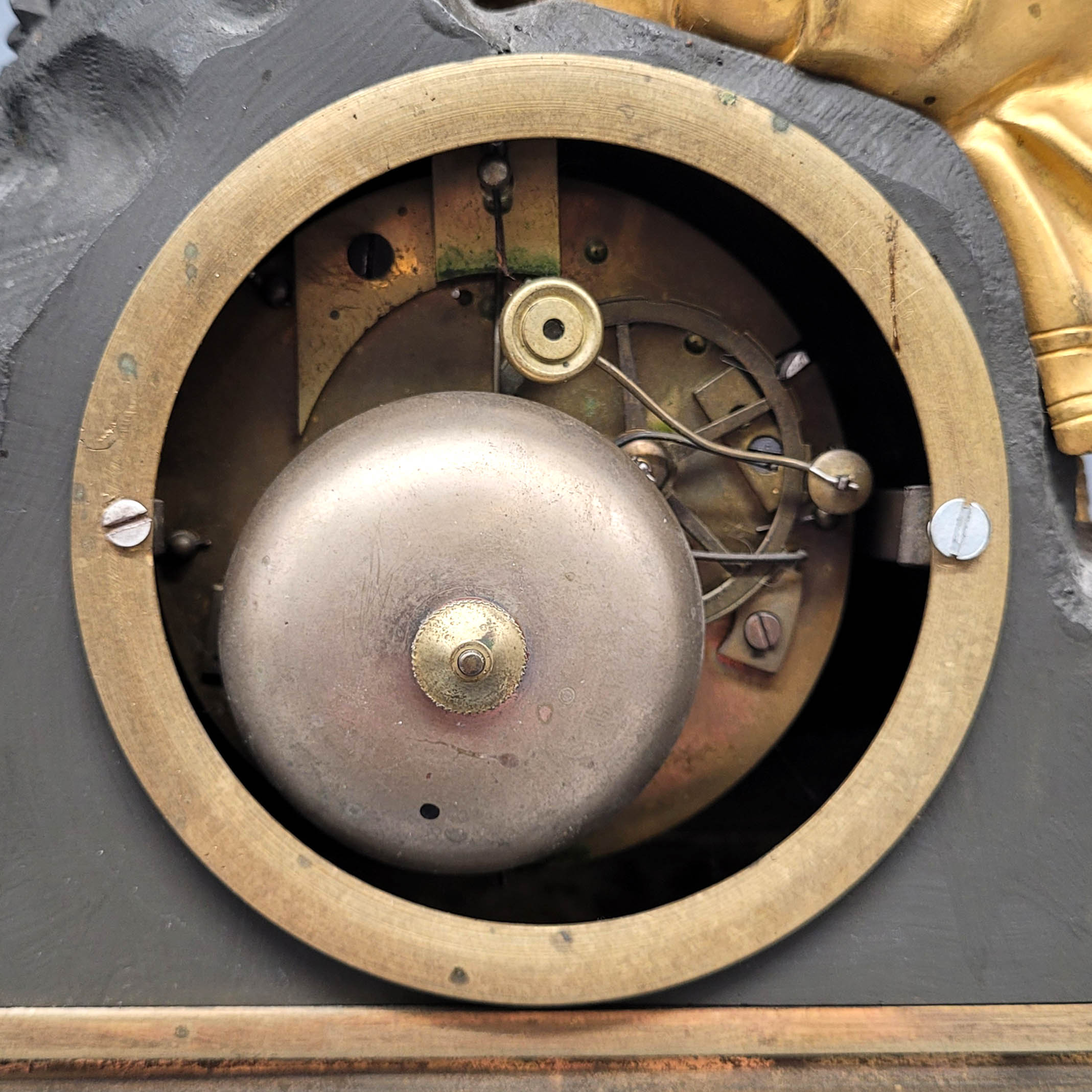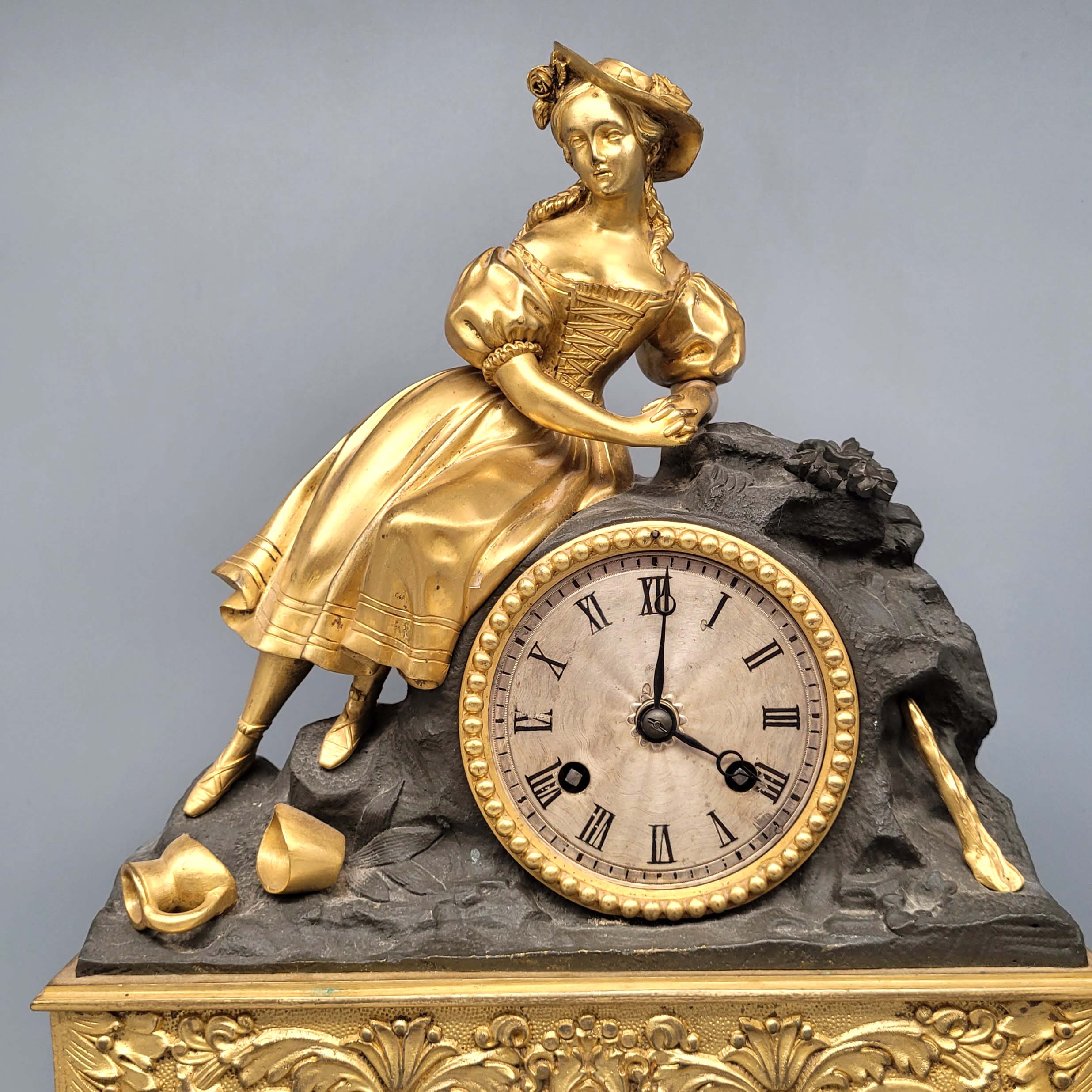 Bronze partiell vergoldet, Frau mit zerbrochenem Krug, silbernes Zifferblatt mit römischer Stundenanzeige, Pendelwerk mit Fadenaufhängung (Pendel fehlt), bezeichnet auf der Platine „Dehuc à Paris“, Frankreich Mitte 19. Jahrhundert, Höhe 37 cm (Uhrwerk läuft nicht an)