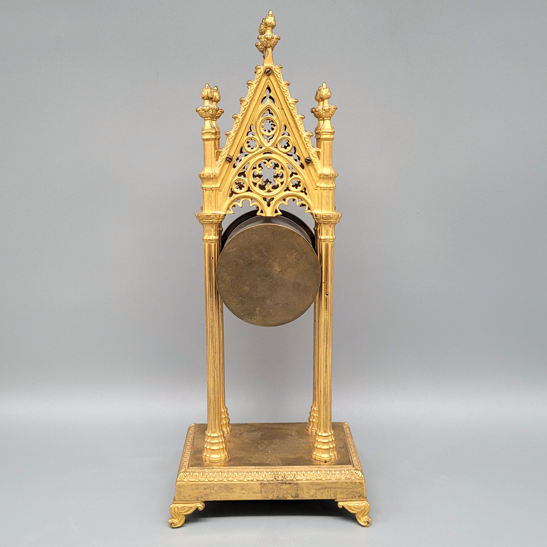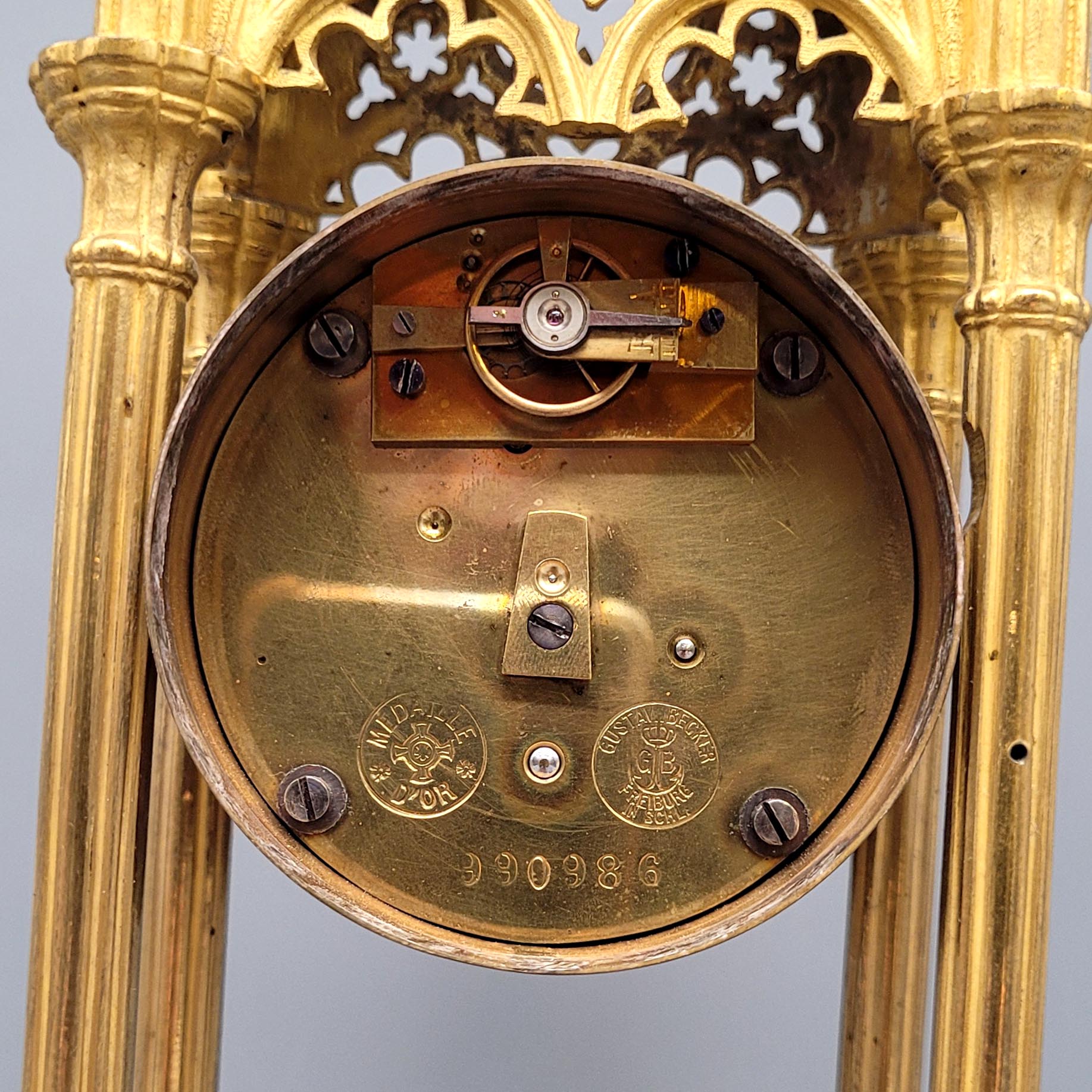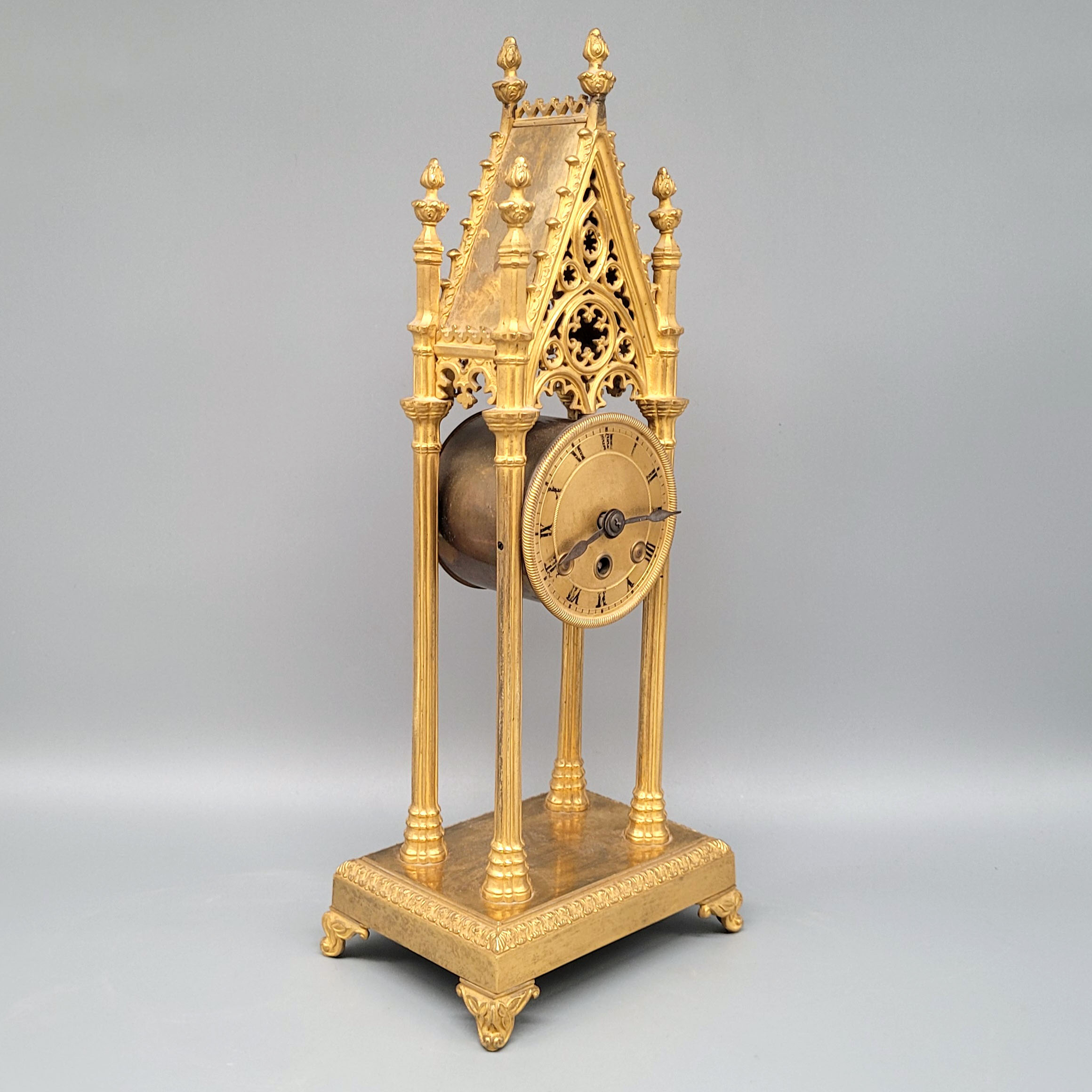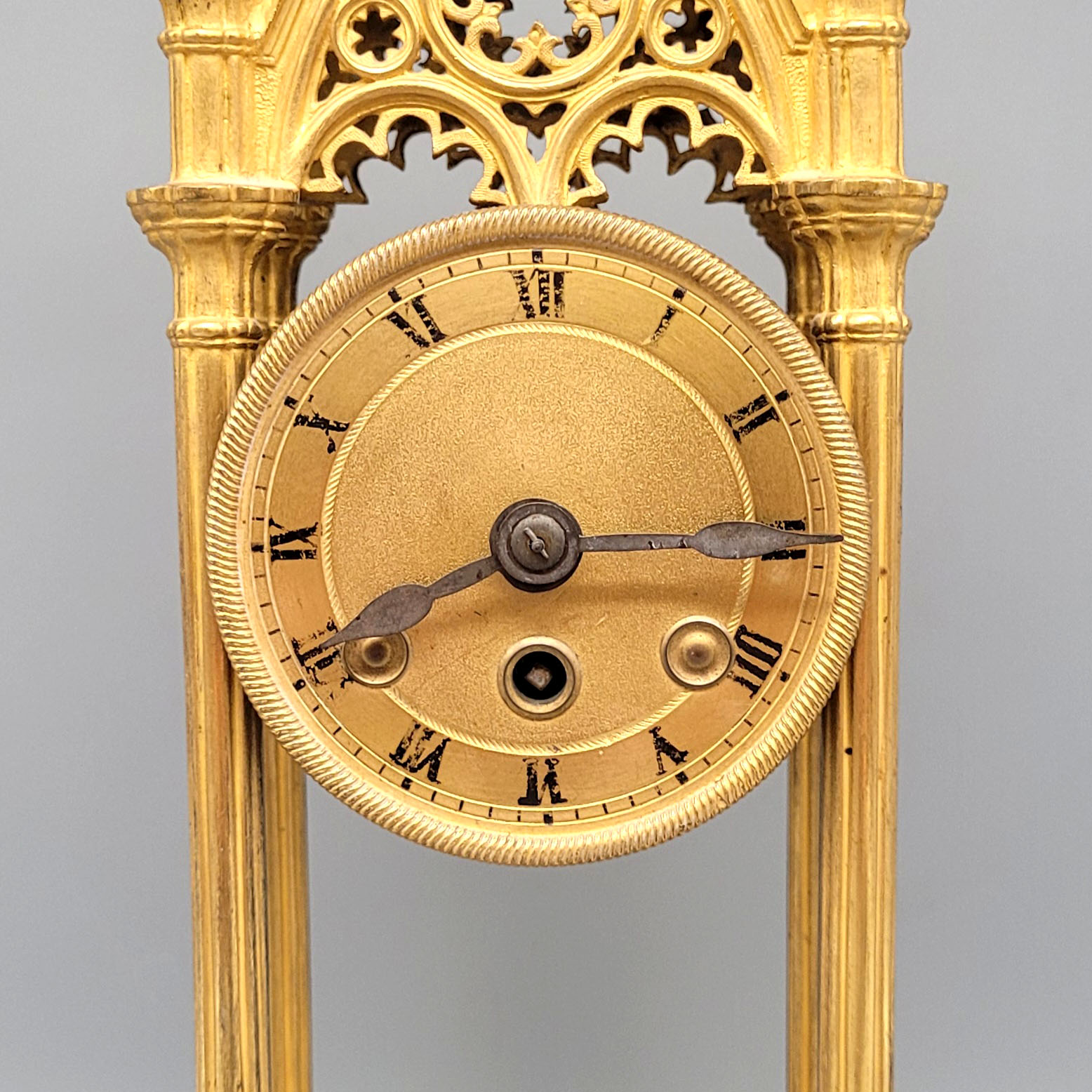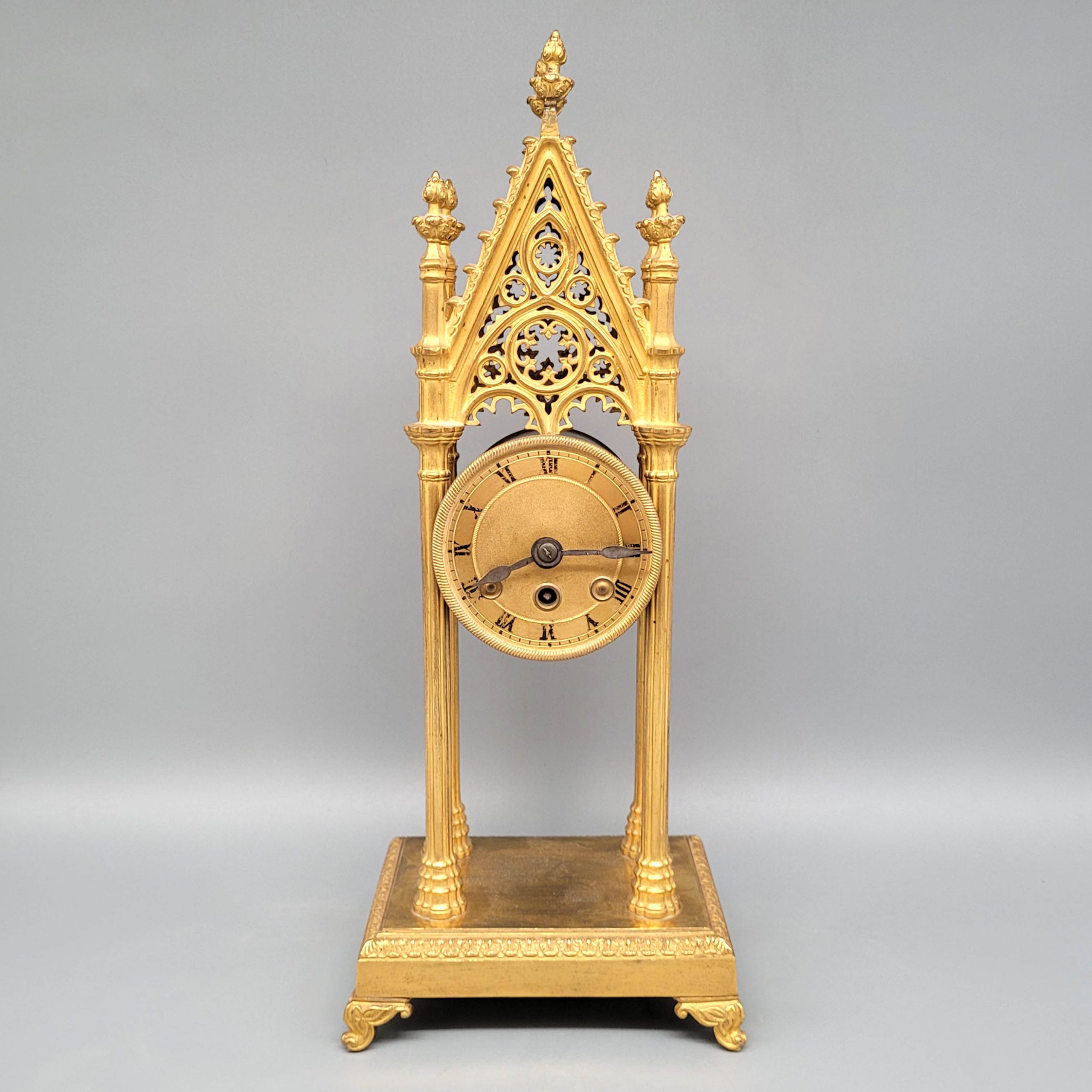 Portaluhr im neogotischen StilBronze, vergoldet, Zifferblatt mit römischer Stundenanzeige und Minutenbalken, Uhrwerk „Gustav Becker, Freiburg“, Deutsch 19. Jahrhundert, Höhe 34 cm
