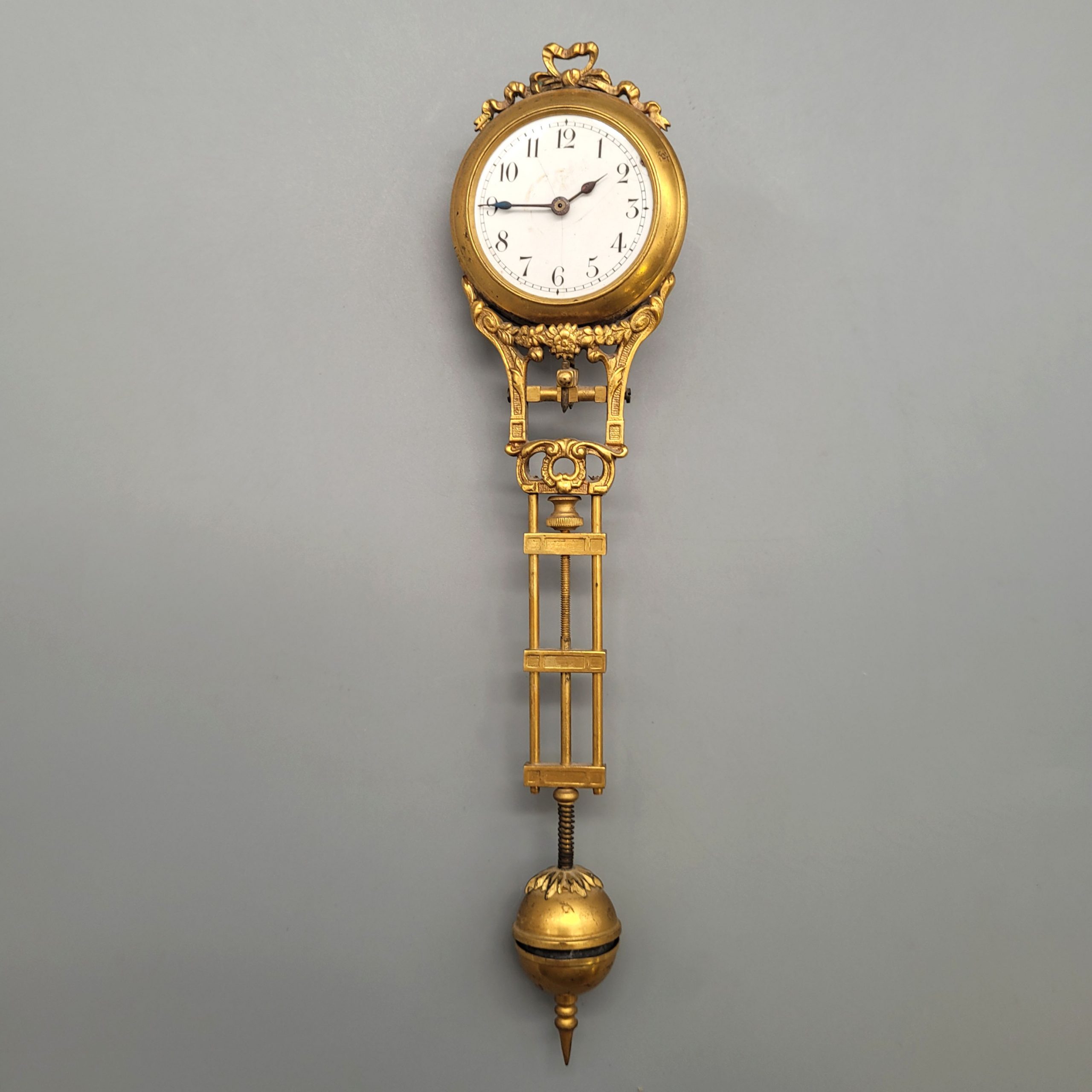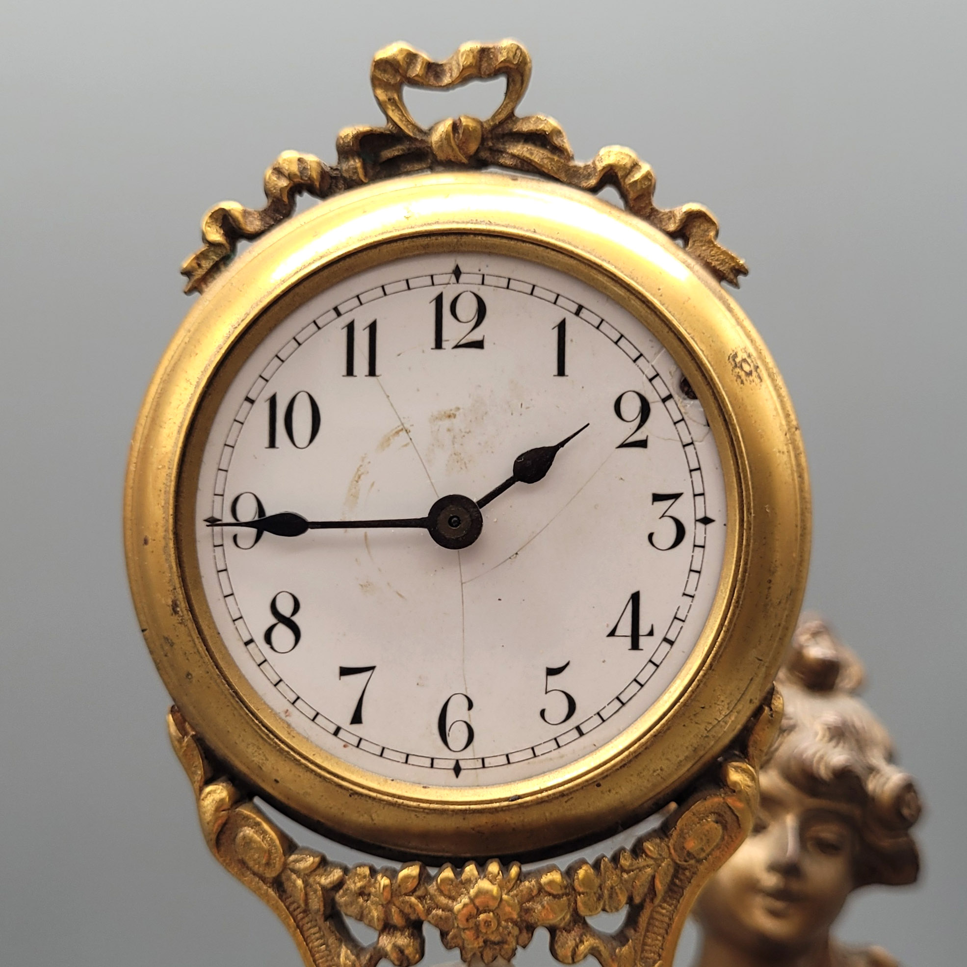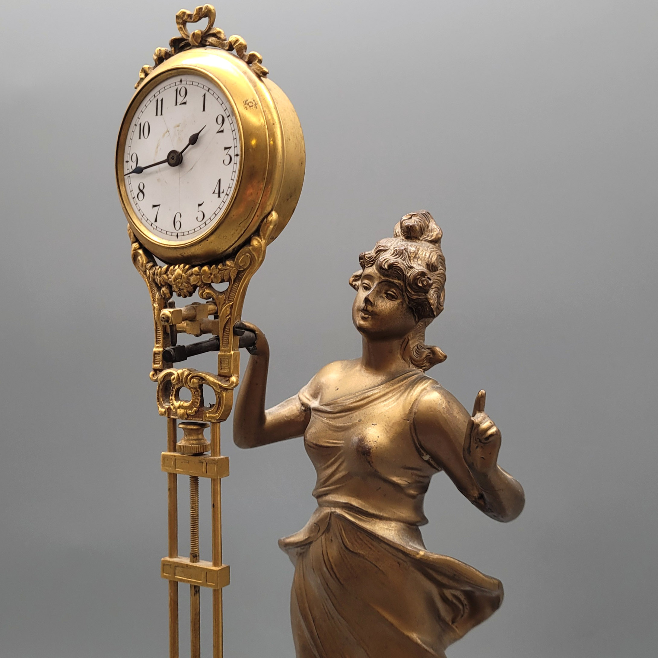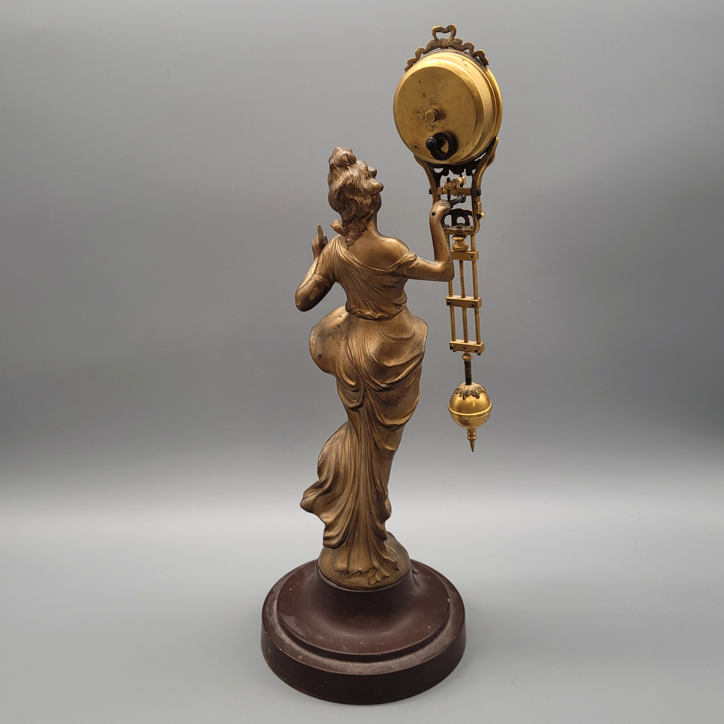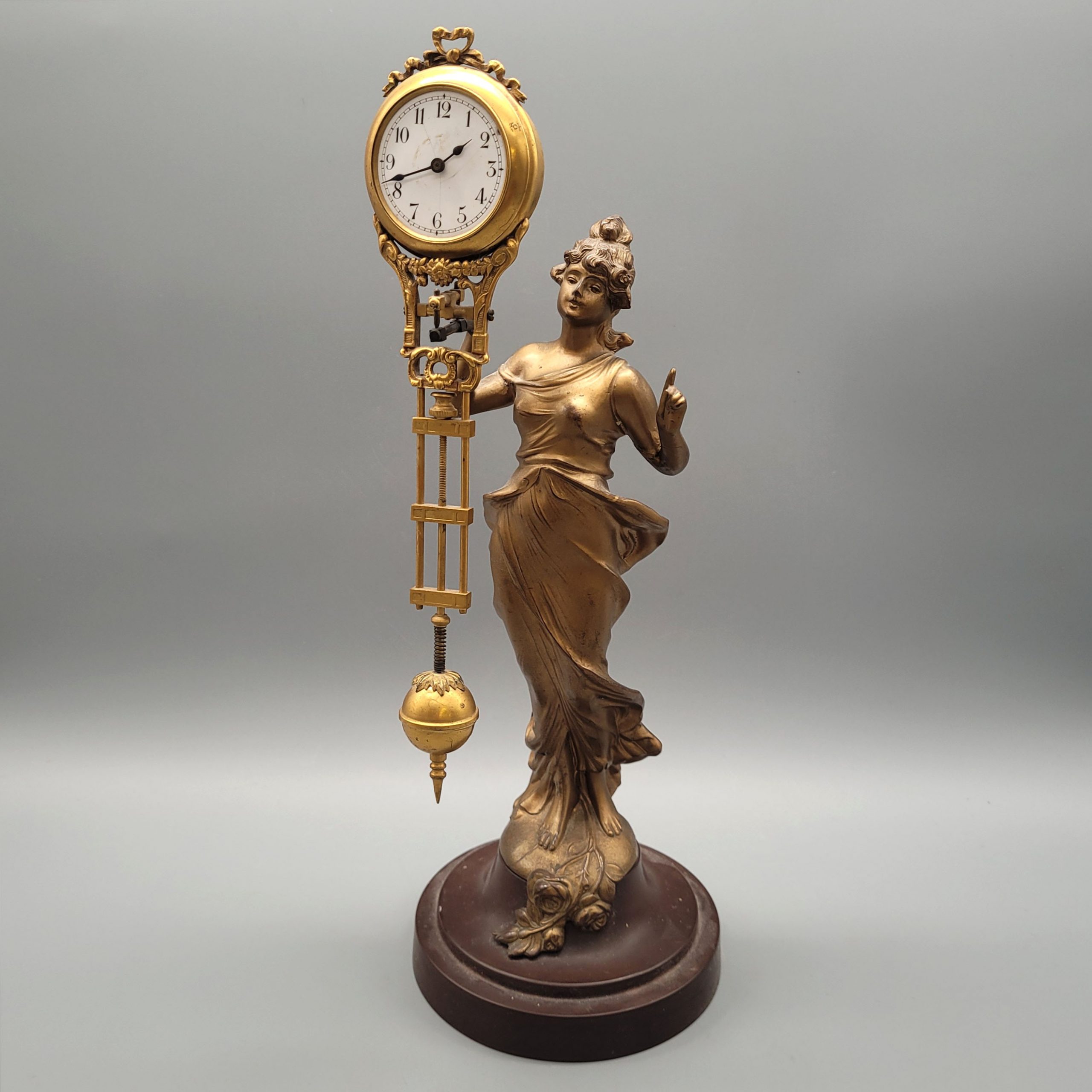 stehende weibliche Metallgußfigur (ein Arm alt restauriert), bronziert, Holzsockel, Federzugwerk, Kurzpendel, schwingendes vergoldetes Bronzegehäuse mit integriertem Pendel, Emaillezifferblatt mit arabischer Stundenanzeige und Minutenbalken, Deutschland, um 1900, Höhe 35 cm (Uhrwerk läuft an)