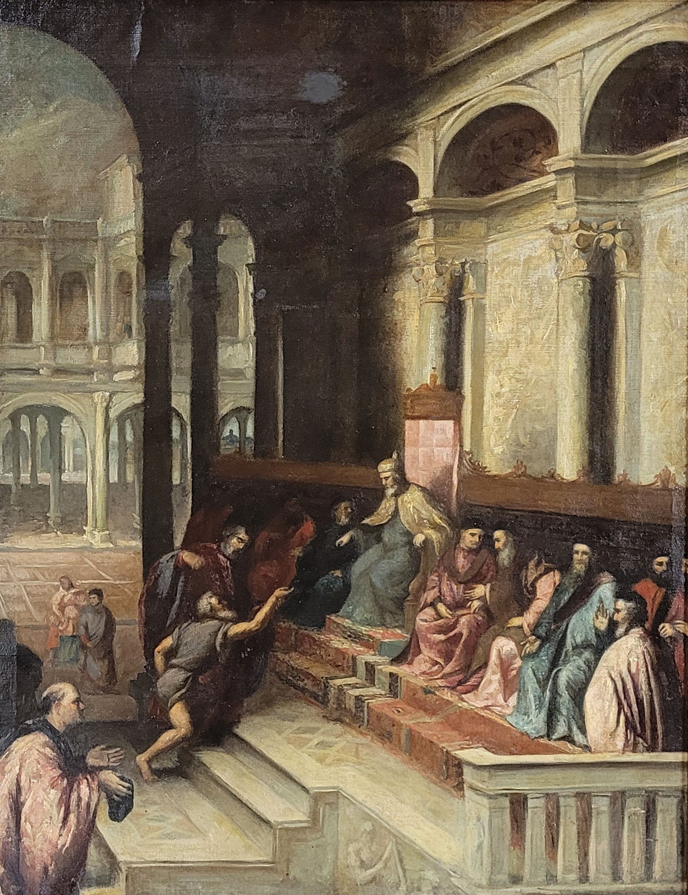 DEUTSCHER MEISTER (19. Jh.): Der Fischer überreicht dem Dogen den Ring des Hl. MarkusÖl auf Leinwand, verso bezeichnet, 78 x 60 cm, Rahmen (verso Leinwandkittung Kopie nach dem Gemälde in der Münchener Pinakothek von Paris Bordone [1500-1571])