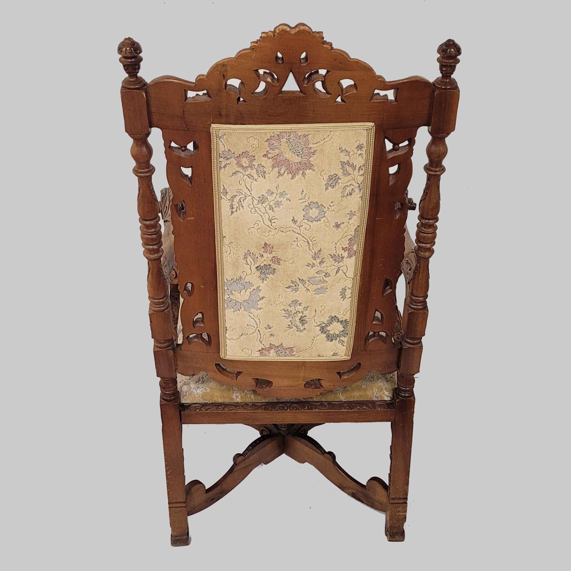 ArmlehnstuhlNussbaum, reich geschnitzt, ausgestellte Armlehnen, Füße verstrebt, moderner Stoffbezug, Deutsch 19. Jahrhundert, Höhe 128 cm, Sitzhöhe 44 cm