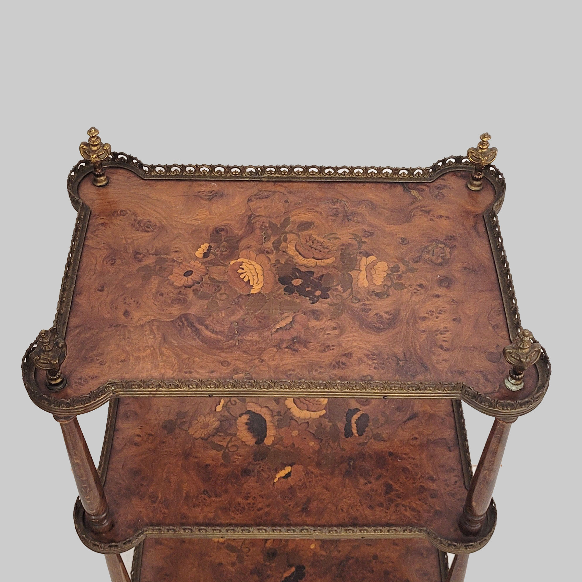 EtagereBeine, Nussbaum, 3 Etagen, Nusswurzel, Blumen-Einlagen in verschiedenen Obsthölzern, vergoldete Messinggalerien, Frankreich, um 1900, 80 x 43 x 30 cm