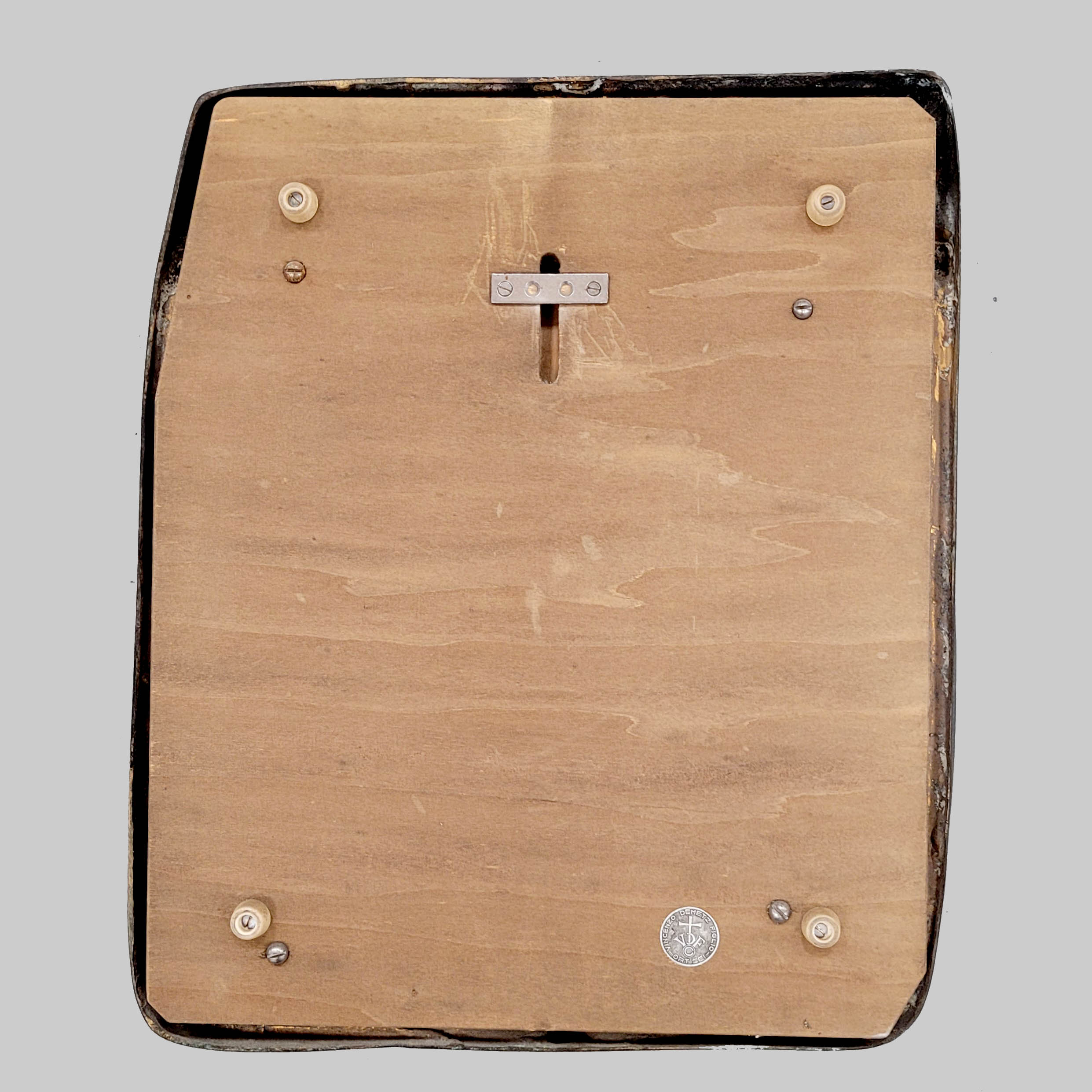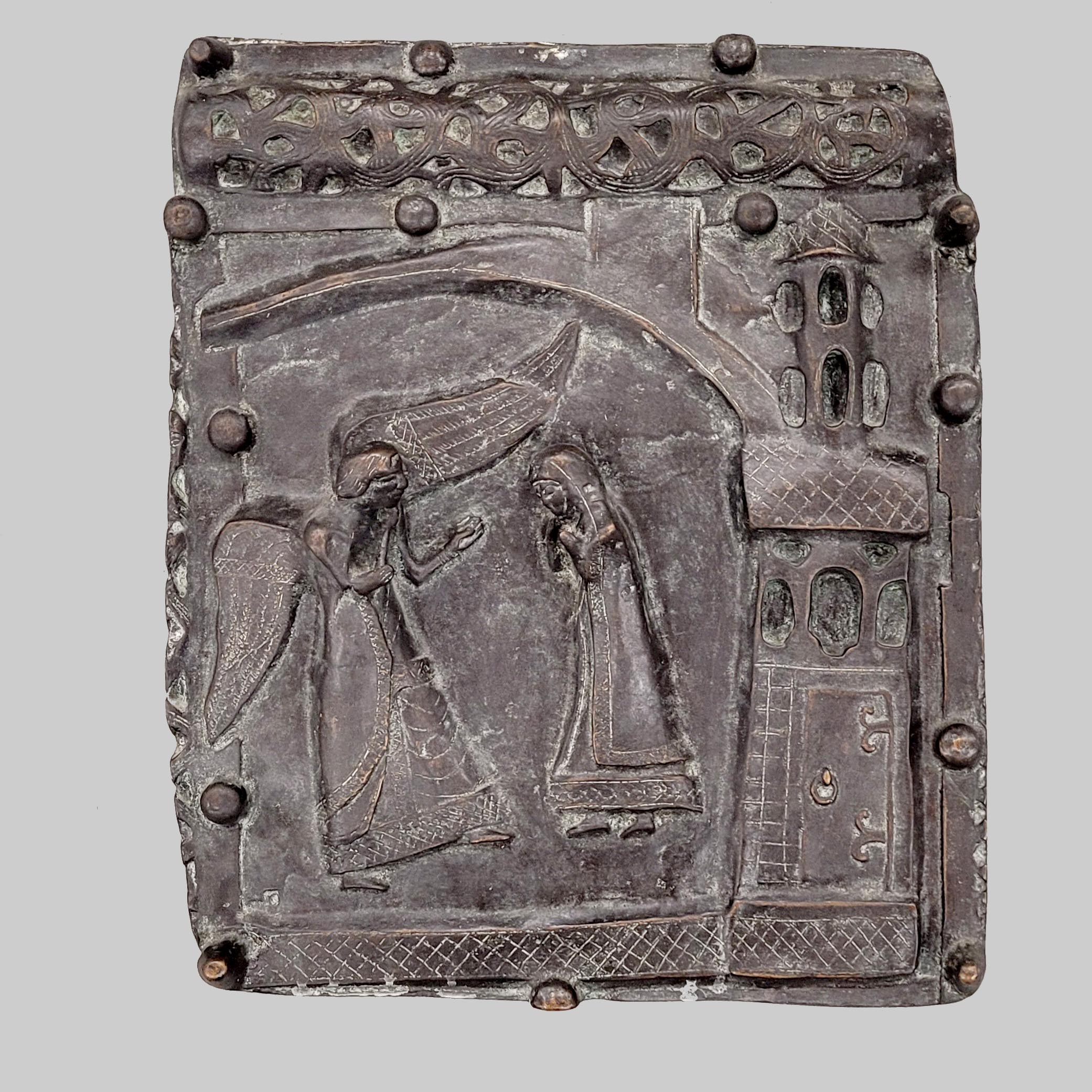 Verkündigung an MariaRelief, Bronze, Nachguss eines Feldes der Bronzetür der Basilika St. Zeno in Verona, montiert auf Holzbrett, dort Marke „Vincenzo Demetz figlio“, ca. 51 x 43 cm