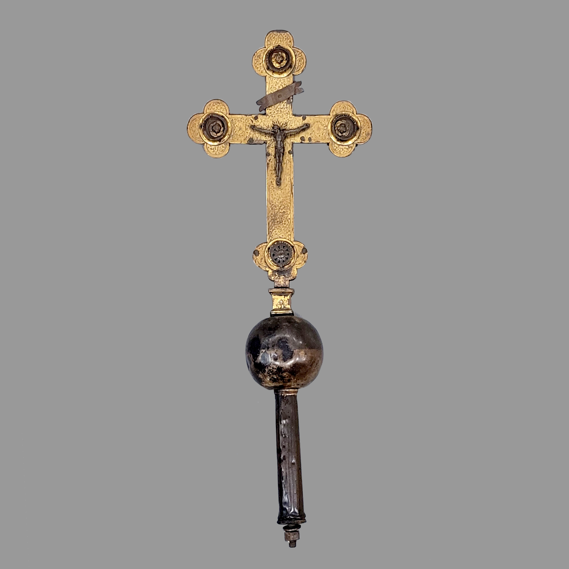 Bronze, vergoldet, punktierter floraler Dekor, runder Schaft, Kugelnodus, viereckige Tülle, Dreipassenden mit aufgesetztem Blütendekor, Corpus Bronze, massiv, (Höhe 8,5 cm), wohl Italien 16. Jahrhundert mit Ergänzungen des 17. / 18. Jahrhunderts, Gesamthöhe mit Schraubgewinde 76 cm