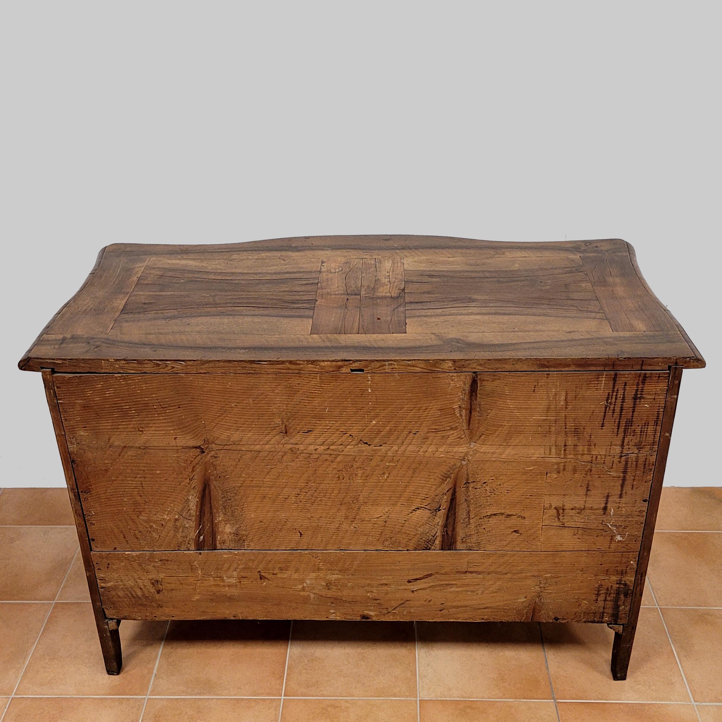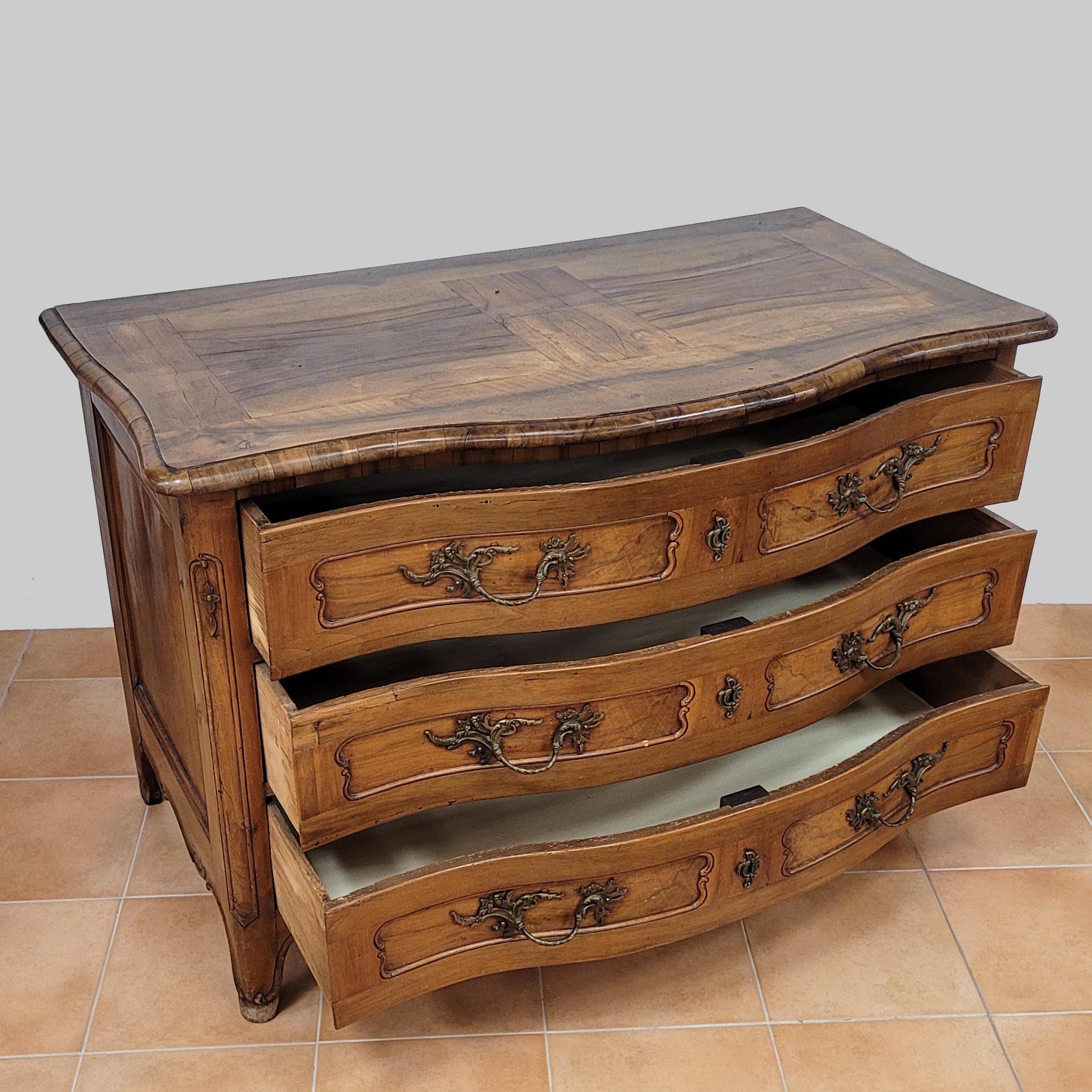 Dreischübige KommodeNussbaum, Nusswurzel auf Weichholz, geschwungene Front, gebogt gegliederte Zarge, abgerundete Ecken, alte Bronzebeschläge und Schlösser, Frankreich 18. Jahrhundert, 83 x 126 x 66 cm