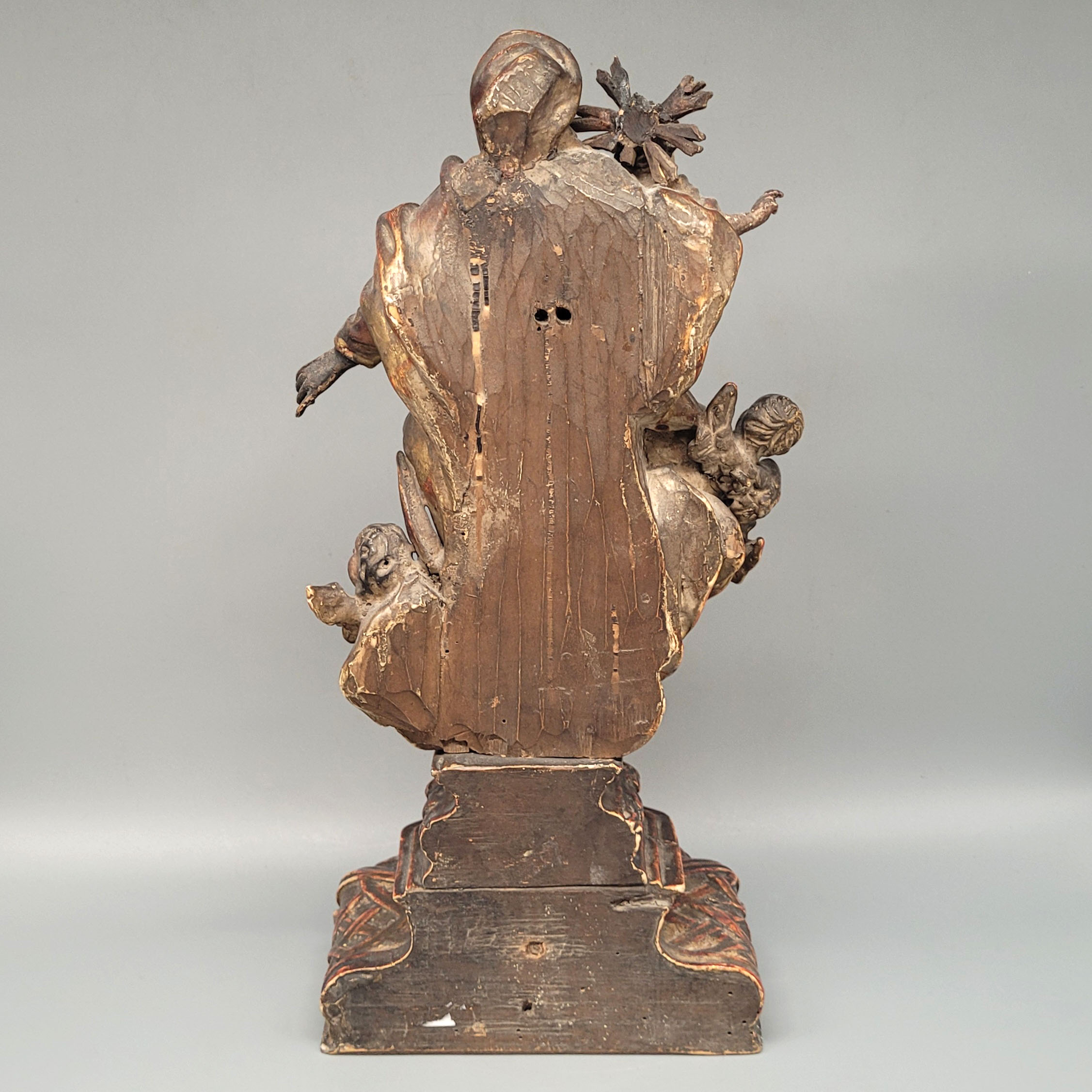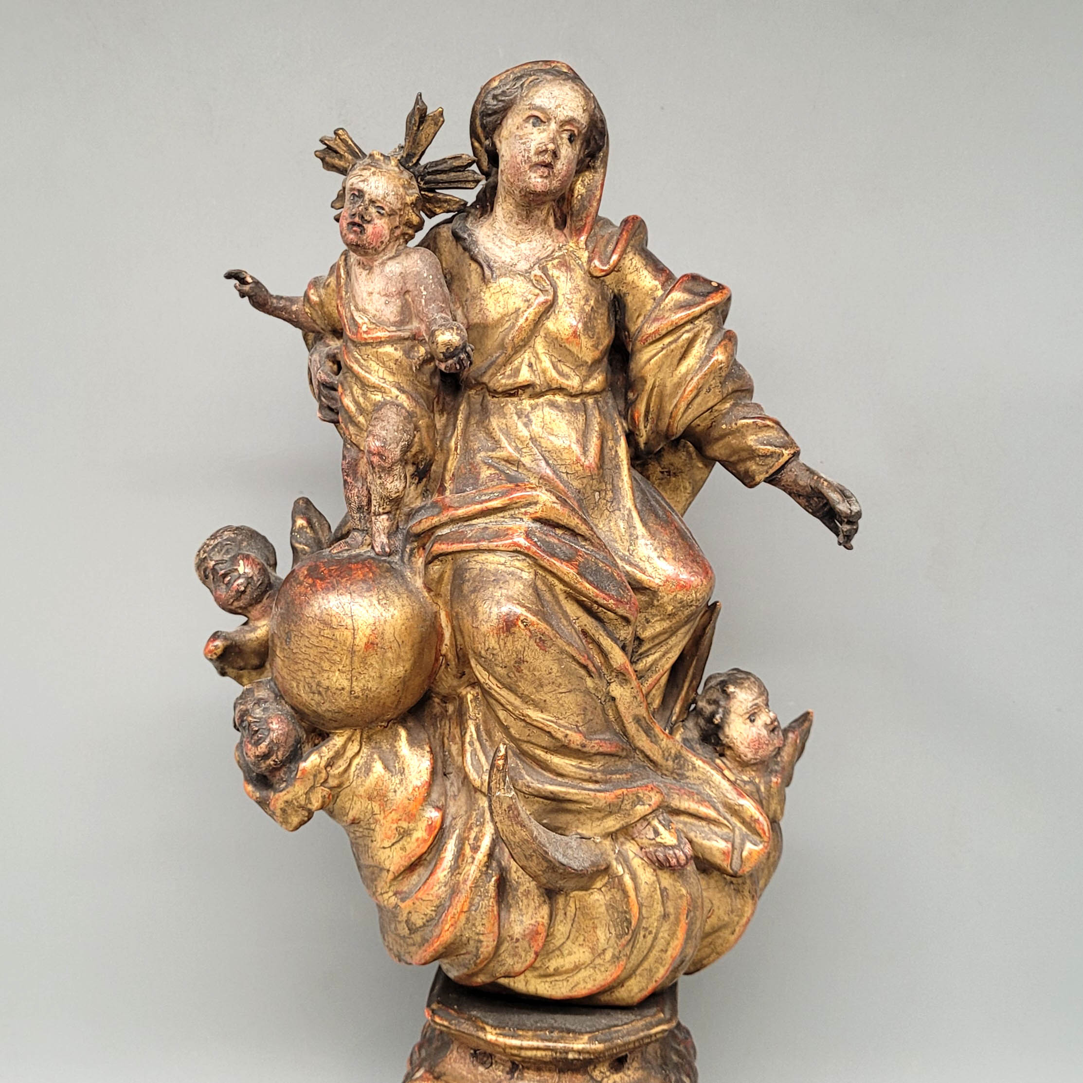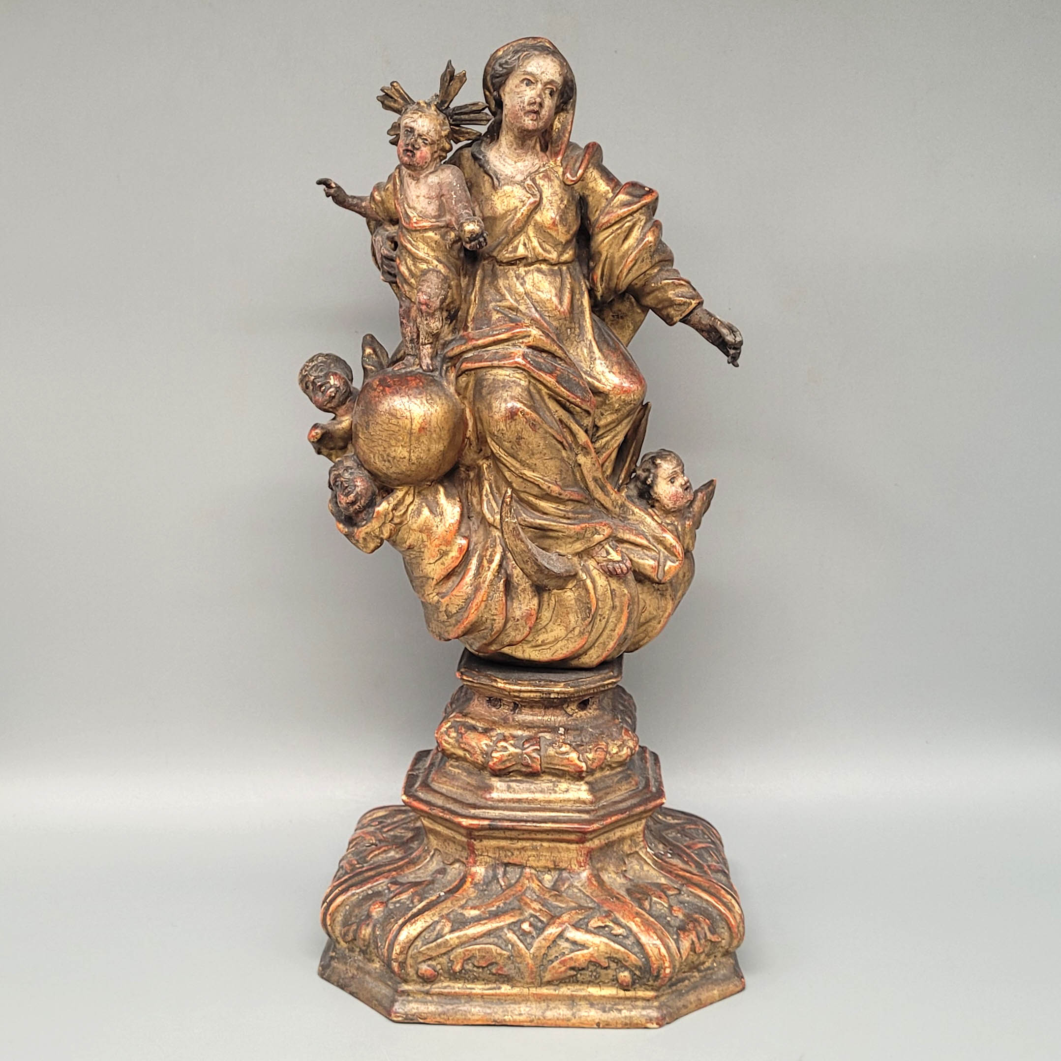 Holz, geschnitzt, originale Fassung und Vergoldung, hoher, wohl originaler Sockel, Oberitalien 18. Jahrhundert, Höhe 38 cm