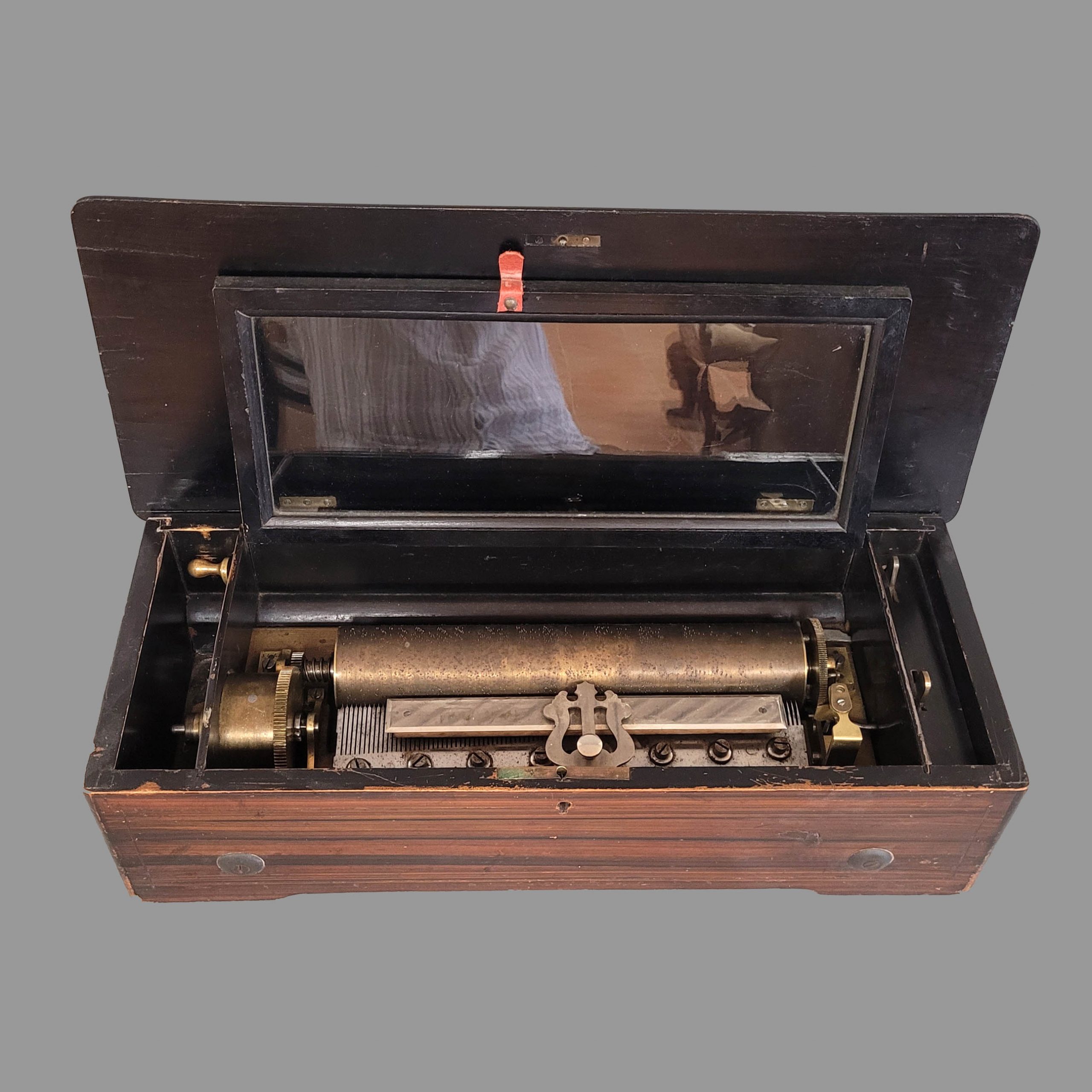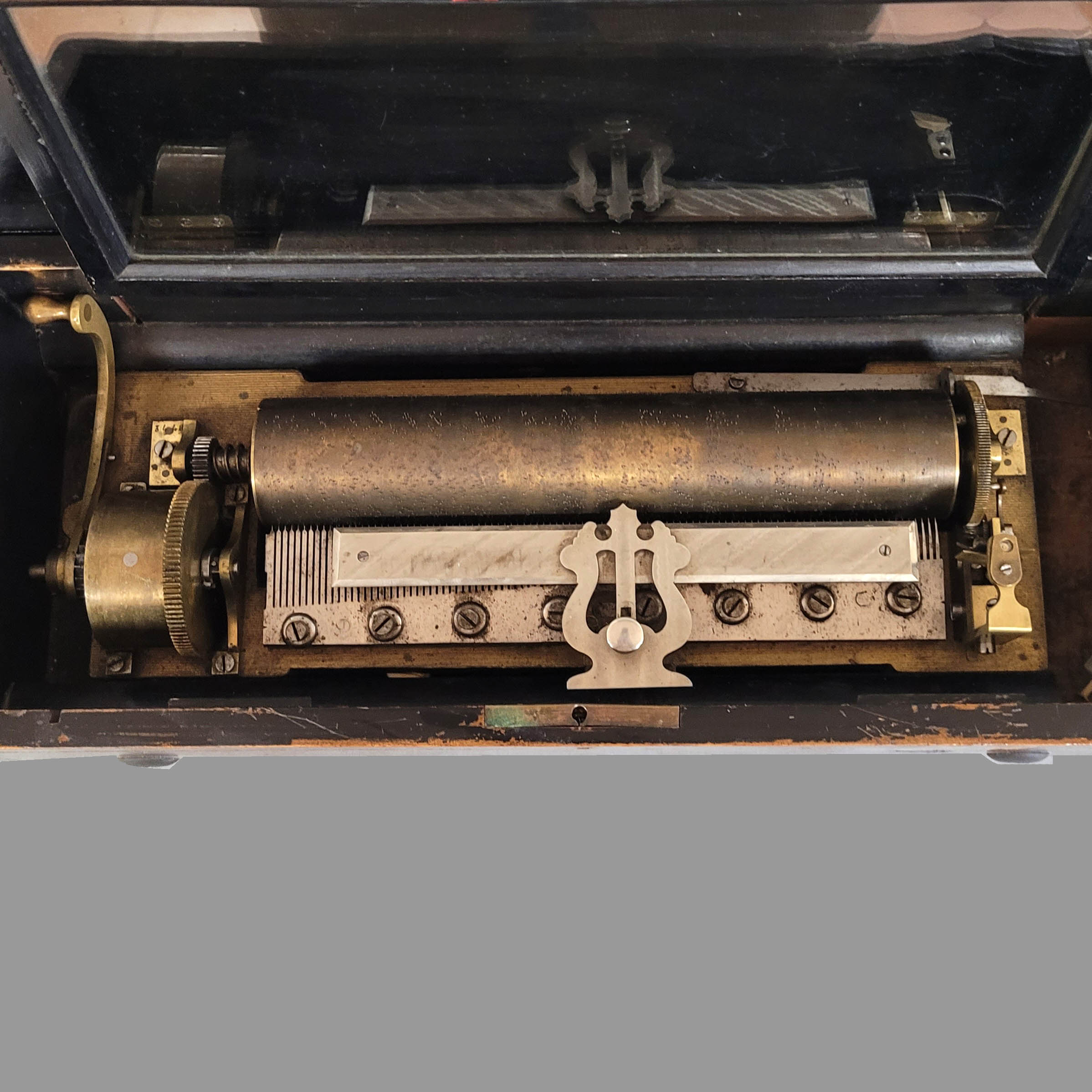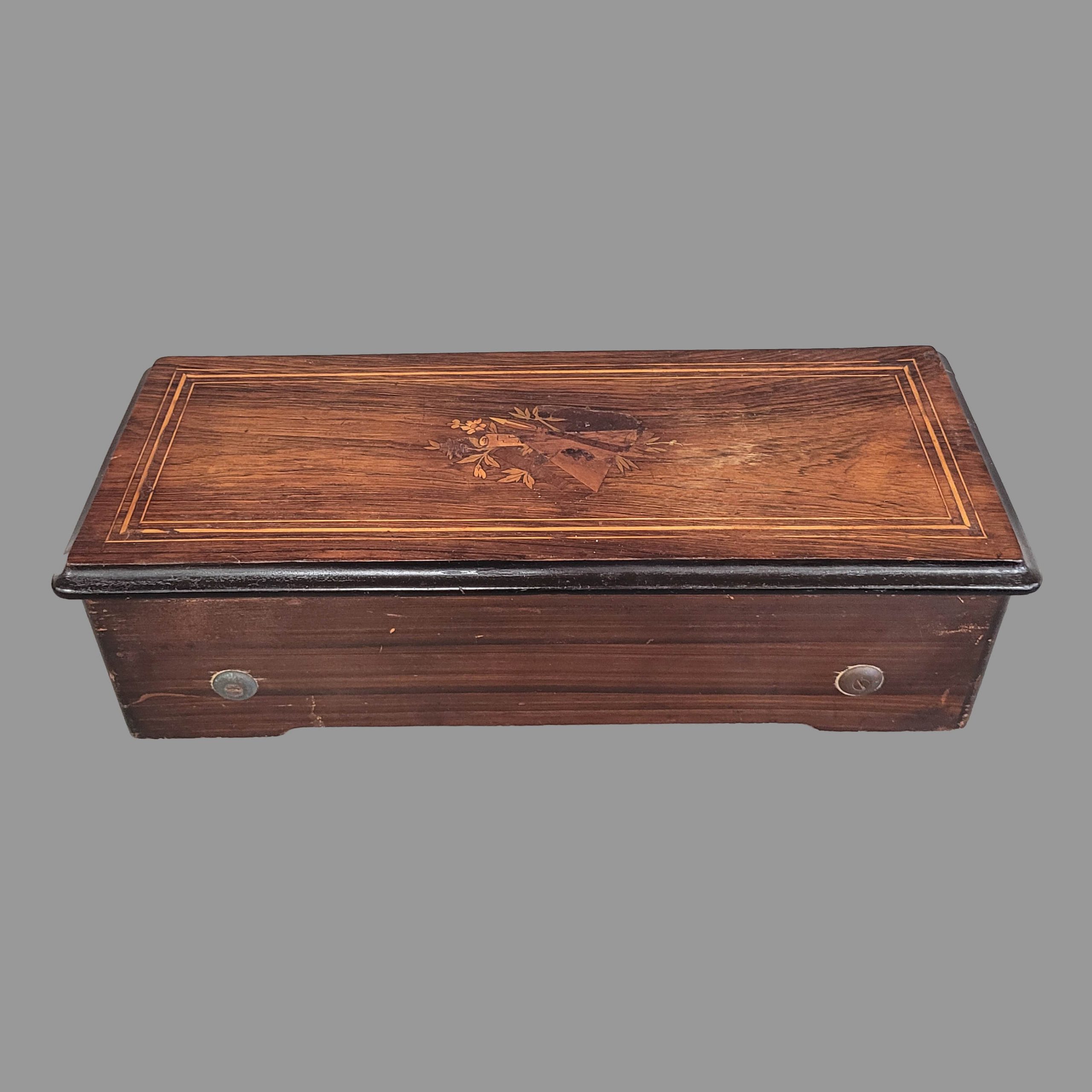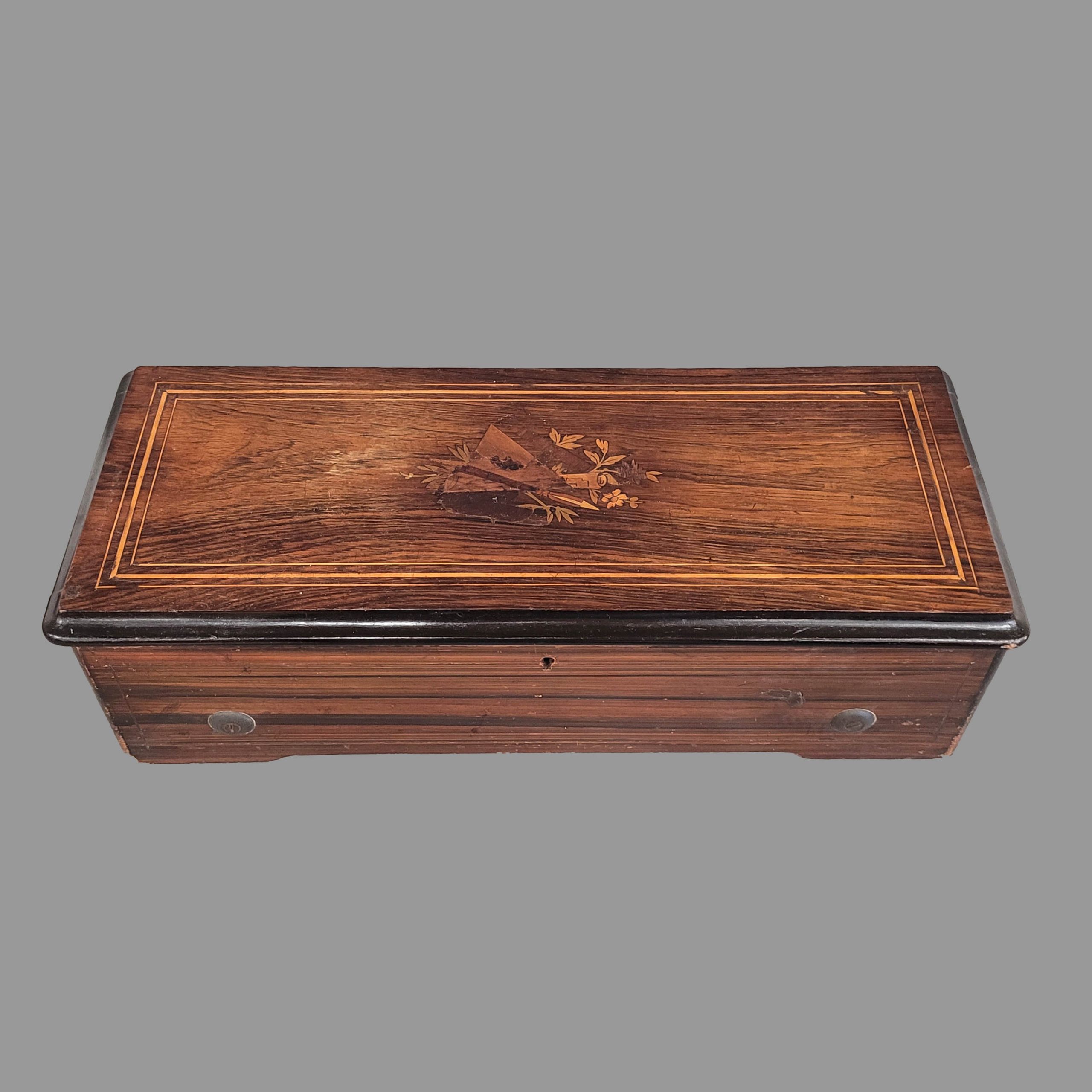 WalzenspieluhrGehäuse, Holz, Deckel intarsiert, innen schwarz lasiert, Walzenwerk unter Glasabdeckung, Ende 19. Jahrhundert, 14 x 51 x 18,5 cm (spielfähig)