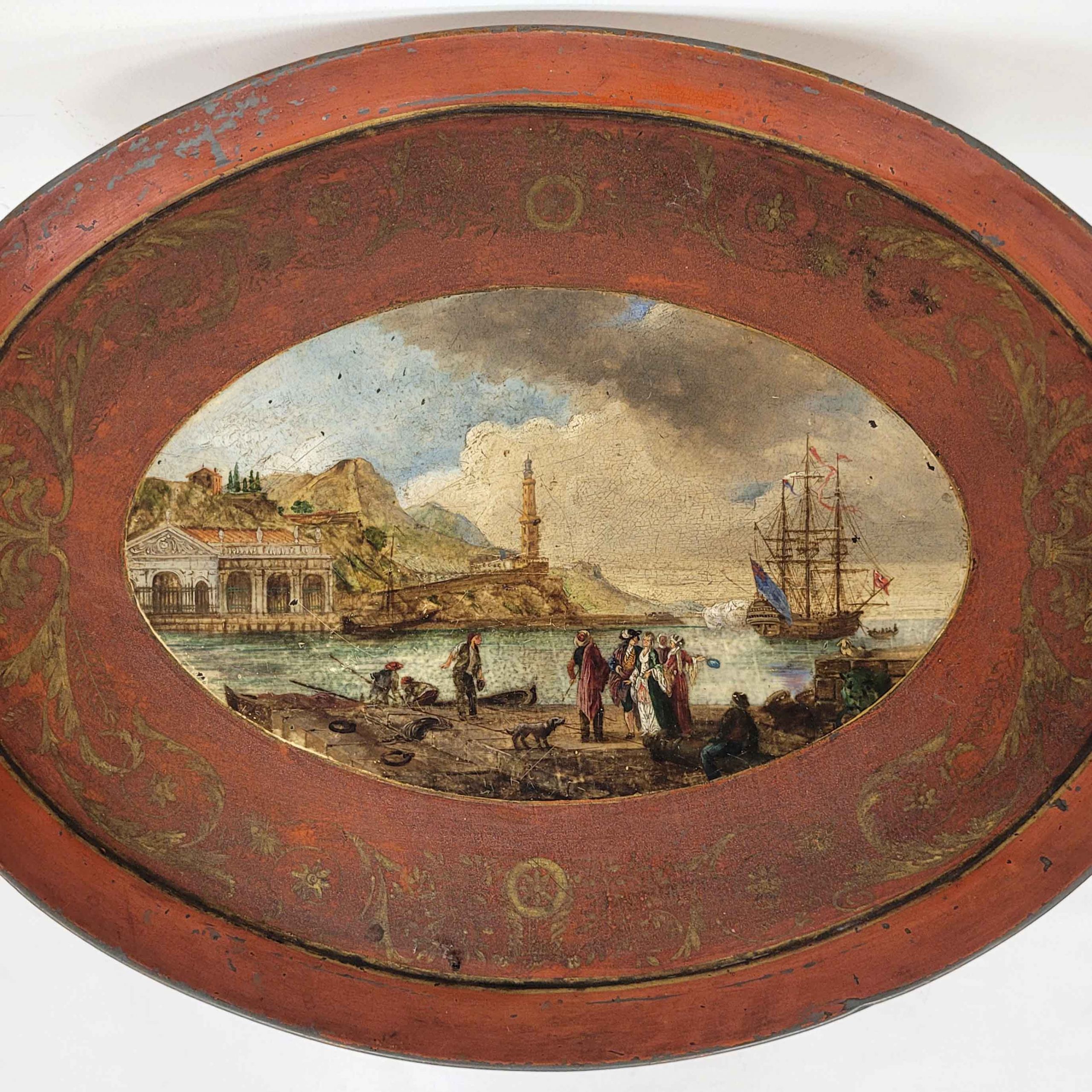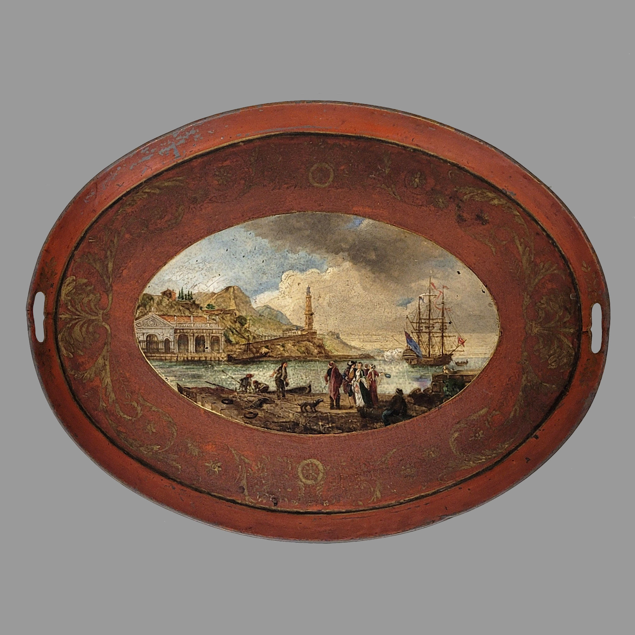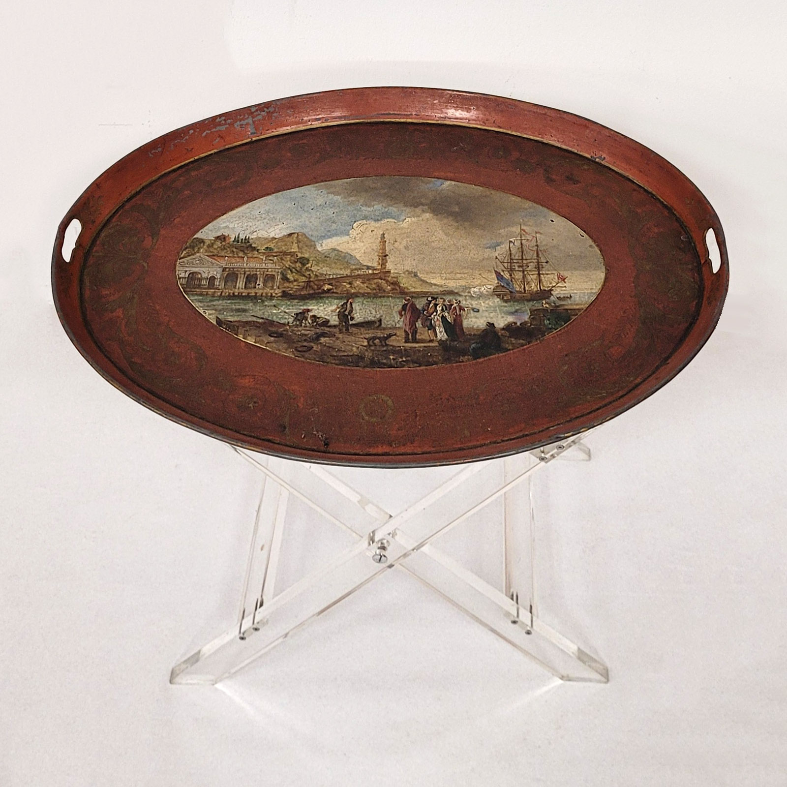 TablettEisenblech, bemalt, im Spiegel „Südländische Hafenszene“ in polychromer Malerei, Rankenmalerei in Gold auf rotem Grund, England 19. Jahrhundert, 3 x 72 x 55 cm, mit Tischböcken aus Plexiglas, Tablett-Tisch Höhe 54 cm