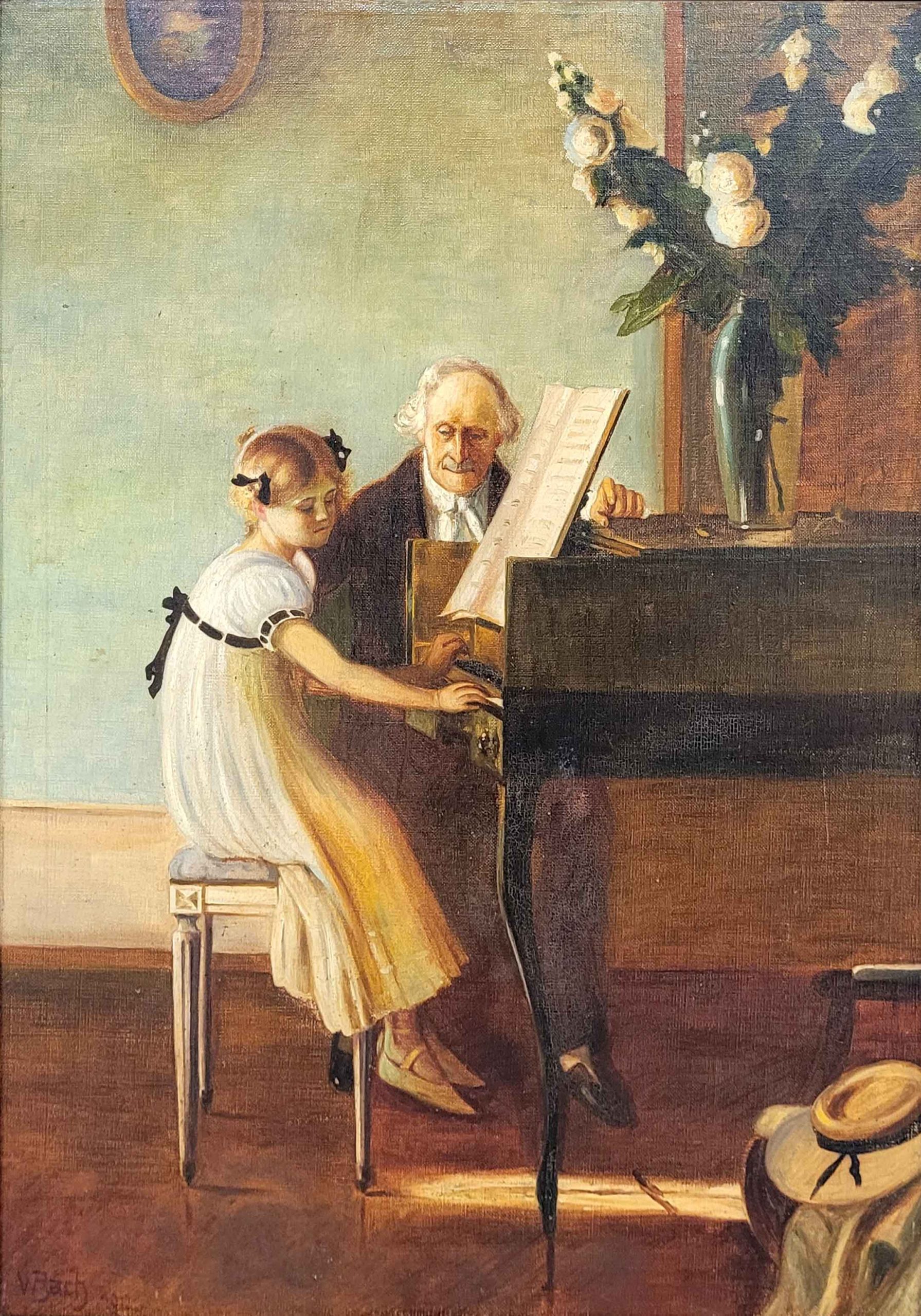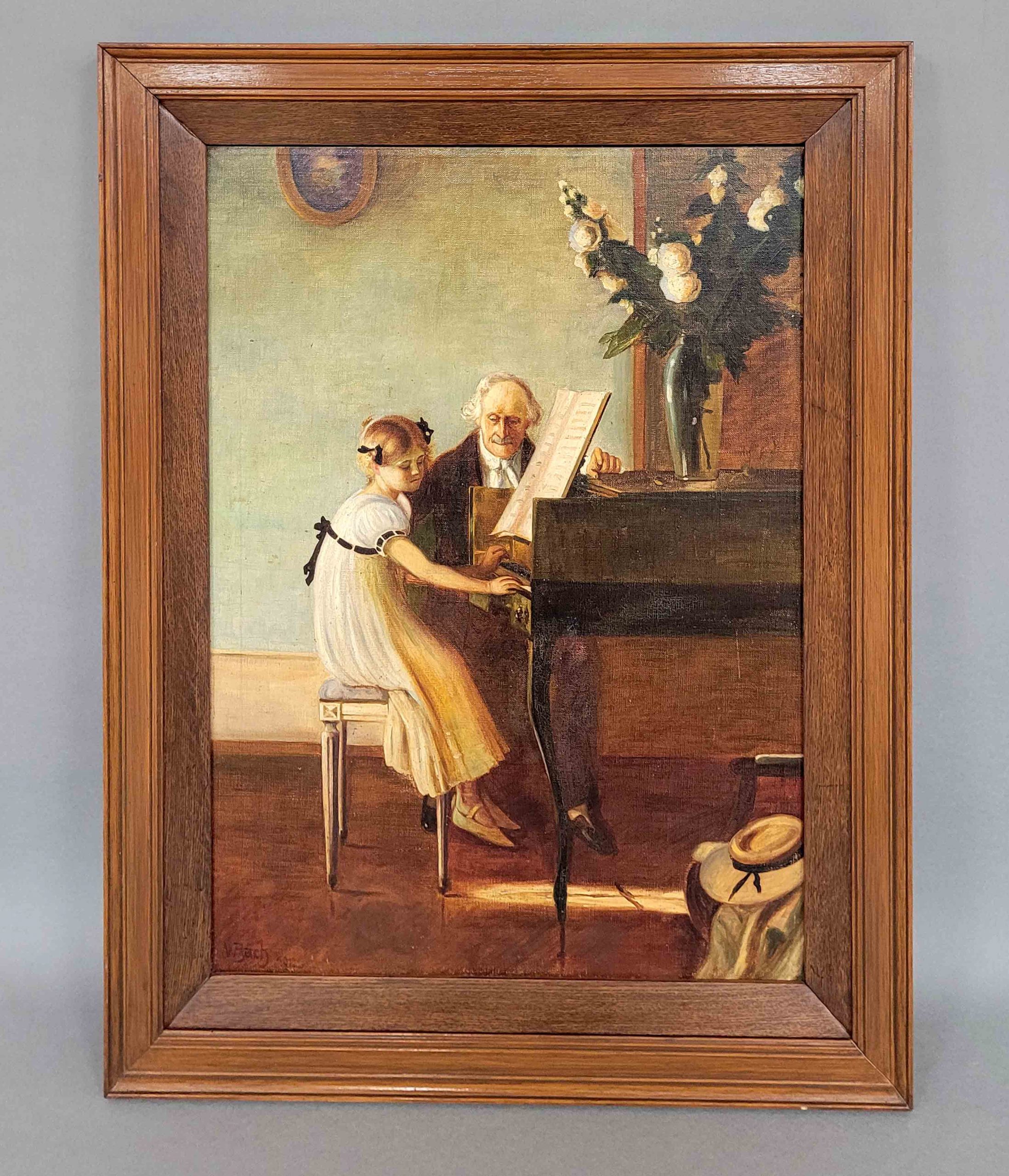 BACH, W. (tätig um 1900): KlavierstundeÖl auf Leinwand, auf Holz gezogen, signiert und datiert 1912 unten links, 64,5 x 46 cm, Rahmen