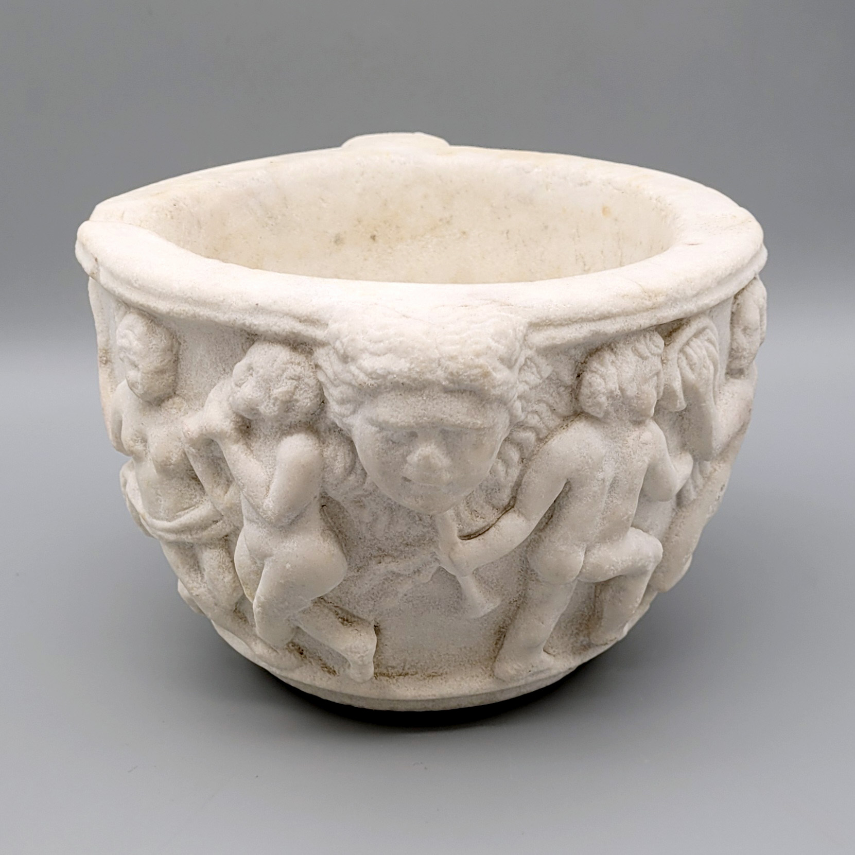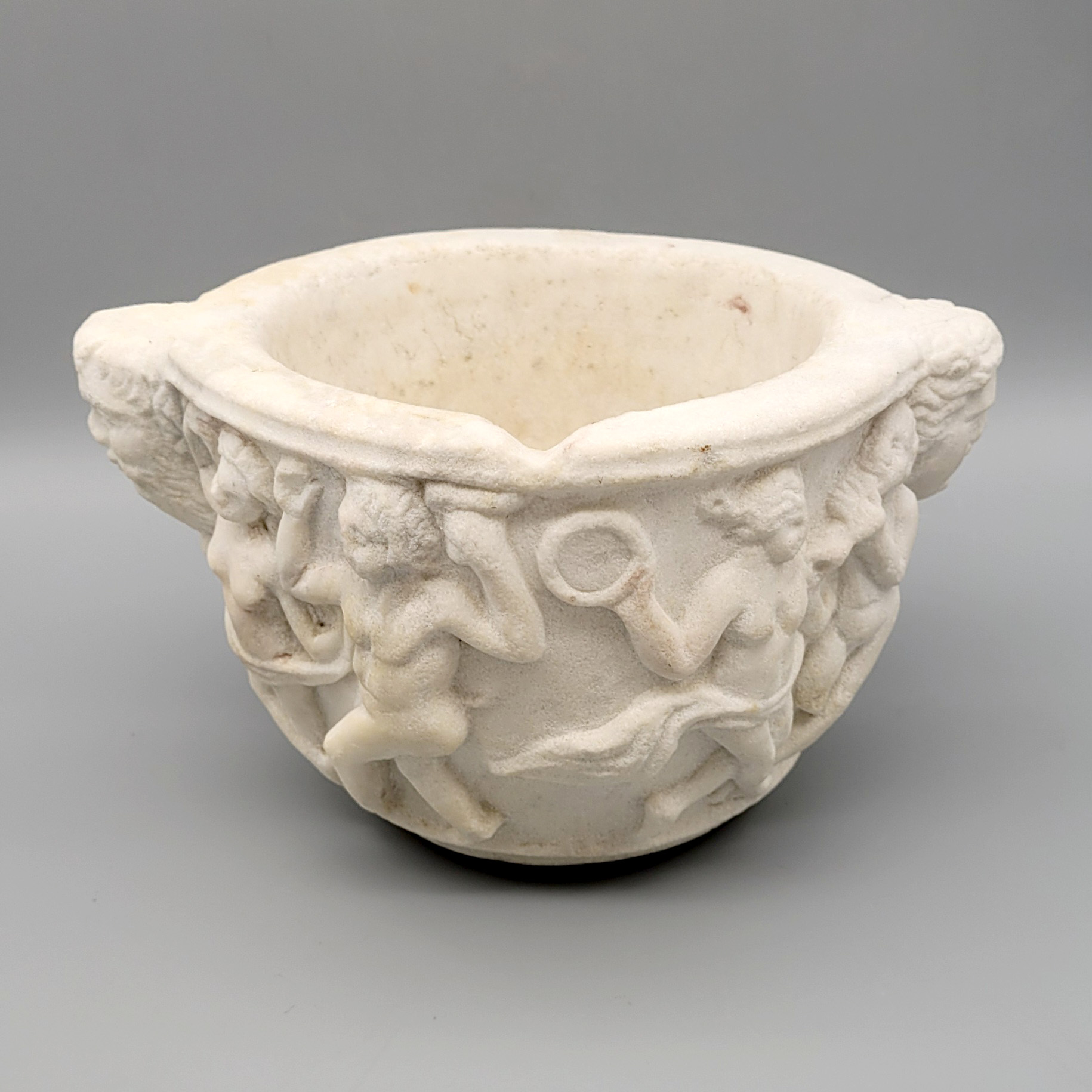 MörserCarrara-Marmor, Handhaben in Form von Köpfen, Wandung erhabener Reliefdekor mit Bachchantenzug, Italien 16. Jahrhundert, Höhe 12,5 cm, Durchmesser 22 cm