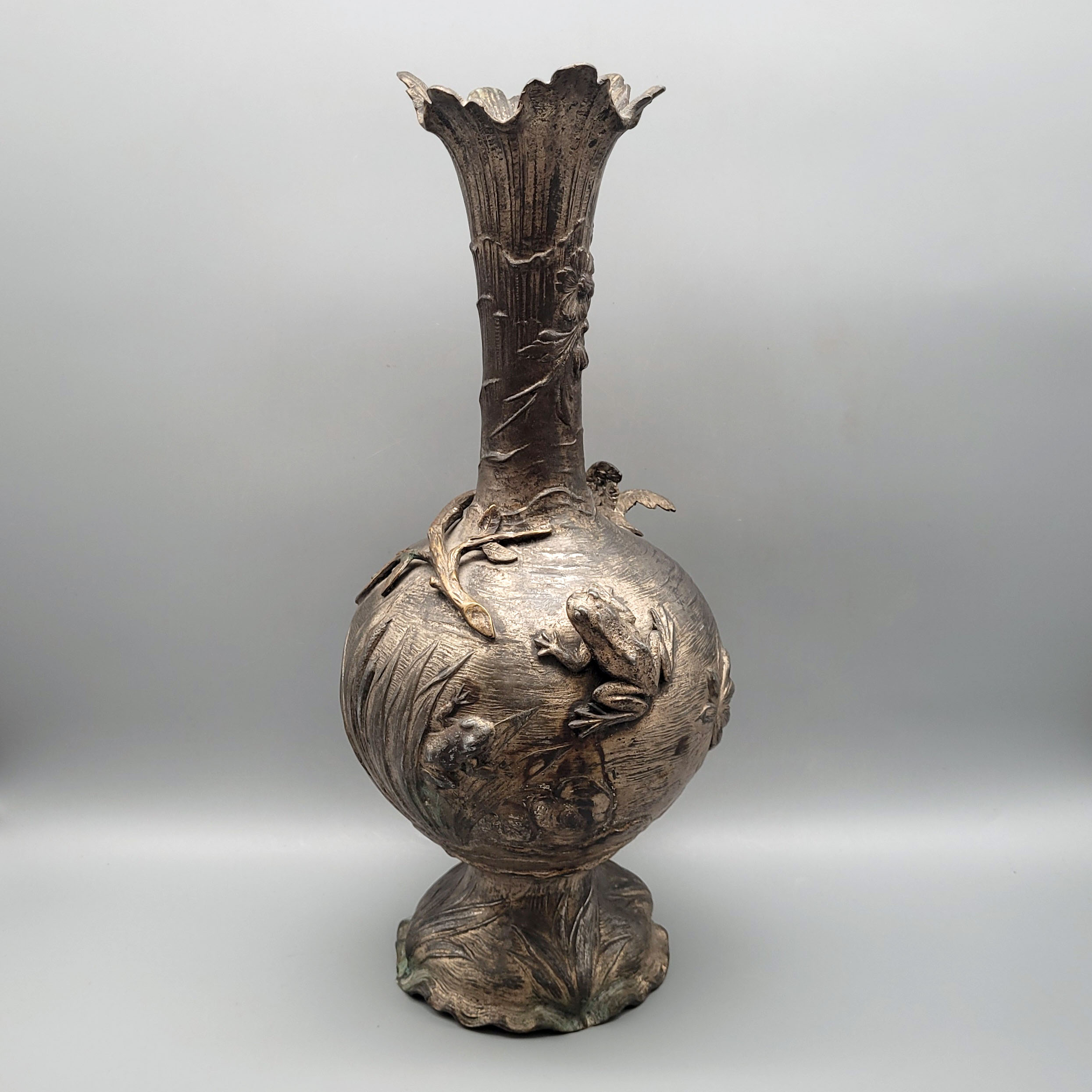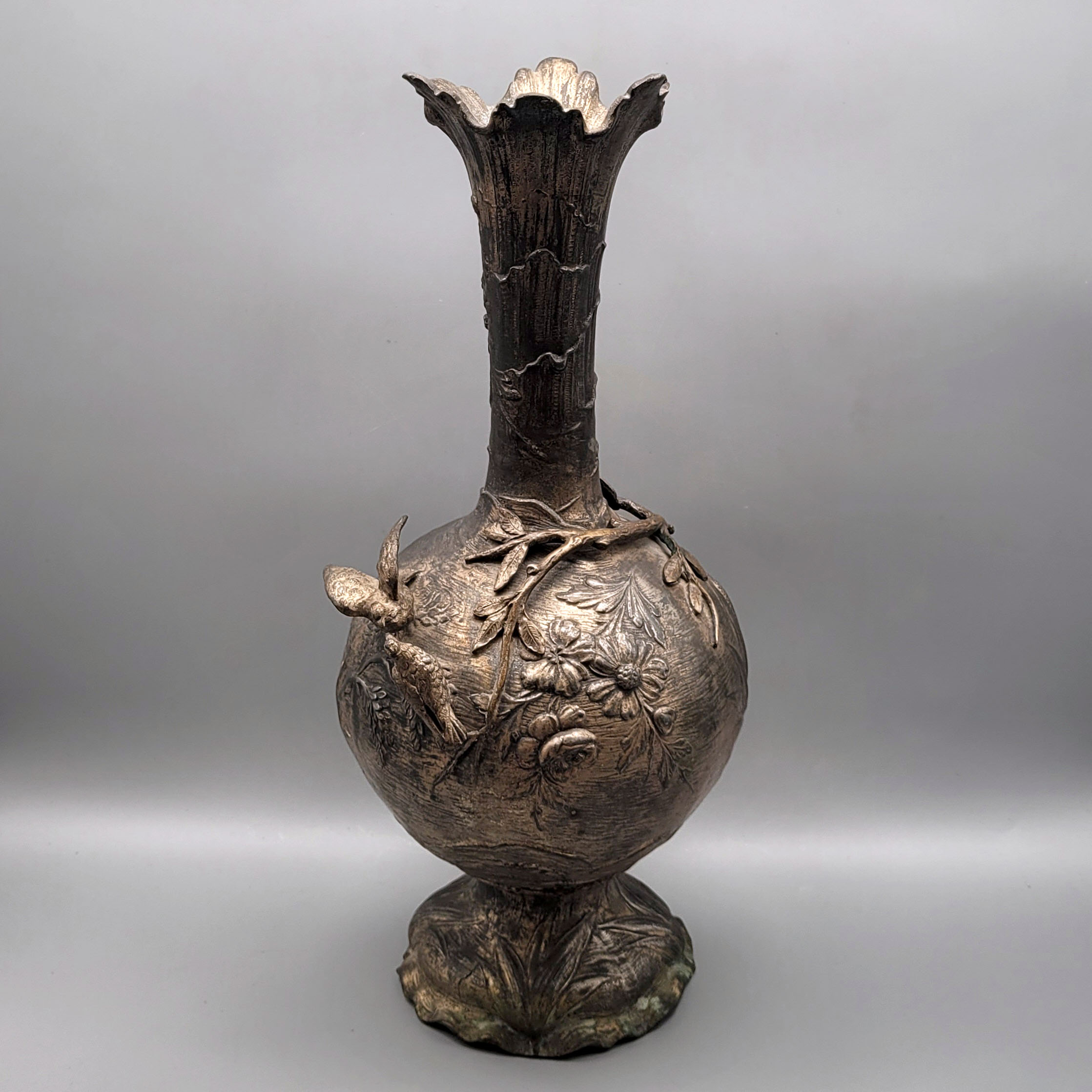 VaseZinn, Antimonlegierung, Wandung mit 2 Tauben, Frosch und Ast, Frankreich, um 1900, Höhe 38 cm (kleiner Riss in der Wandung)