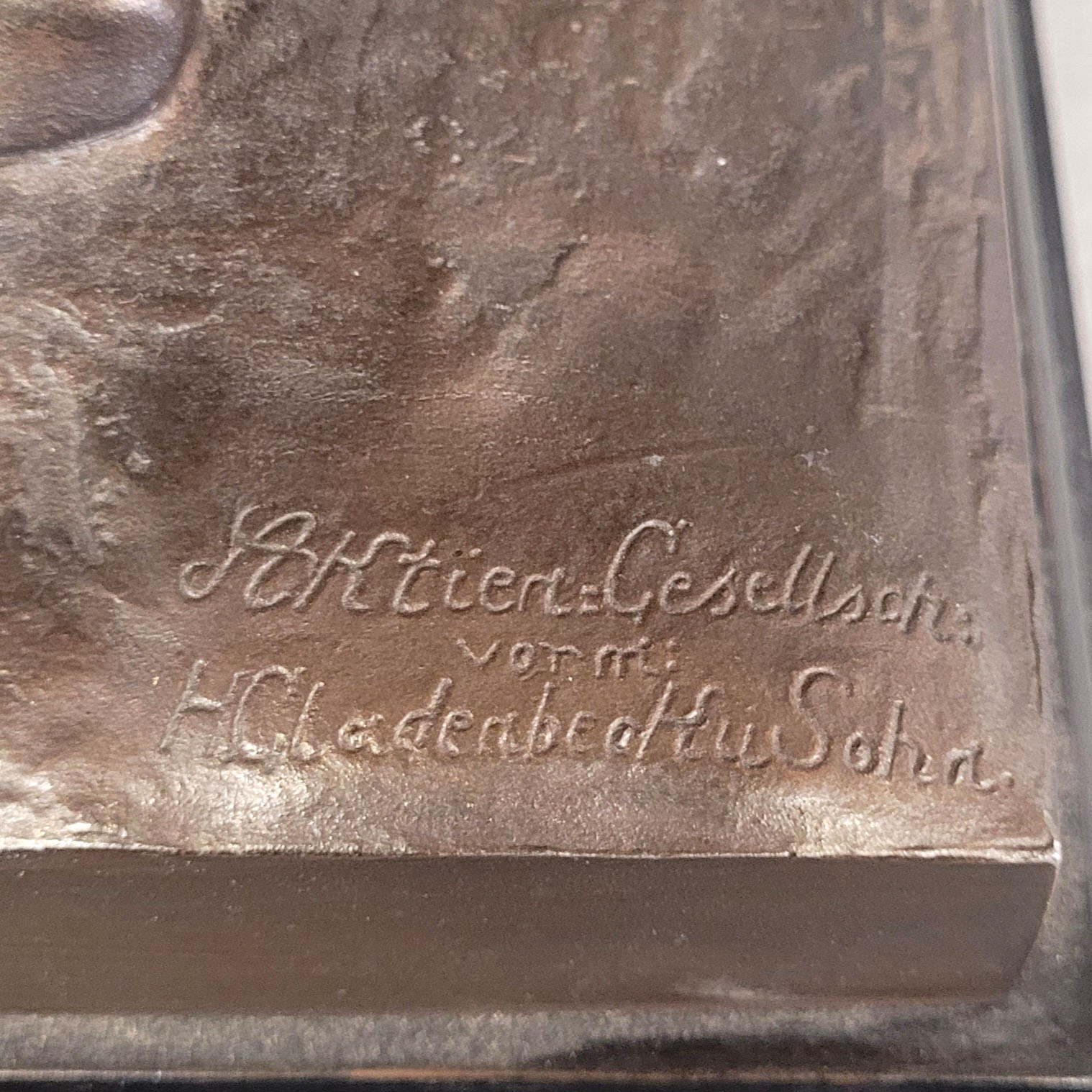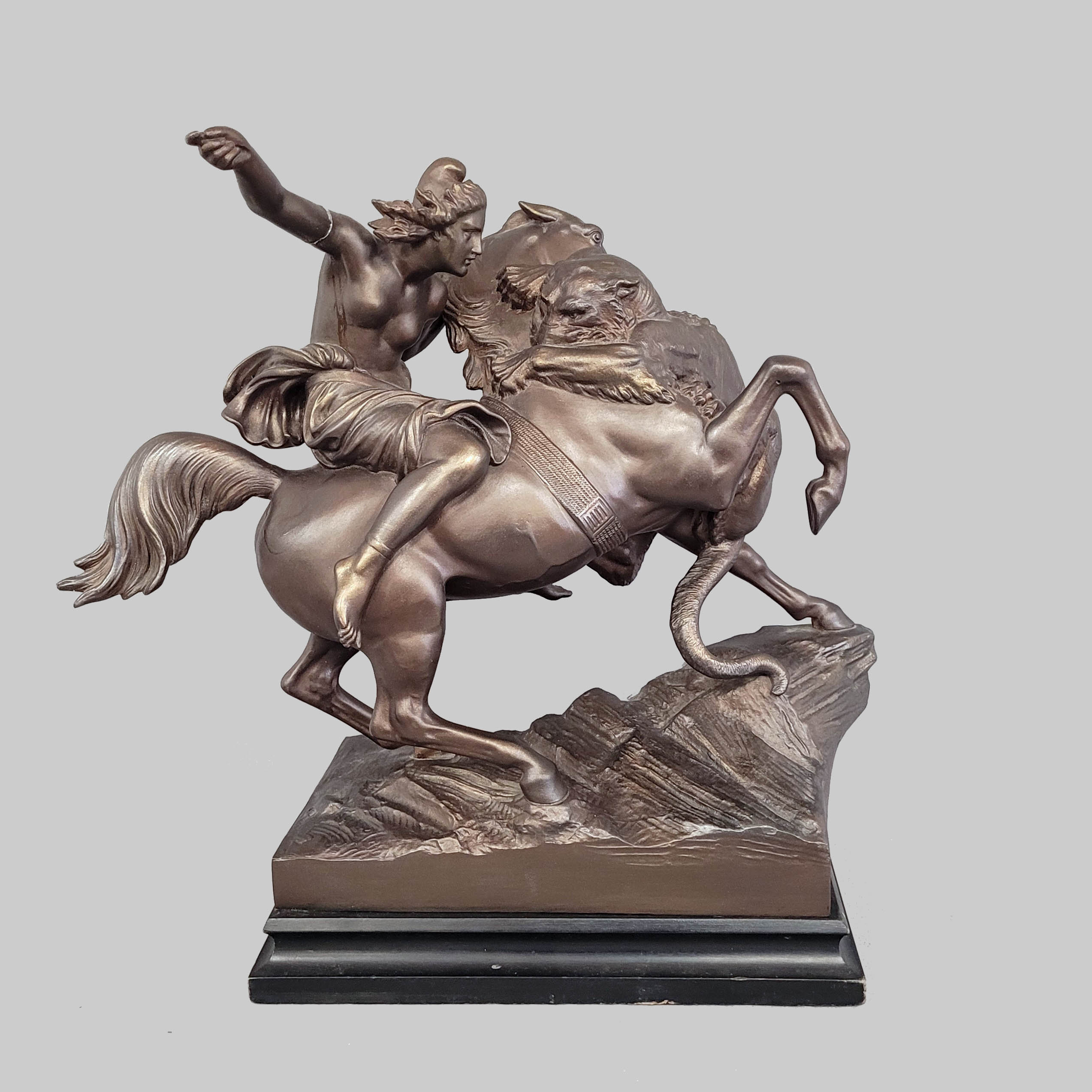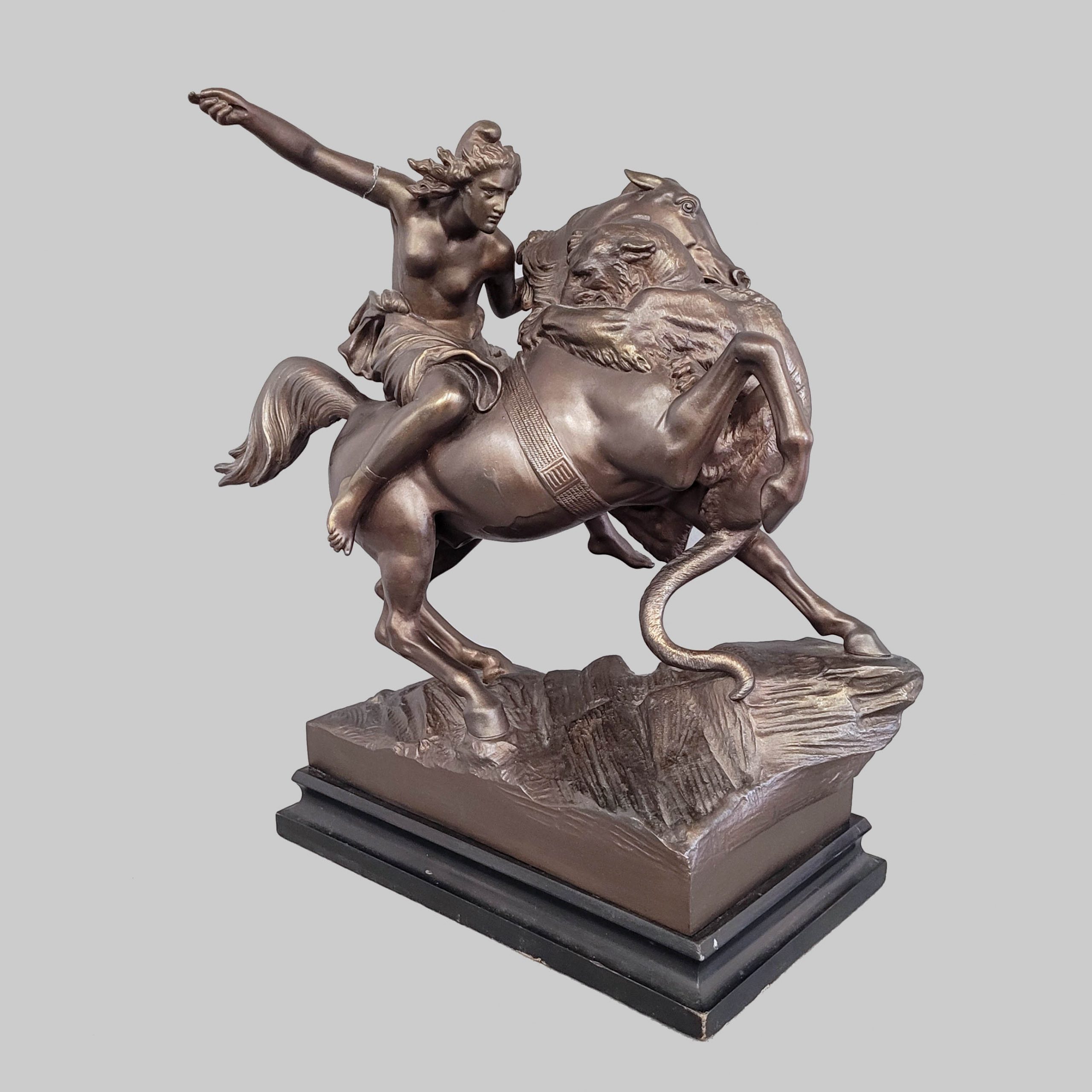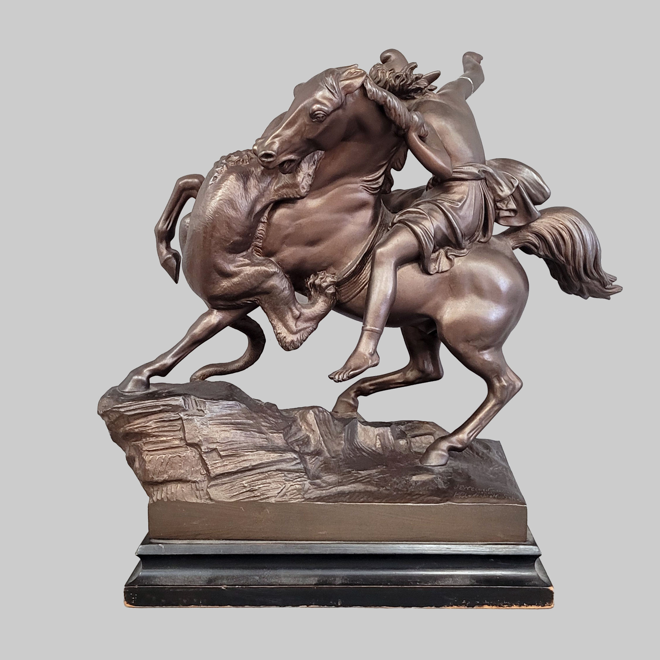 Zinkguss, Gießermarke „Aktien-Gesellschaft vorm: Gladenbeck u. Sohn“, Holzsockel, Höhe 44 cm (ein Arm gebrochen)