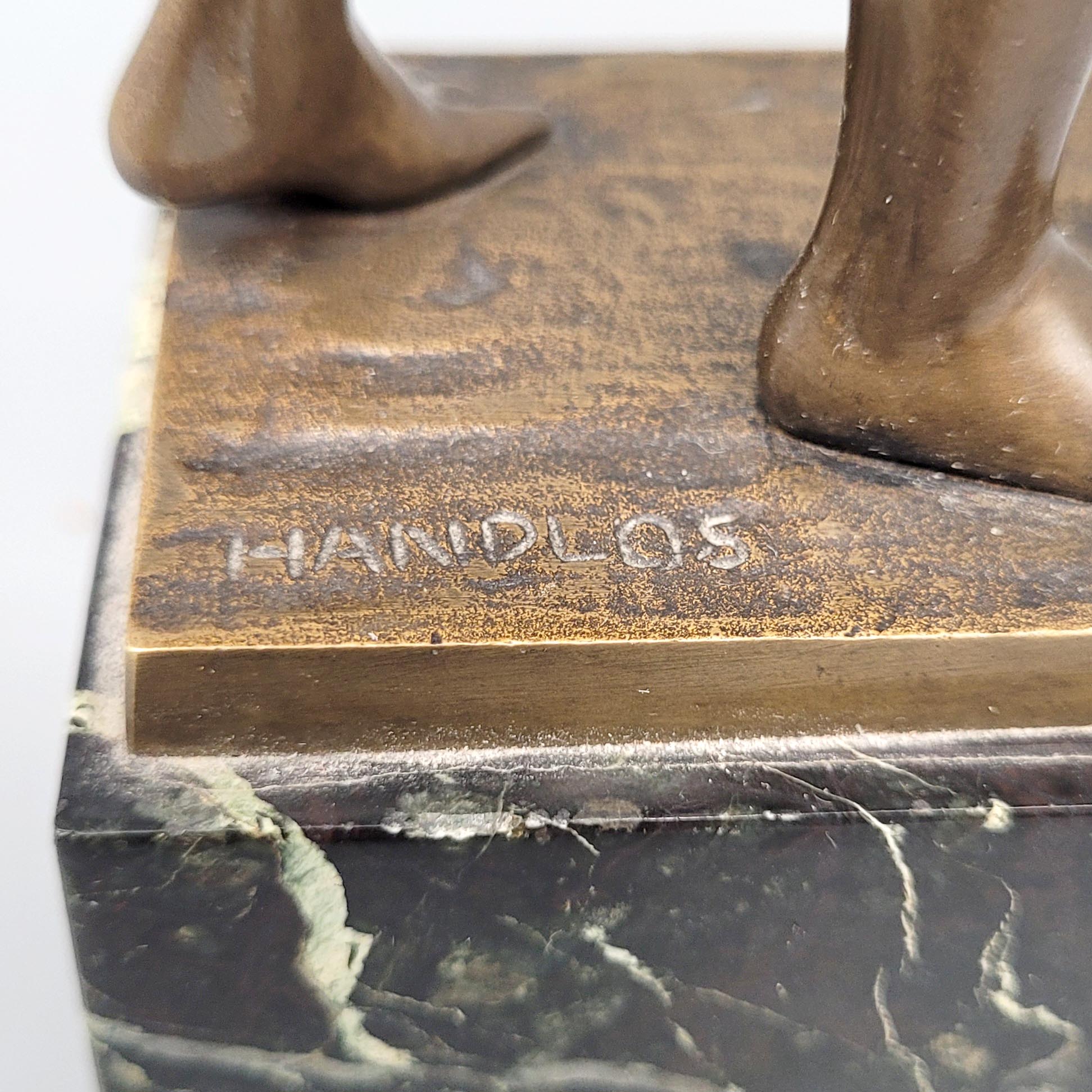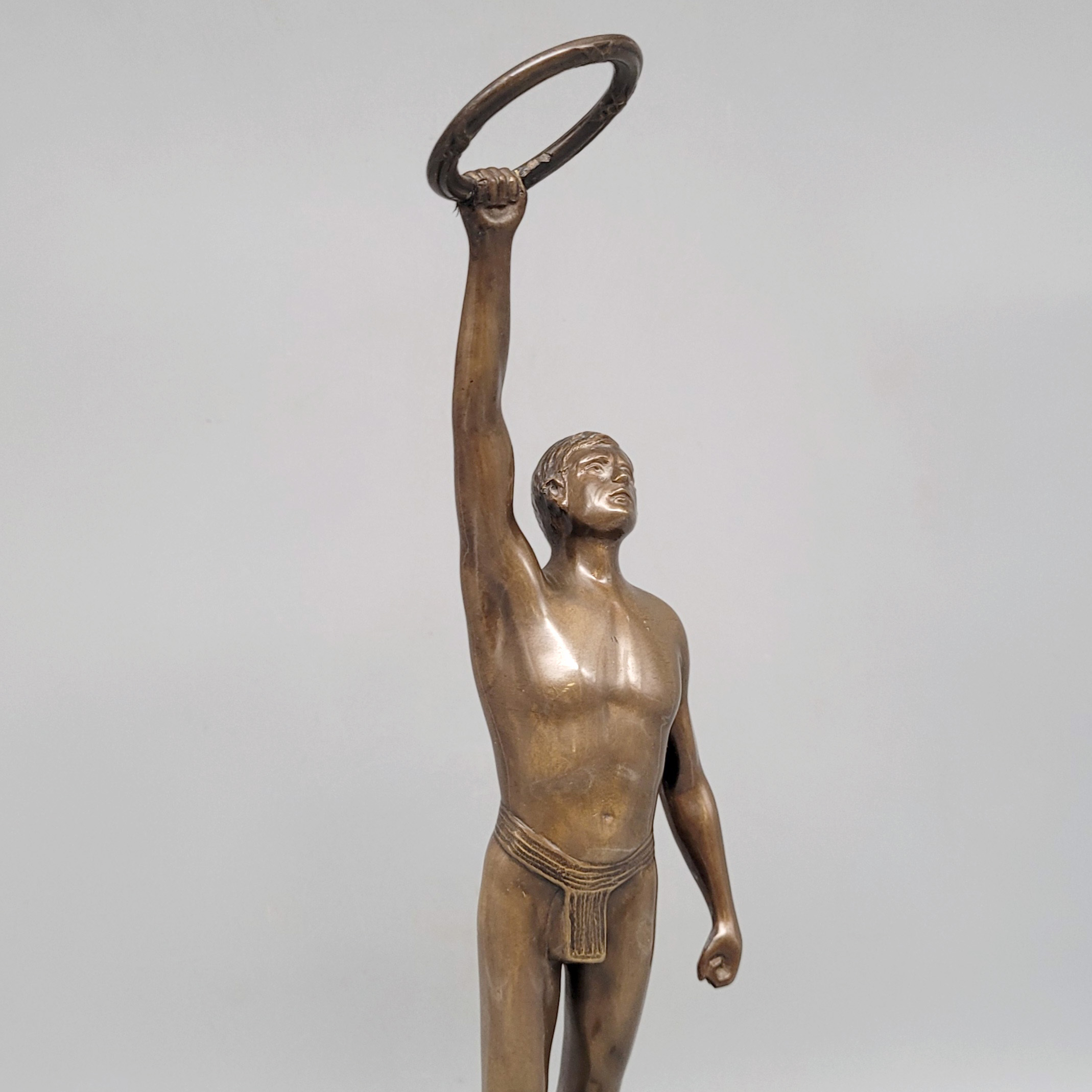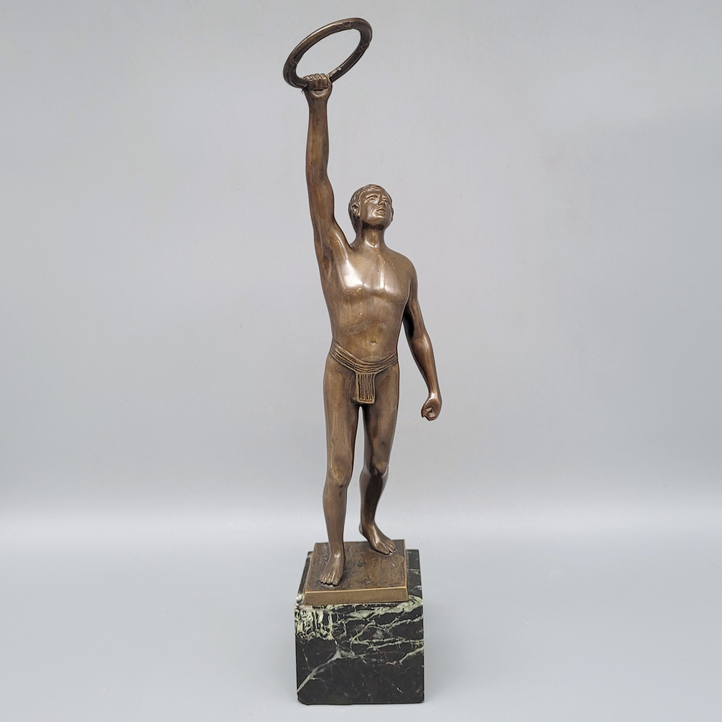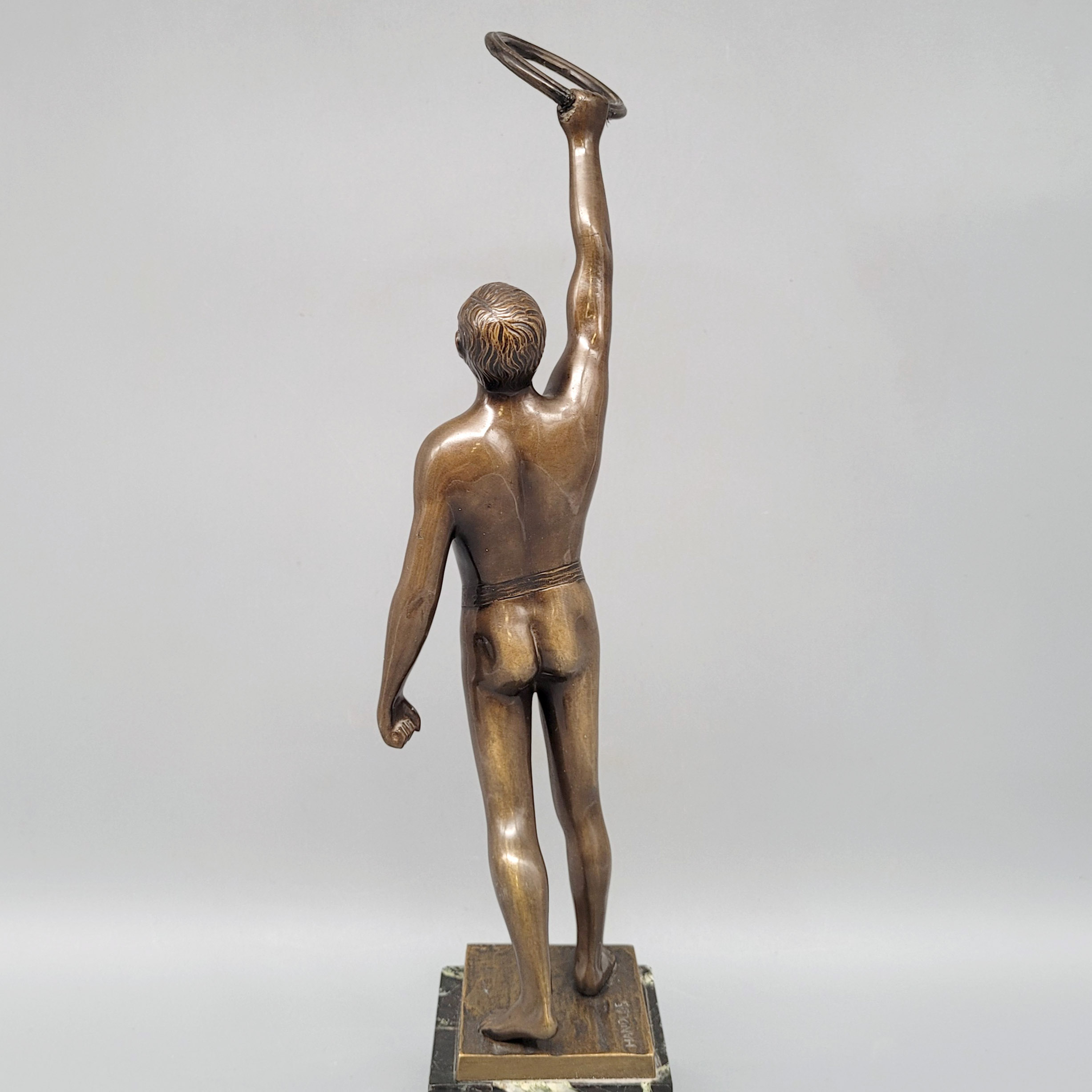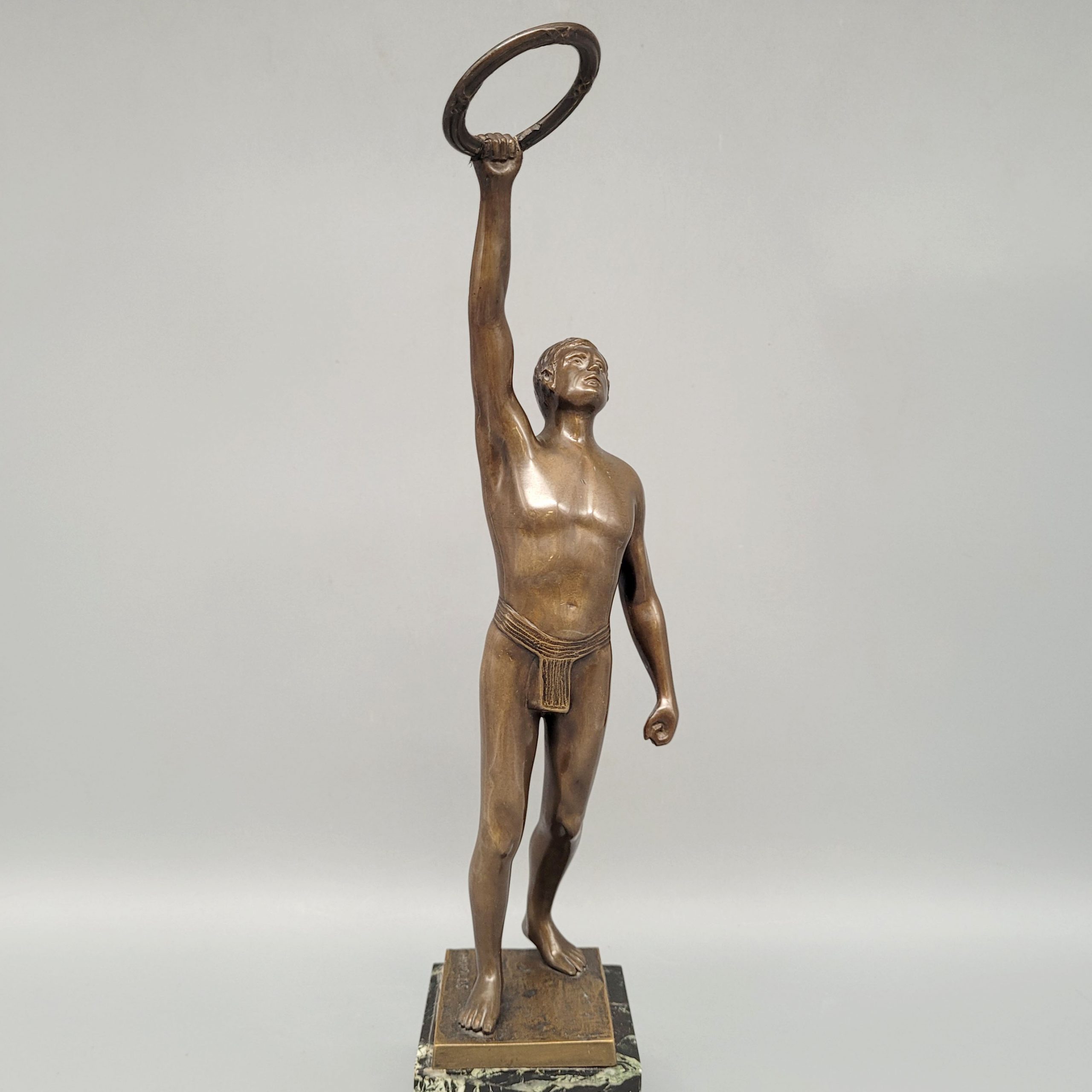 Siegreicher Athlet mit Lorbeerkranz Bronze, patiniert, bezeichnet auf der Plinthe „Handlos“, Deutsch, um 1920, Marmorsockel, Höhe mit Sockel 37 cm (Sockel leicht bestoßen)