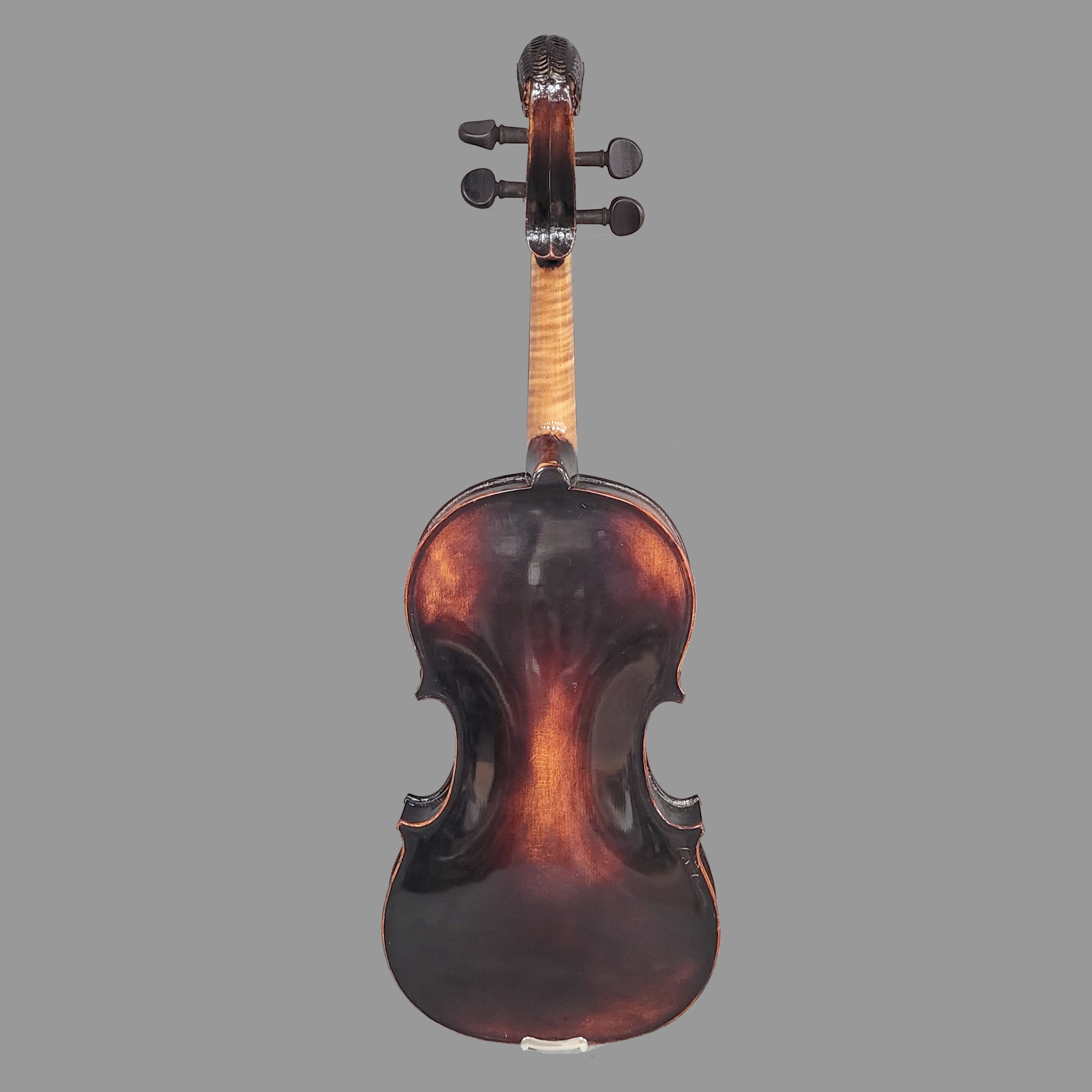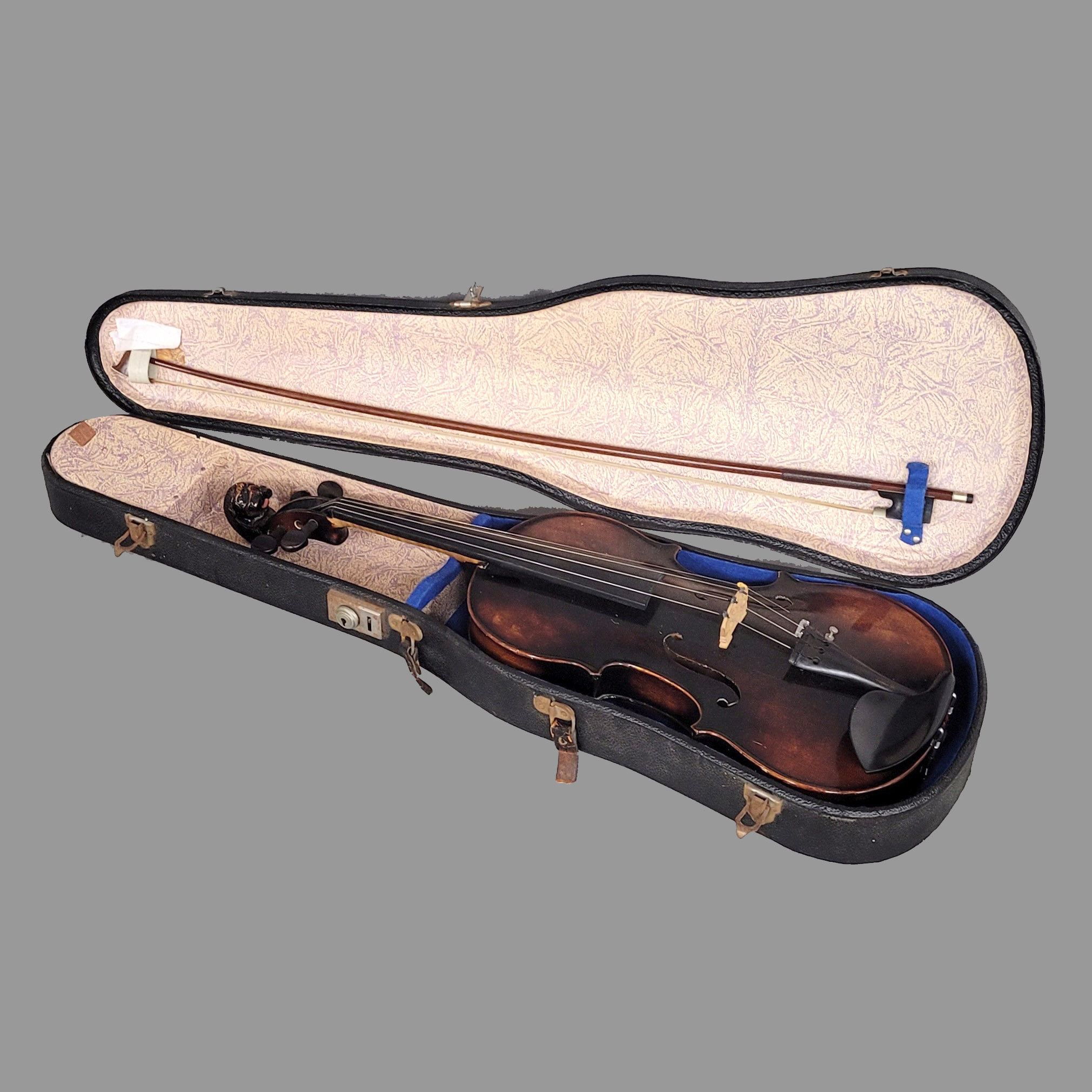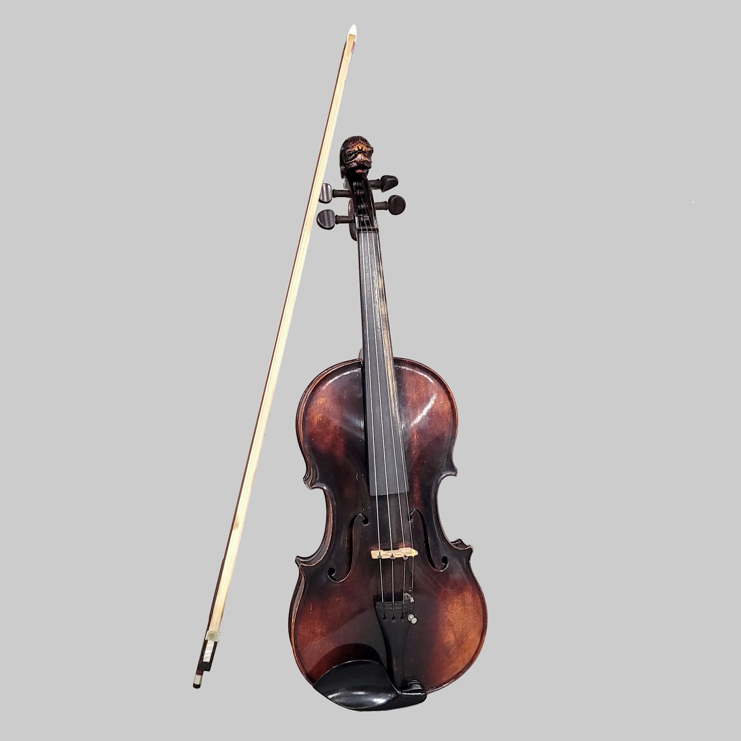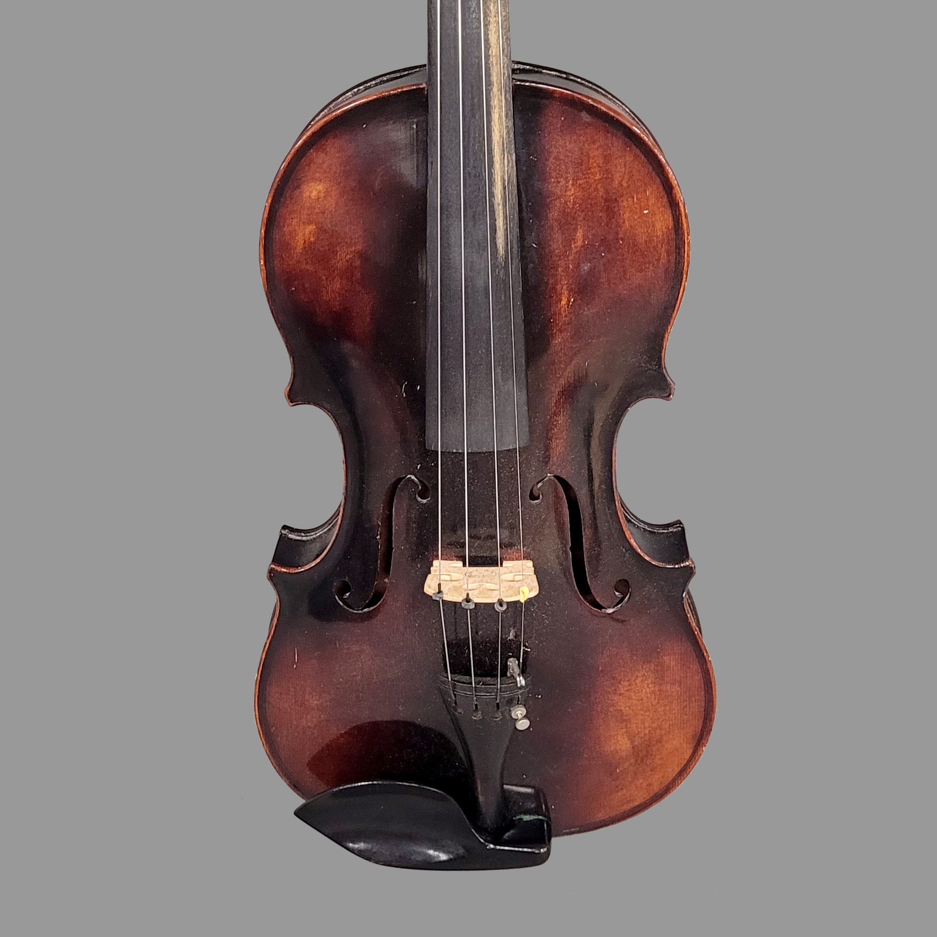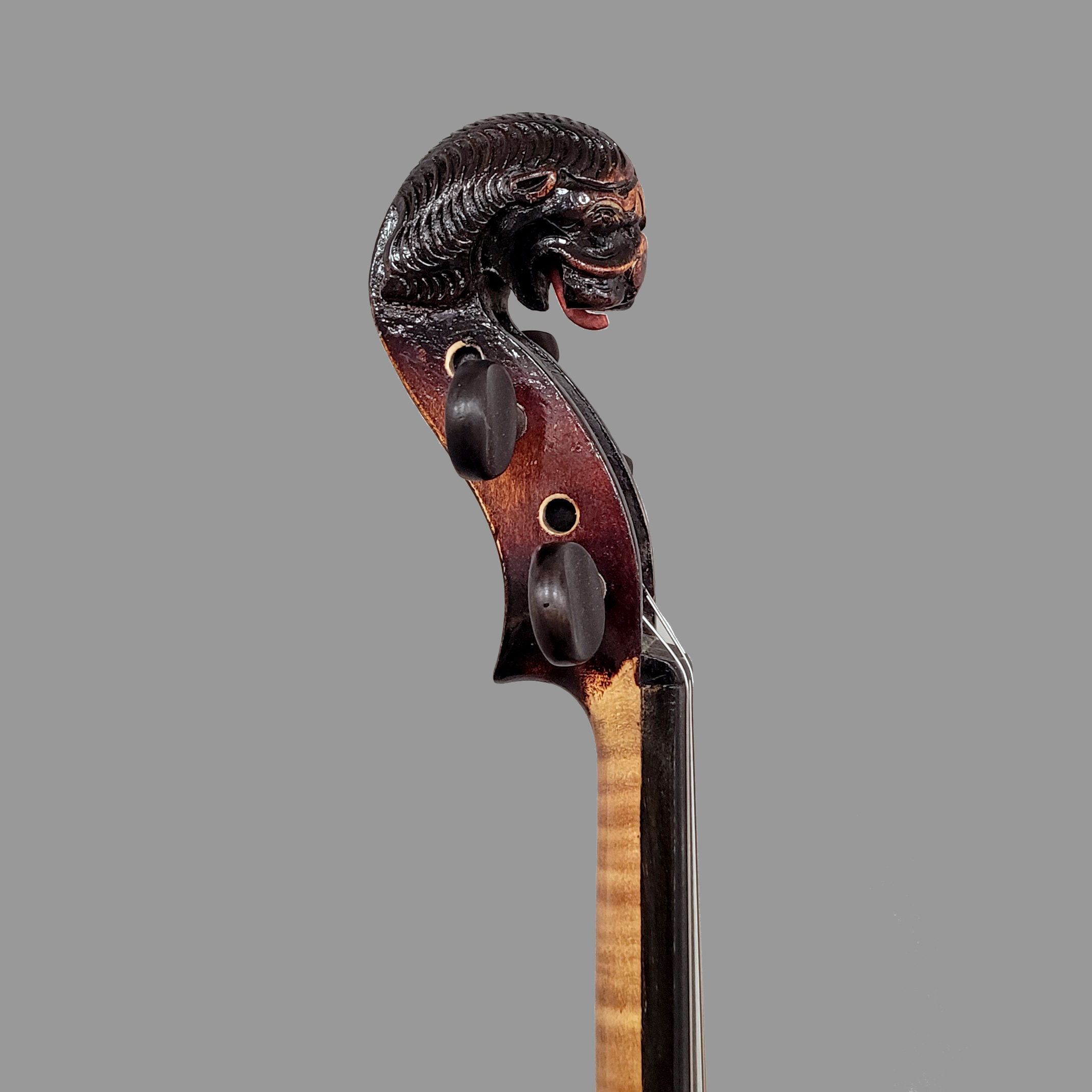 ViolineDecke, Fichte, Zarge und Boden Ahorn, rotbraun lackiert, Schnecke mit Löwenkopf, Bogen Ahorn, wohl Italien um 1930, Länge Corpus 36,5 cm, Gesamtlänge 59,5 cm, Koffer