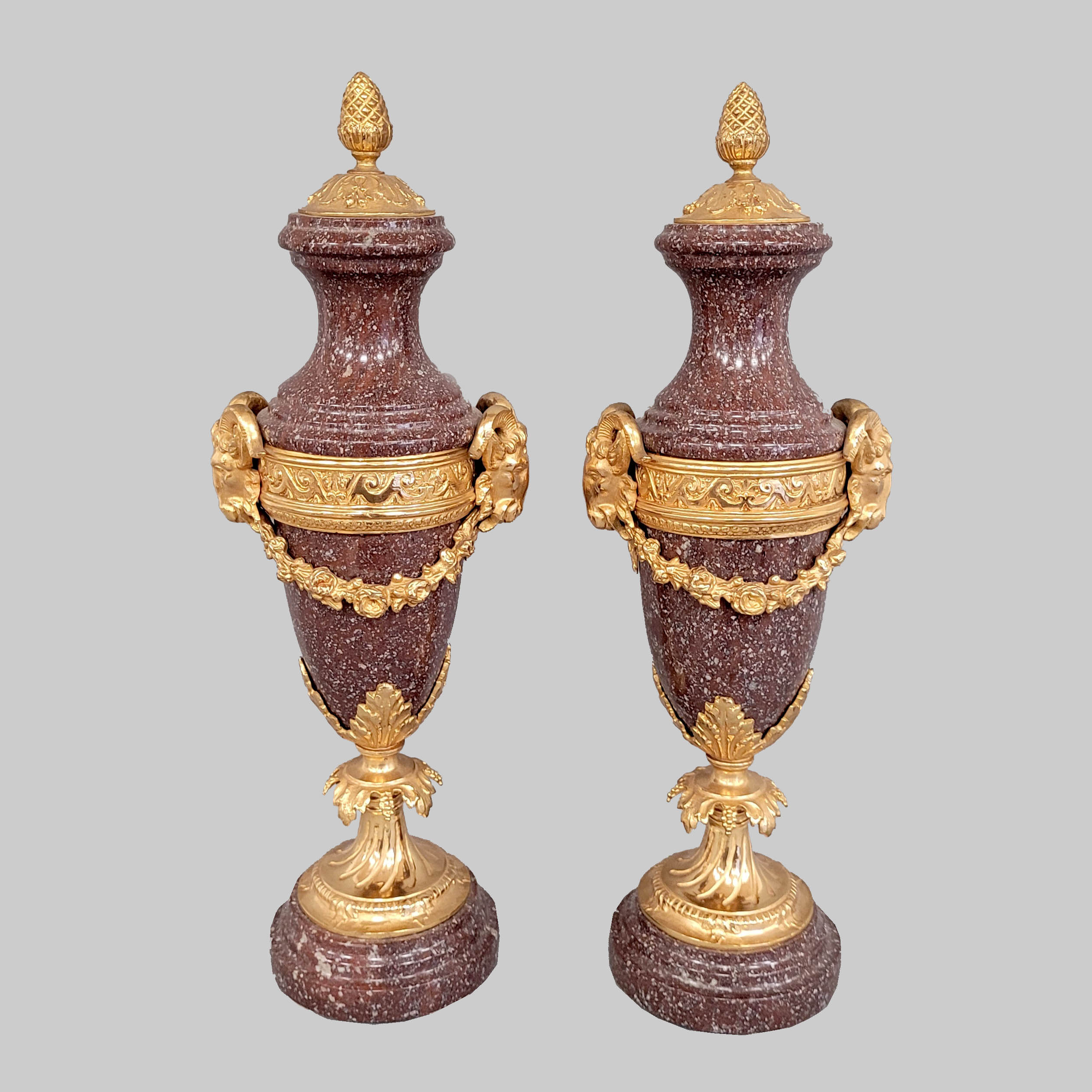 Paar Aufstellerroter Porphyr, Bronzemontierung, feuervergoldet, Französisch, um 1900, Höhe 44 cm