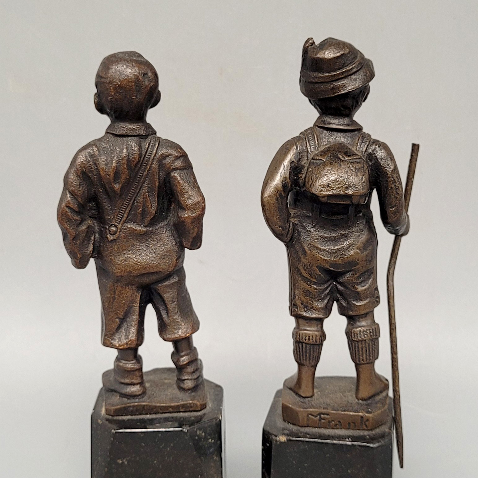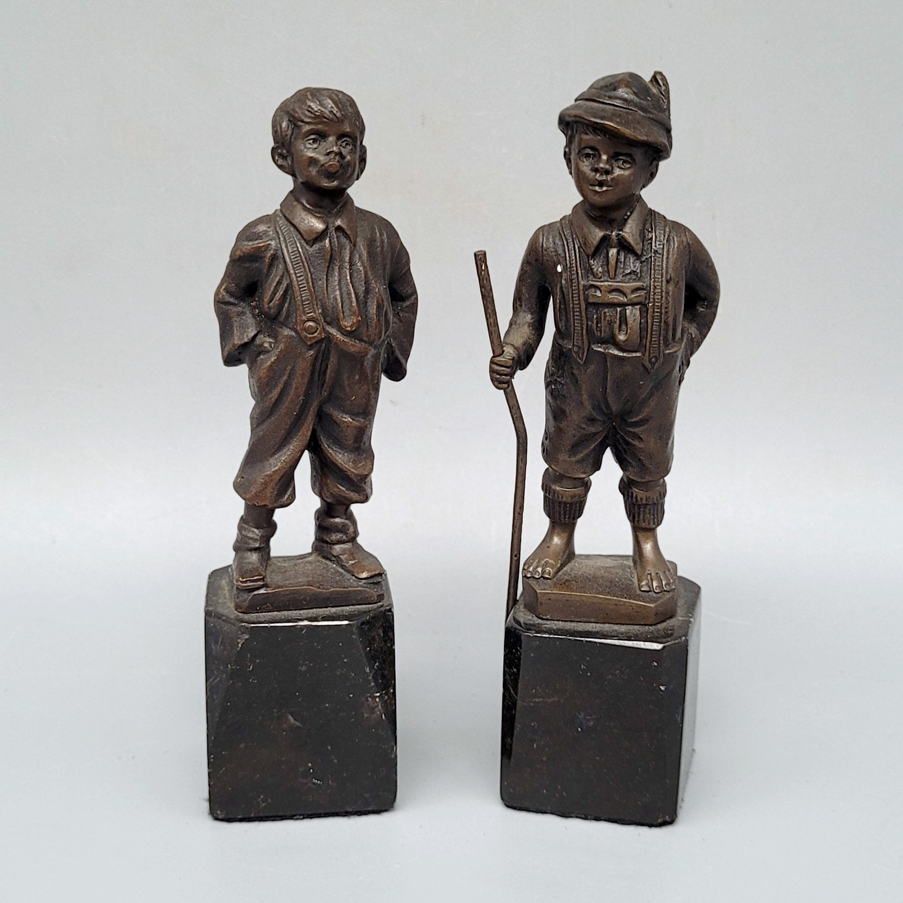 Paar Kleinfiguren, Bronze, signiert auf der Plinthe, Marmorsockel, Höhe mit Sockel bis zu 12 cm (ein Sockel geklebt)
