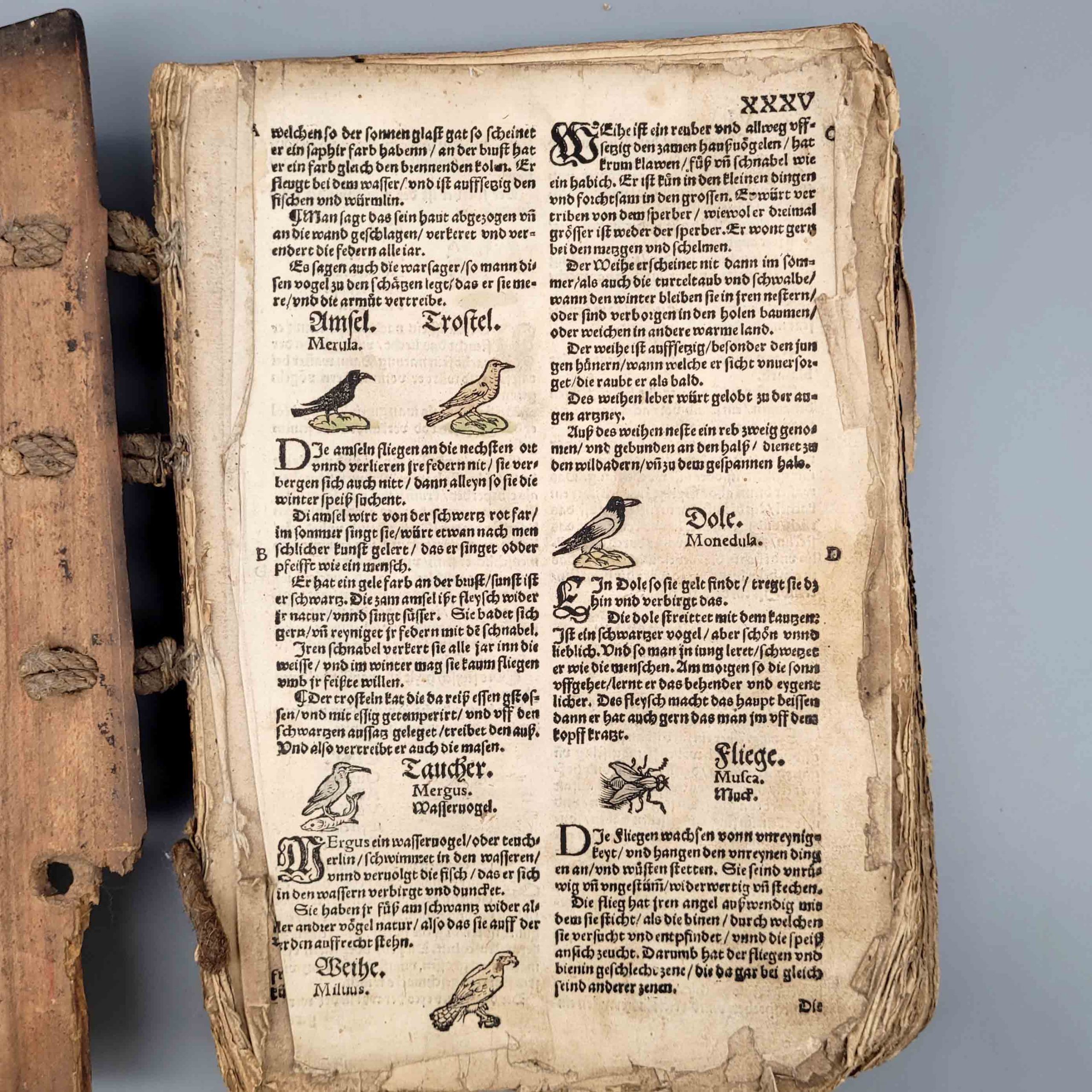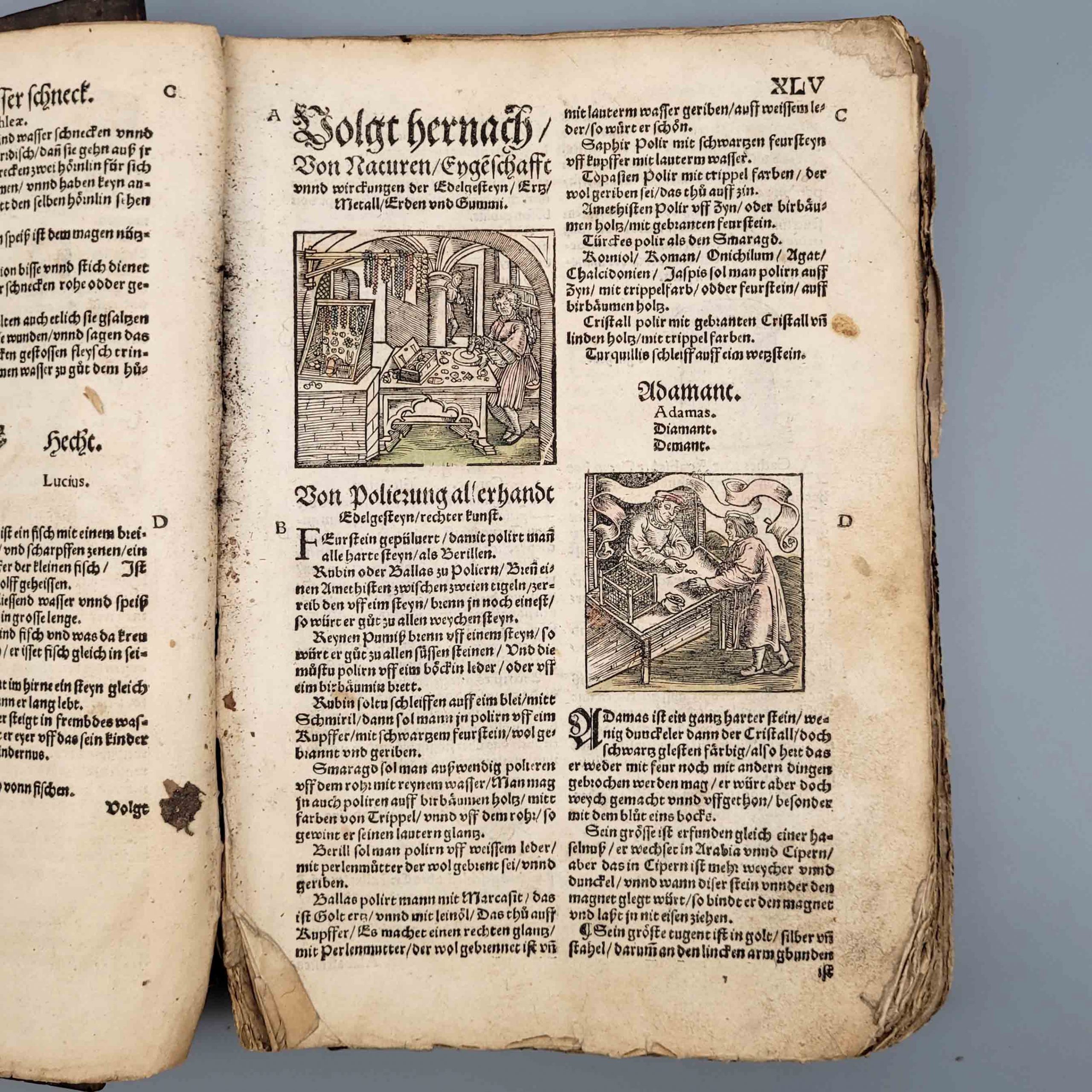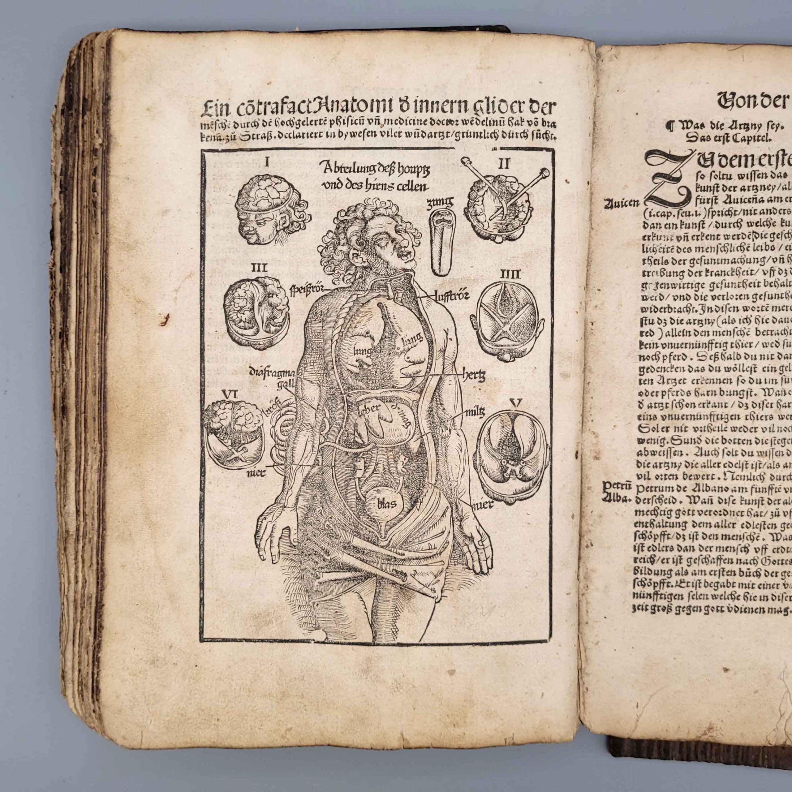 Frankfurt (Christian Egenolph) 1538 (beginnt erst mit S. XXXV zahlreiche, alt kolorierte Holzschnitte) beigebunden LORENZ, Fries, Spigel der Artzny gemachet und widerumb mit ernst ubersehen und gebessert…, Straßburg (Balthasar Beck) 1529 (110 von 164 Blatt, zahlreiche Holzschnitte, stark beschädigter Holzdeckeleinband, Rückdeckel lose)