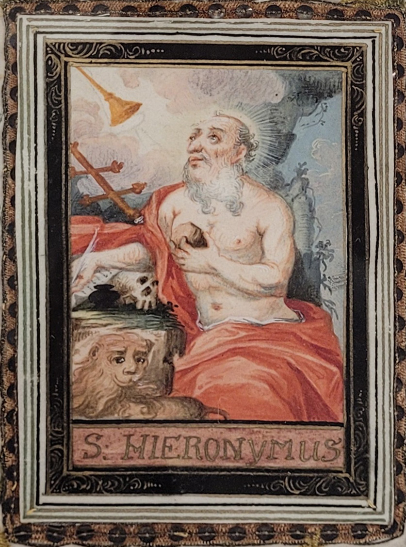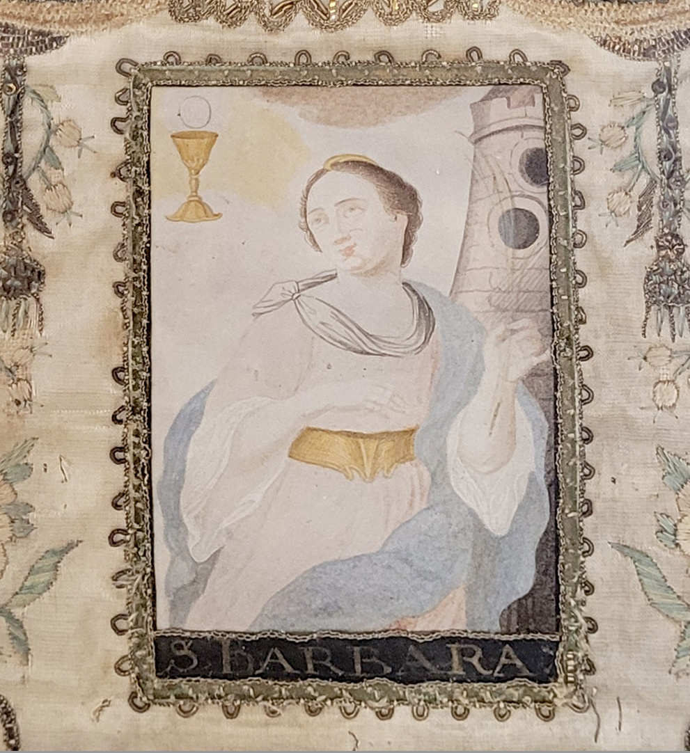 Aquarell auf Papier bzw. Pergament(?), eingerahmt in eine Seiden- und Goldfadenstickerei, Süddeutsch 18. Jahrhundert, mit Stickarbeiten 19,5 x 14 cm bzw. 23 x 17 cm, gerahmt unter Glas