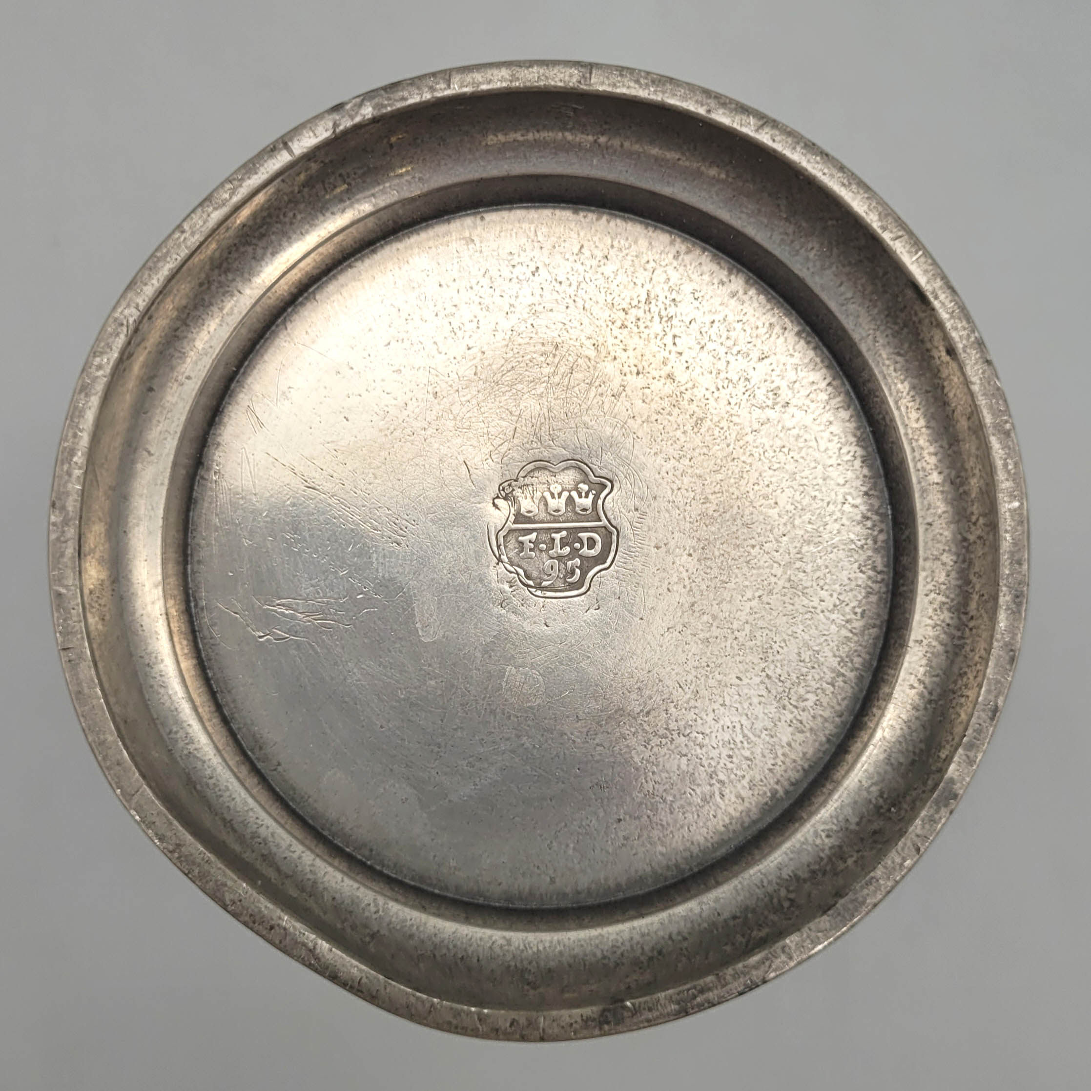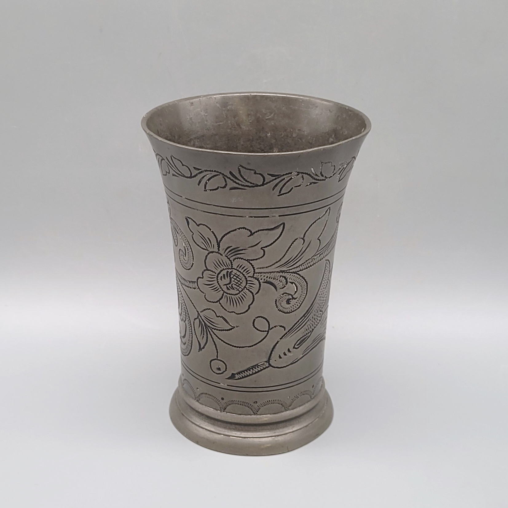 Zinn, Wandung mit Blumen- und Rankendekor, bodenseitig Stadtmarke Köln mit 95 und Meistermarke „FLD“, Köln, um 1700, Höhe 13,8 cm