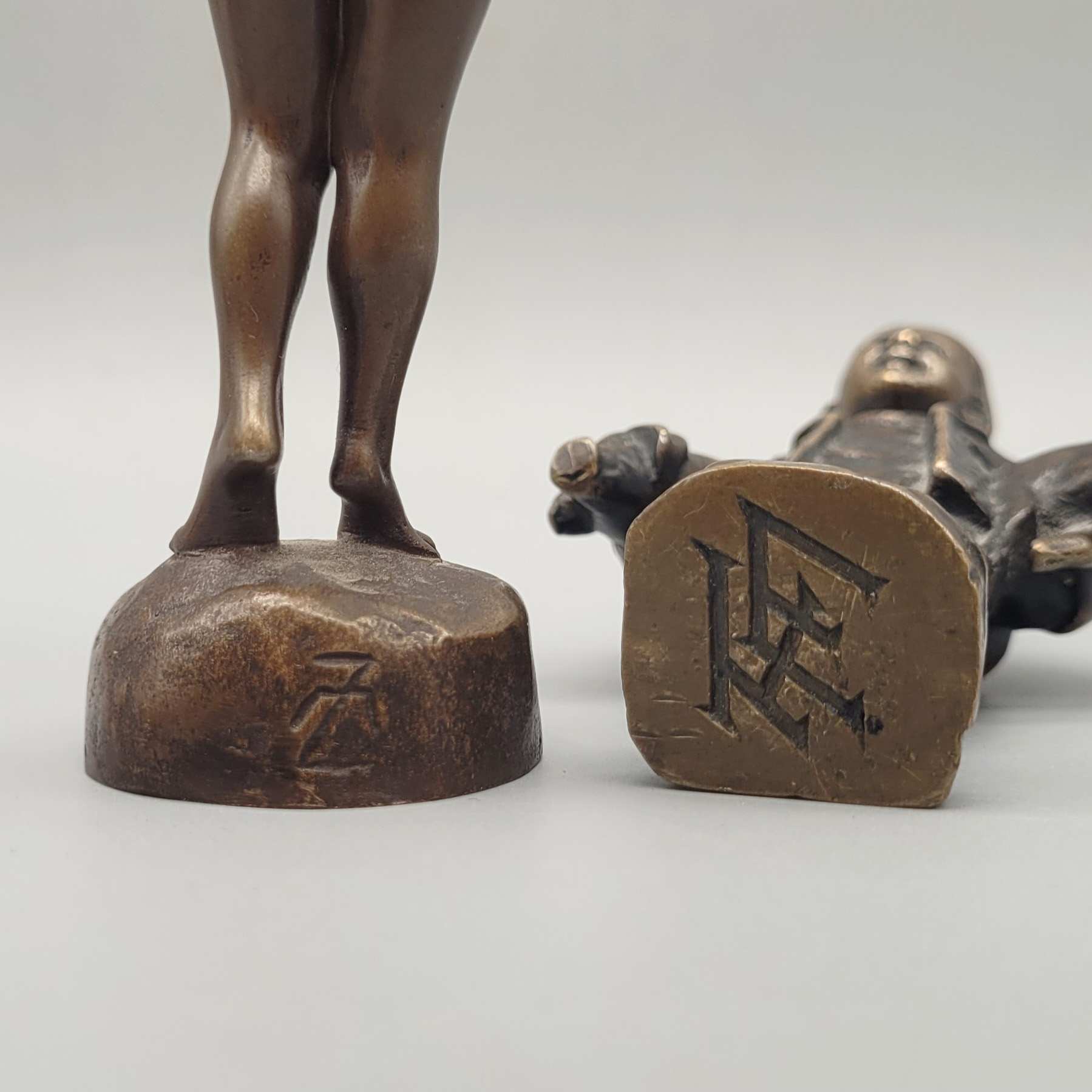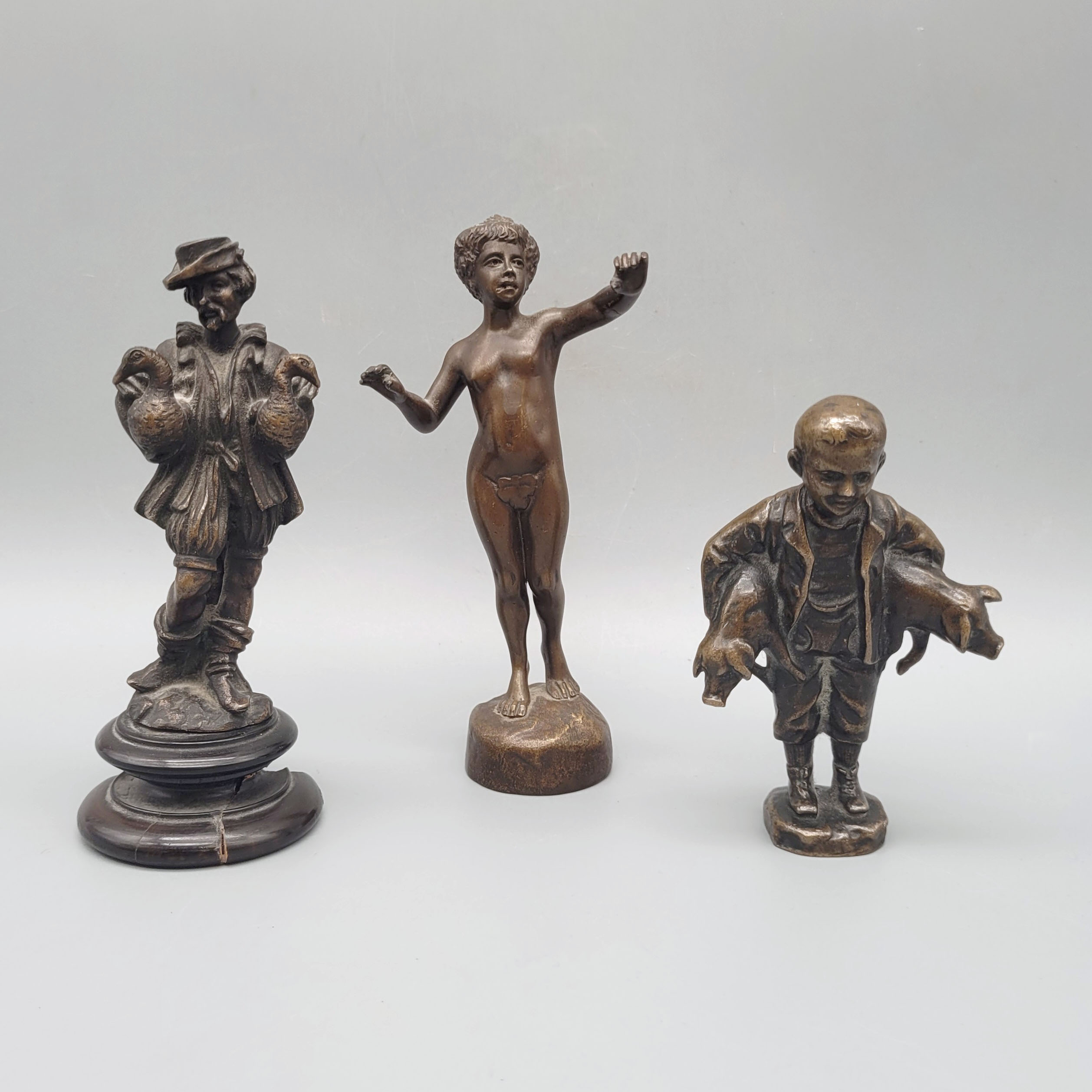 Drei Kleinbronzen Petschaft, Gänseverkäufer, Knabe, dieser monogrammiert MZ, Höhe bis zu 13 cm (ohne Sockel)