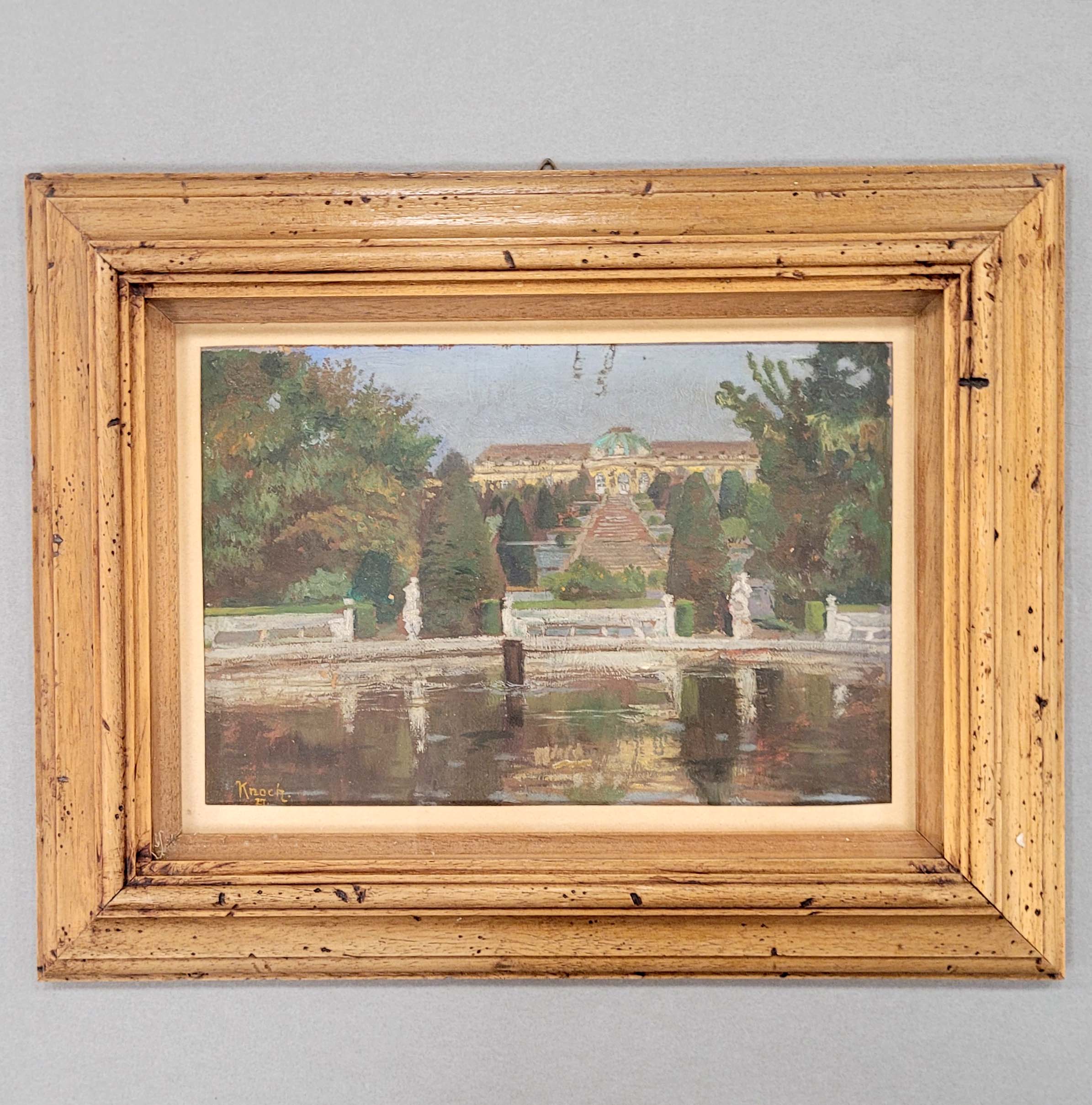 KNOCH, Friedegart (tätig Anfang 20. Jh.): Blick auf Schloss SanssouciÖl auf Malkarton, signiert und datiert (19)27 unten links, 18 x 27,5 cm, gerahmt unter Glas und Passepartout