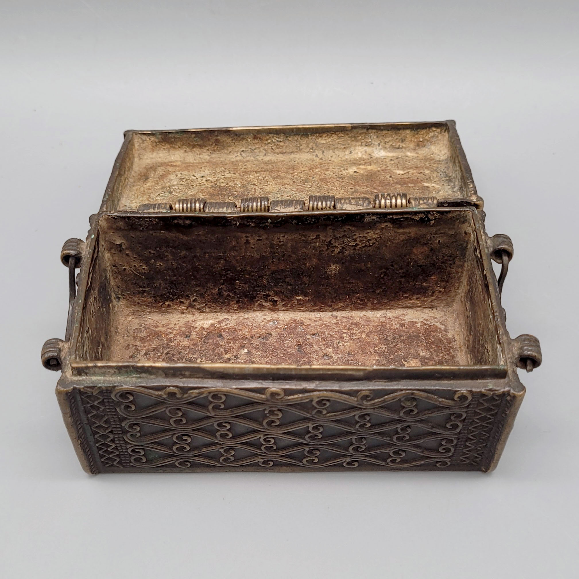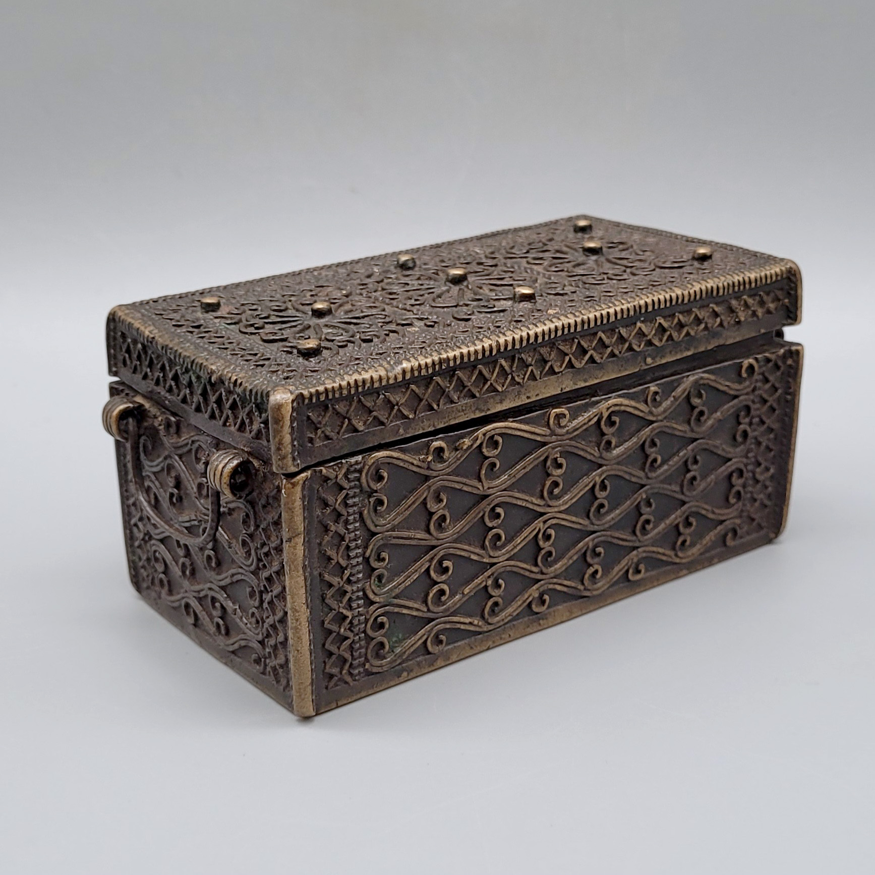 Deckeldose mit GriffenBronze, ornamentaler erhabener Dekor, Indopersisch 18. Jahrhundert, 5,5 x 11 x 6 cm