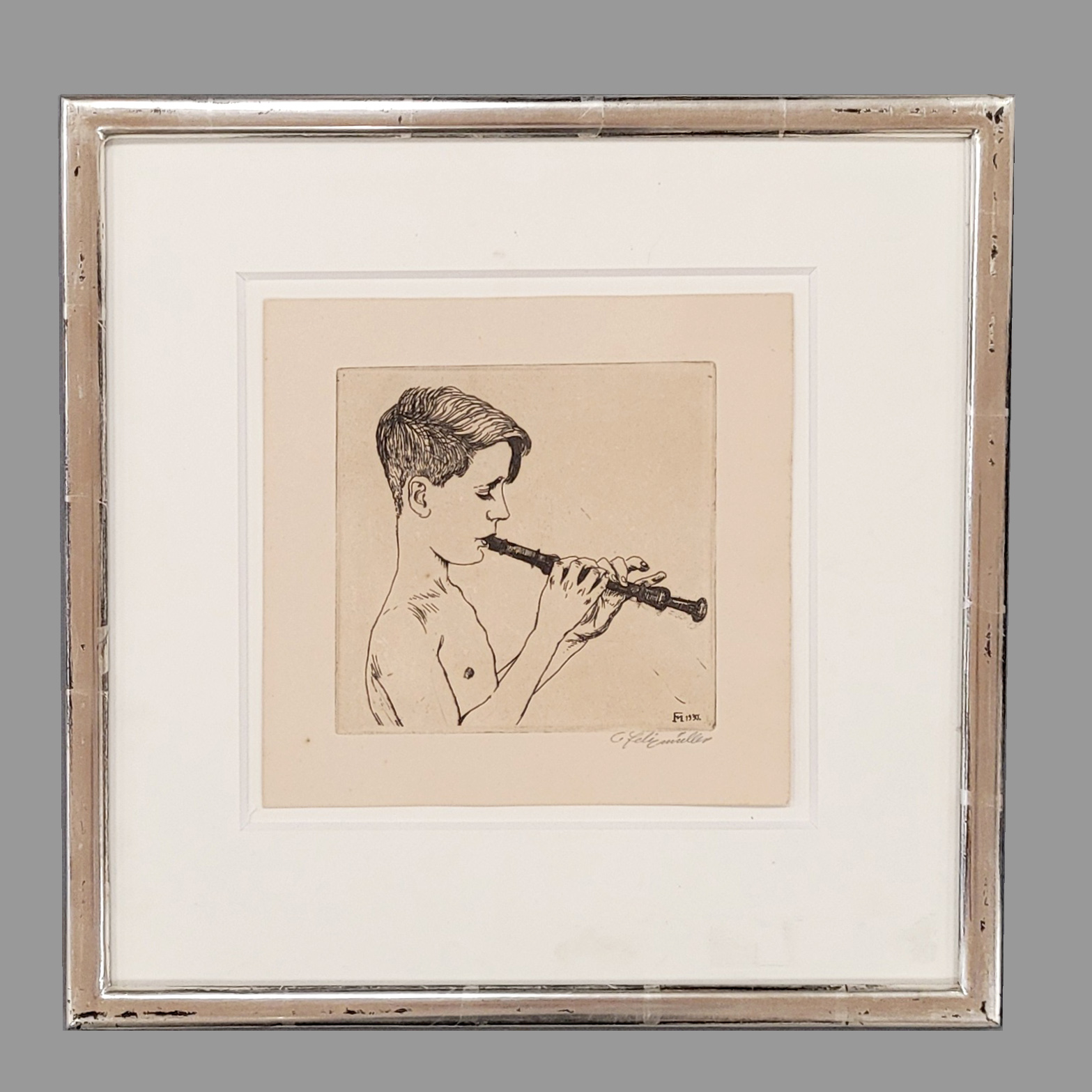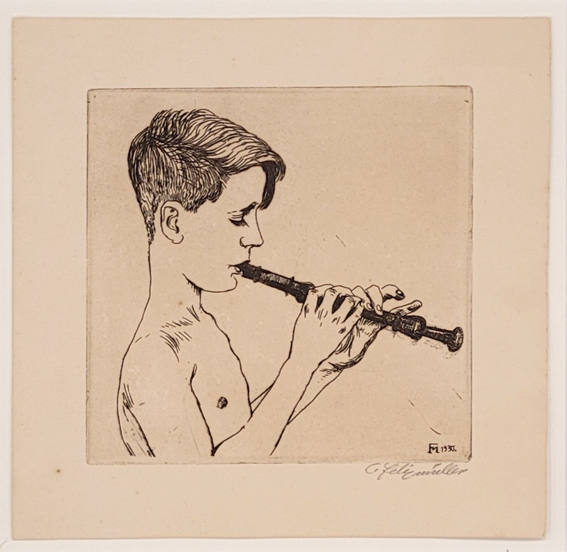 FELIXMÜLLER, Conrad (1897-1977): FlötenliedRadierung, 1930, signiert unten rechts, 20 x 20,5 cm, gerahmt unter Glas und Passepartout (gleichmäßig gebräunt)** ) Bei einem Zuschlag über 400 € werden 2 % für VG Bild gemäß §26 UrHG erhoben