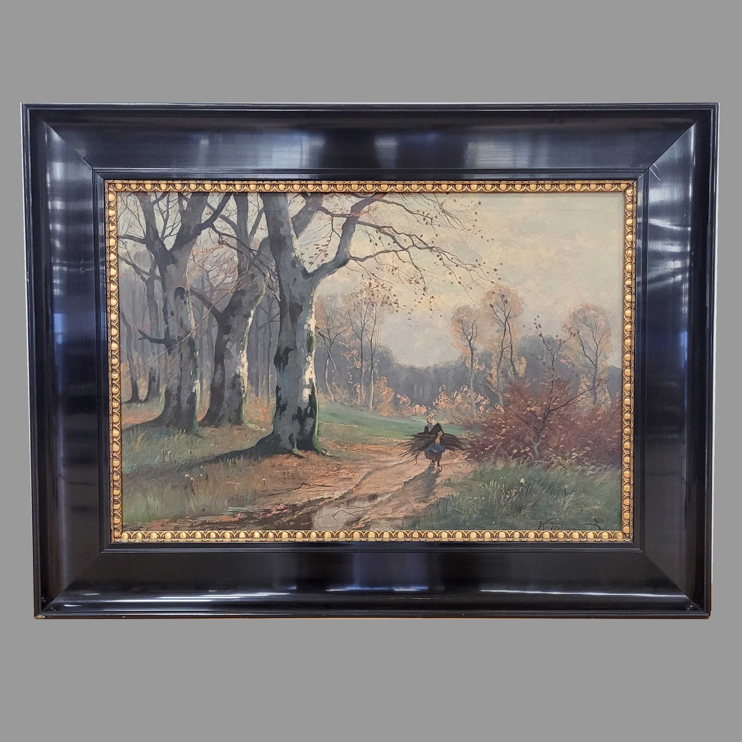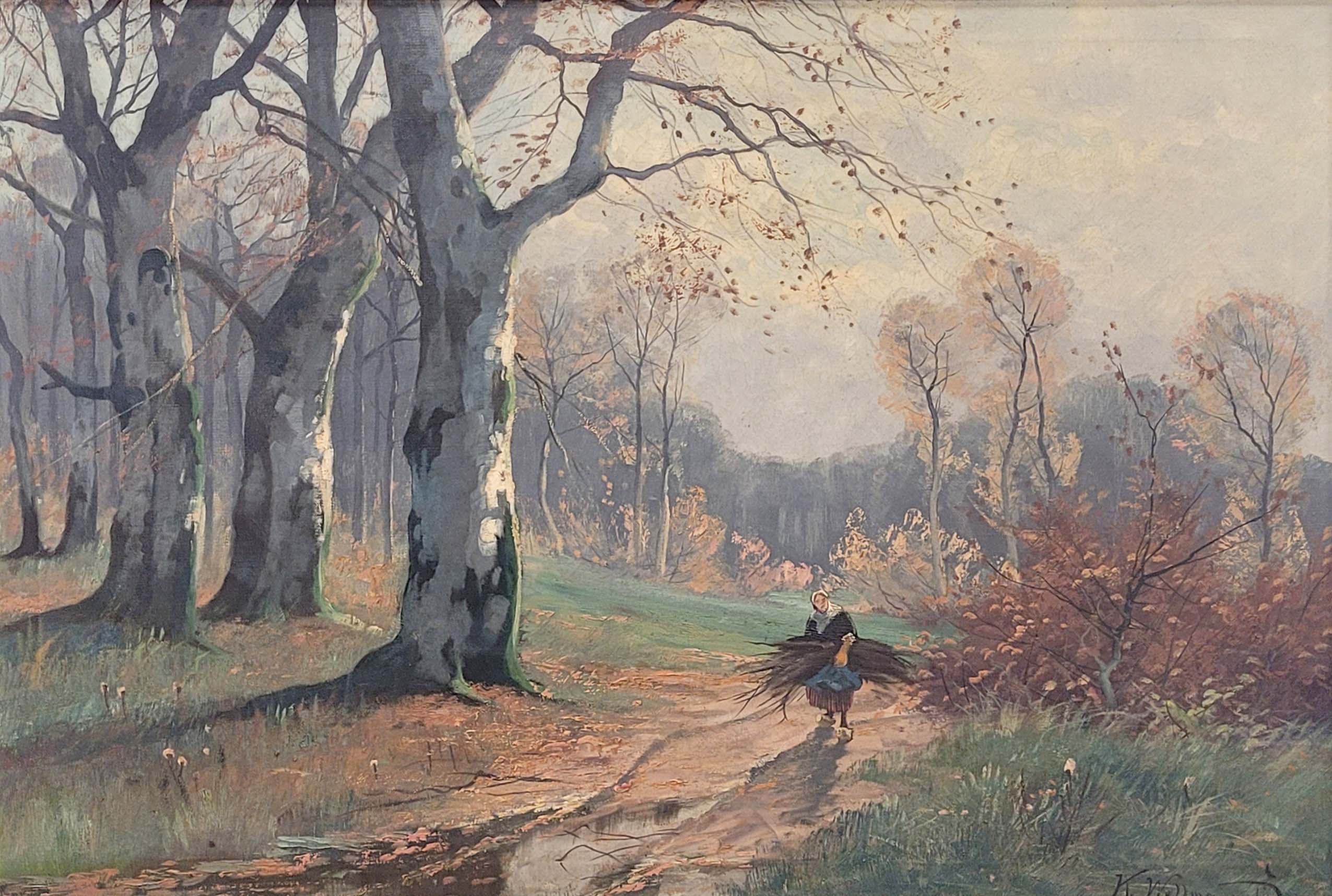 WELLMANN, K. (tätig um 1900): Reisigsammlerin im WaldÖl auf Leinwand, signiert und bezeichnet „Ddf“ unten rechts, 61,5 x 91,5 cm, Rahmen