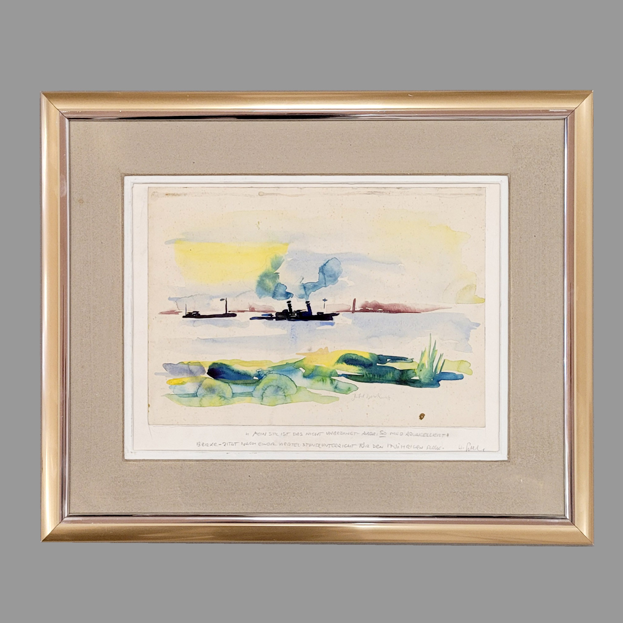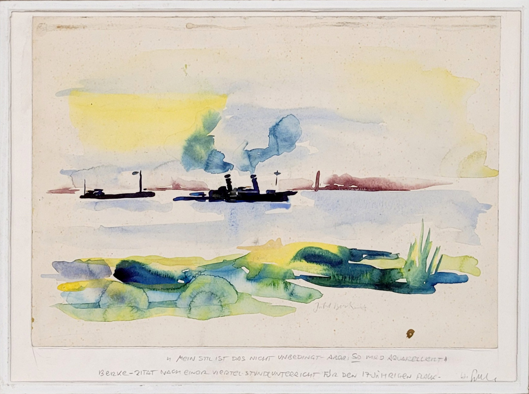 BERKE, Hubert (1908-1979): Am RheinAquarell auf Karton, aufgezogen auf Karton, signiert und datiert (19)44 unten rechts, 23,5 x 33,5 cm, gerahmt unter Glas und Passepartout