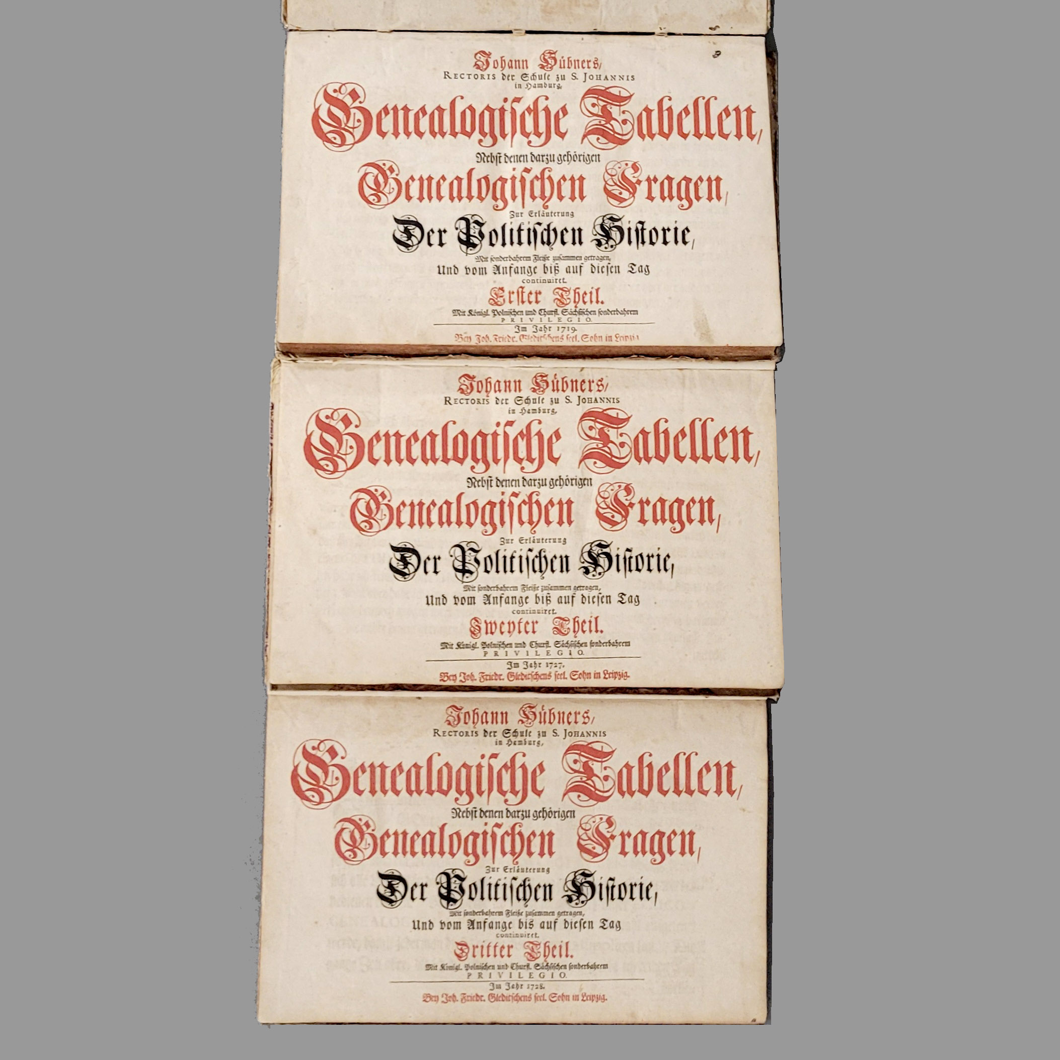 HÜBNER, Johann: Genealogische Tabellen, nebst denen darzu gehörigen genealogischen FragenLeipzig (Gleditschs Sohn) 1719-1728 (Papiereinbände der Zeit)Wir weisen darauf hin, dass die Bücher nicht kollationiert sind