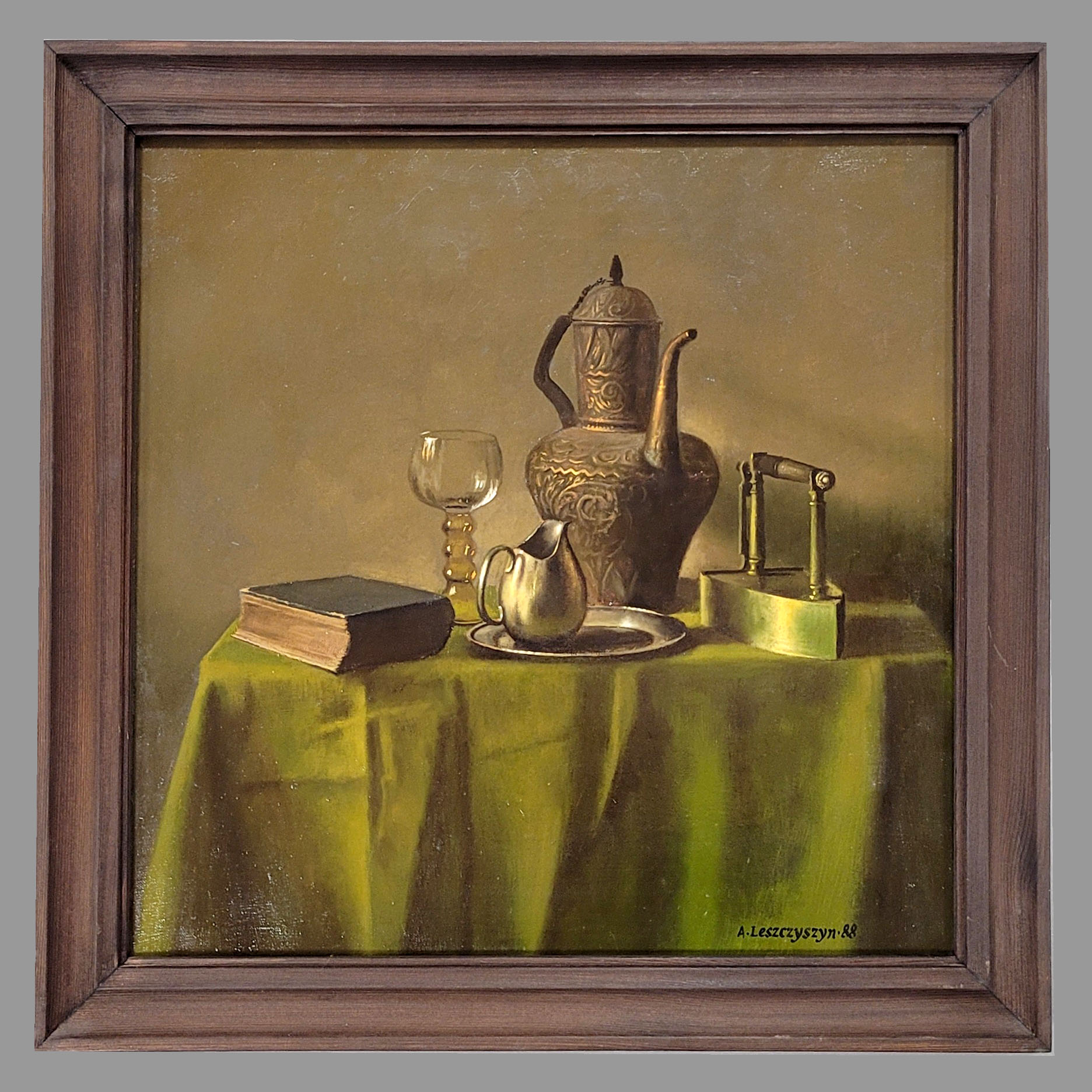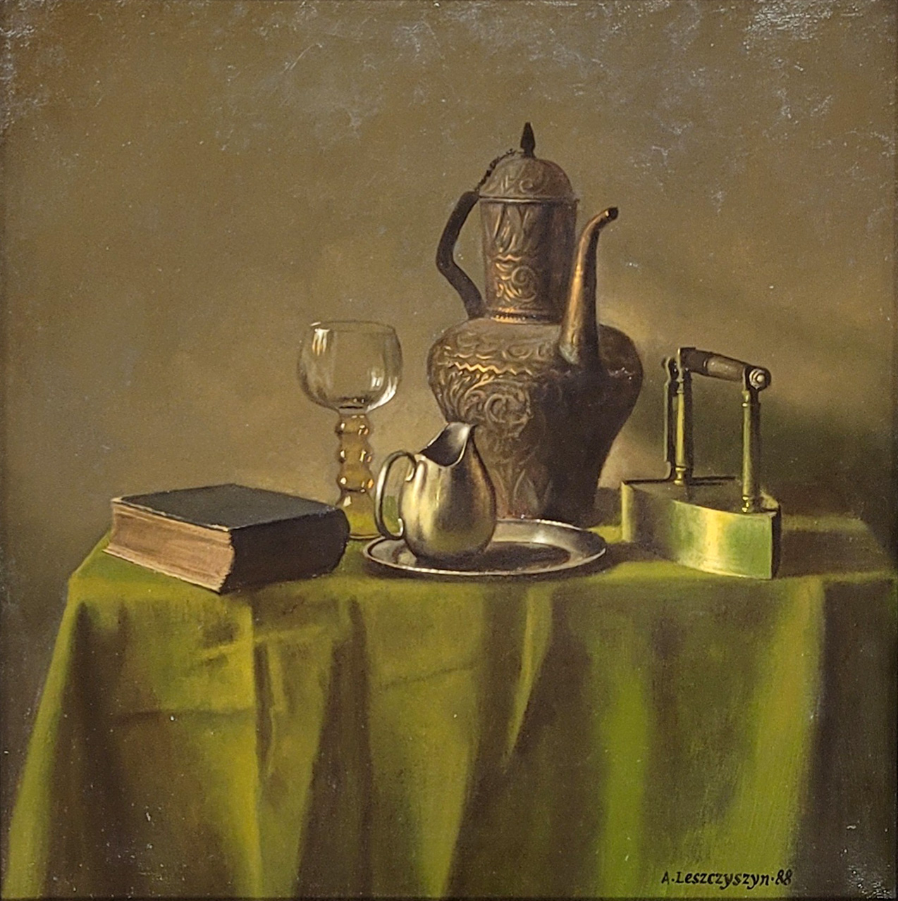 LESZCZYSZYN, Andreij (1940-1996): StillebenÖl auf Leinwand, signiert und datiert (19)88 unten rechts, verso auf dem Keilrahmen Adresse des Künstlers, 49 x 48.5 cm, Rahmen