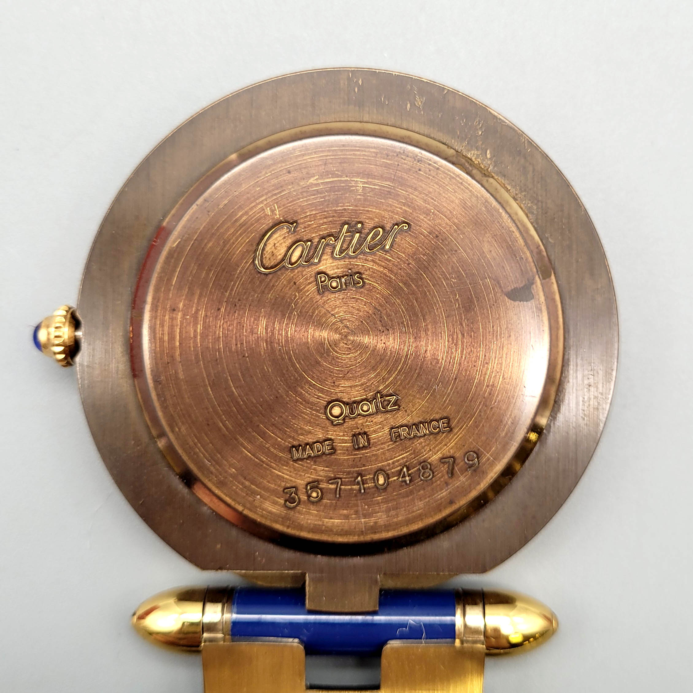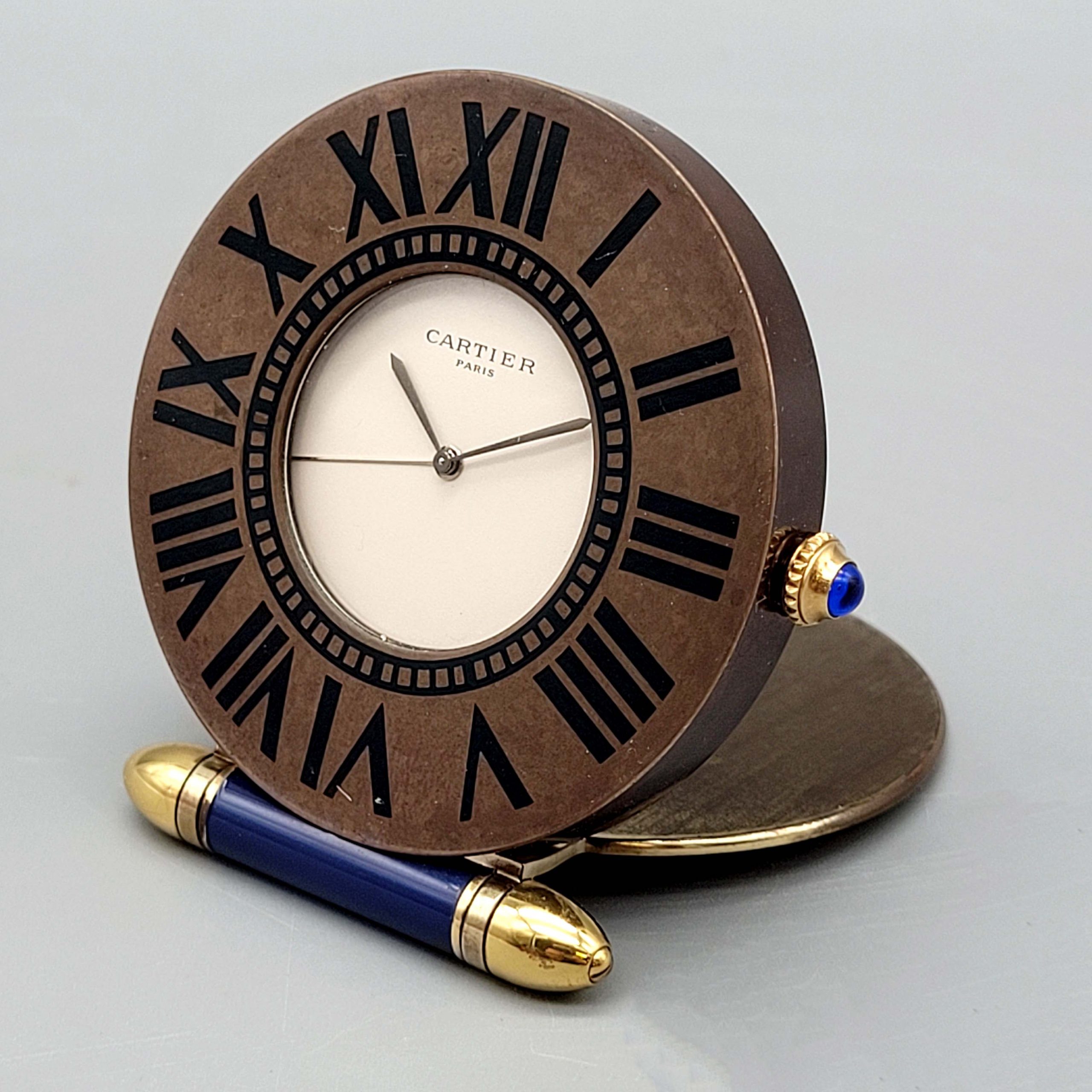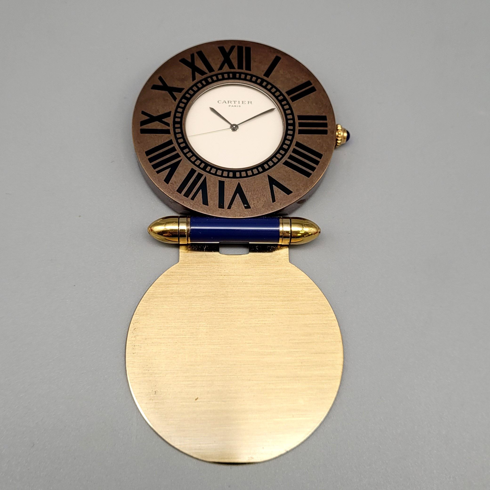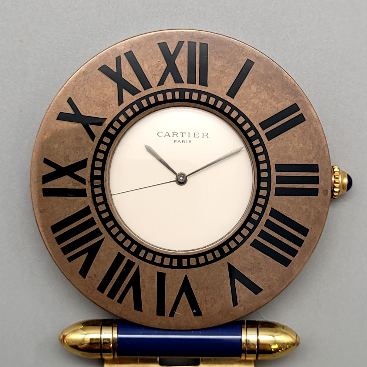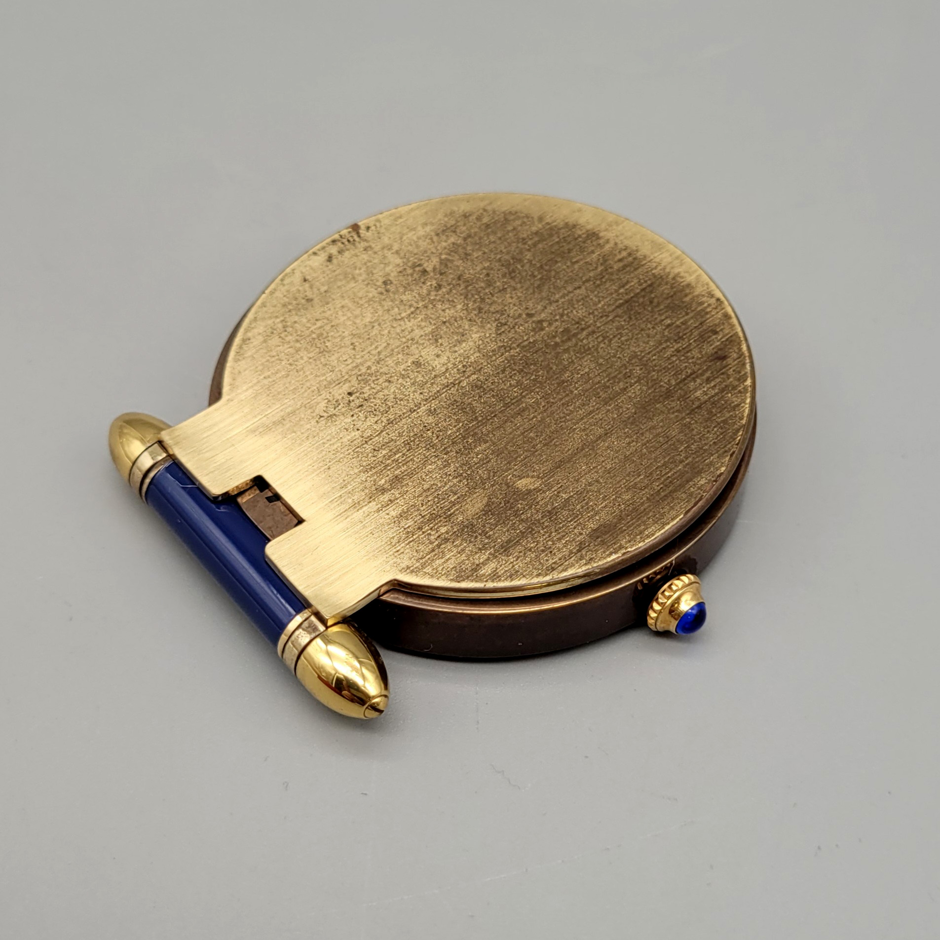 Messing, Lapislazuli, Krone mit blauem Farbstein, Ziffernring mit römischer Stundenanzeige und Minutenbalken, Quartzuhrwerk, Höhe 6 cm, Durchmesser (ohne Krone) 5,5 cm