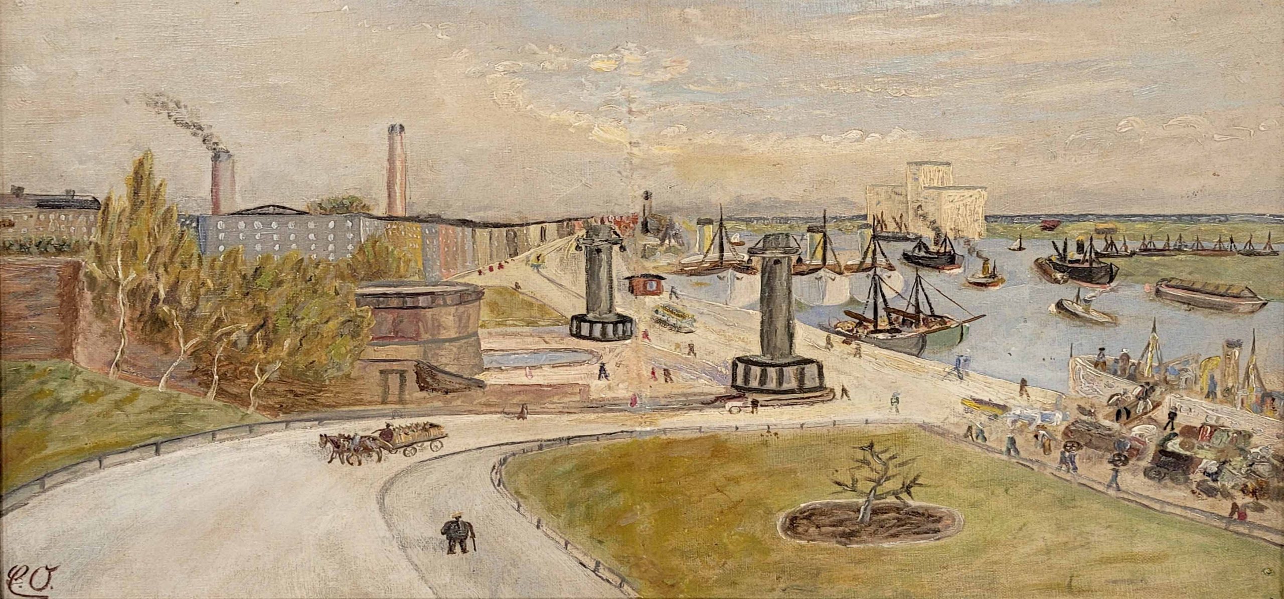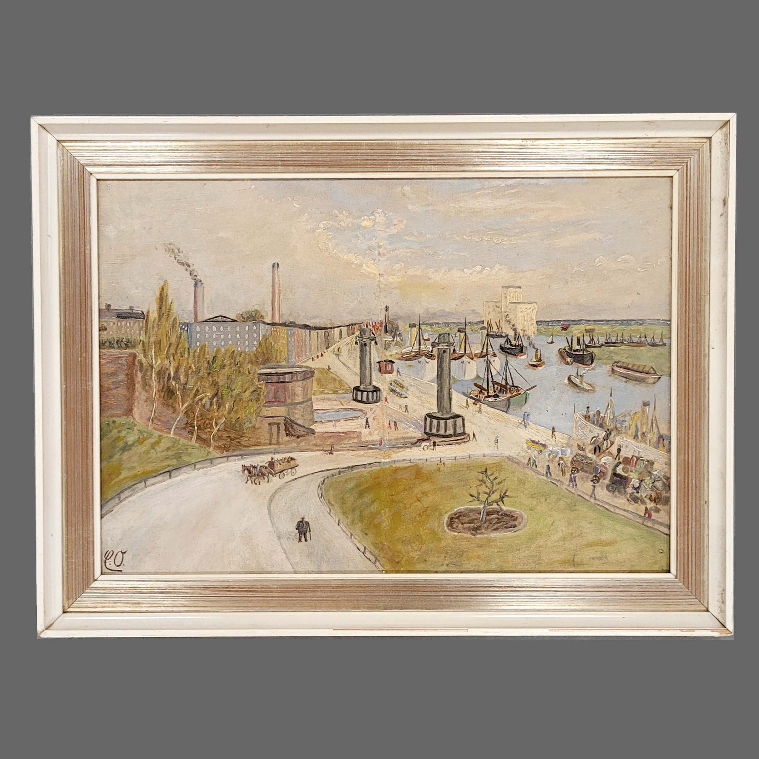 DEUTSCHER MEISTER (tätig um 1900): Bau der Südbrücke mit Blick auf die Aurora-MühleÖl auf Malkarton, monogrammiert „C.O.“ unten links, 40 x 58,5 cm, Rahmen
