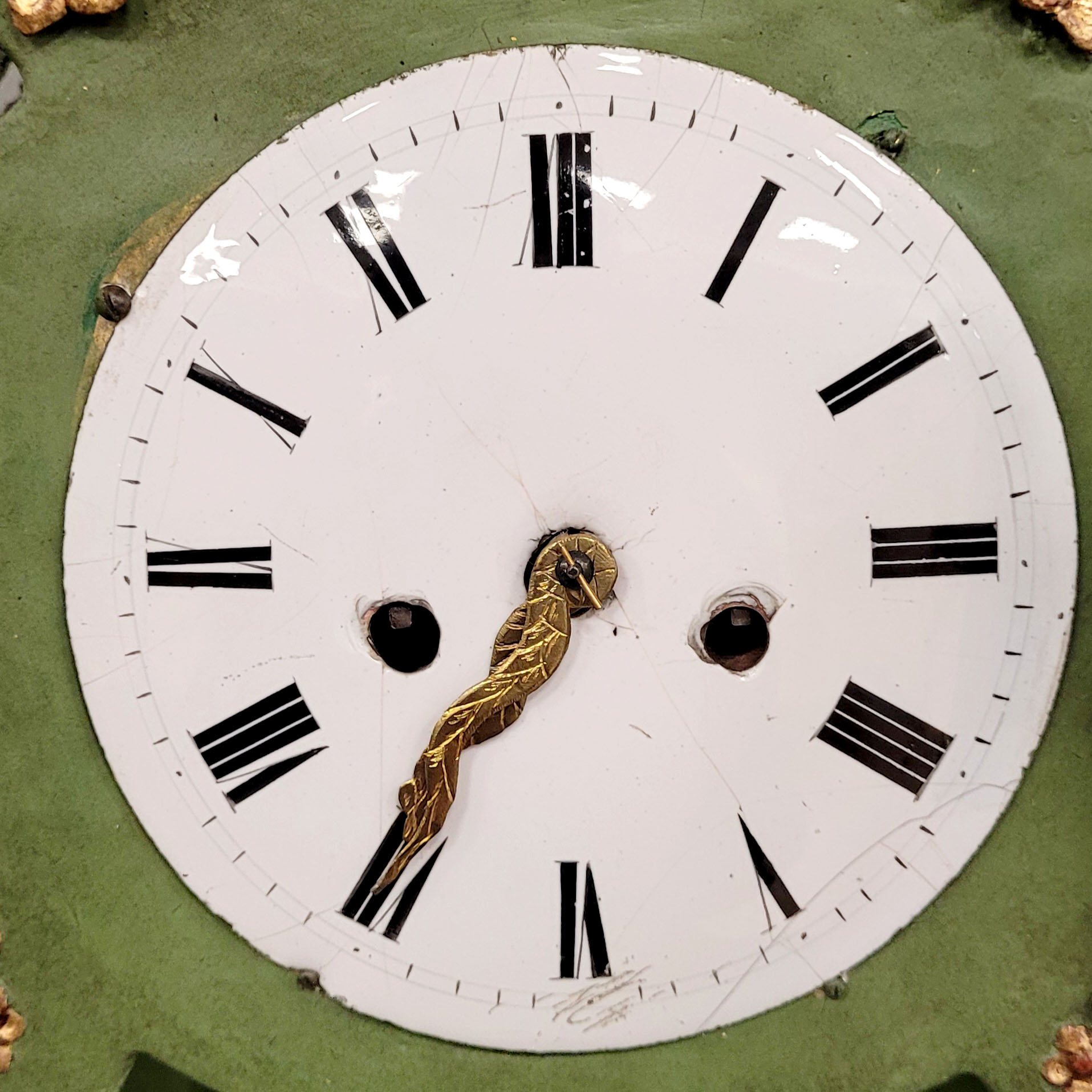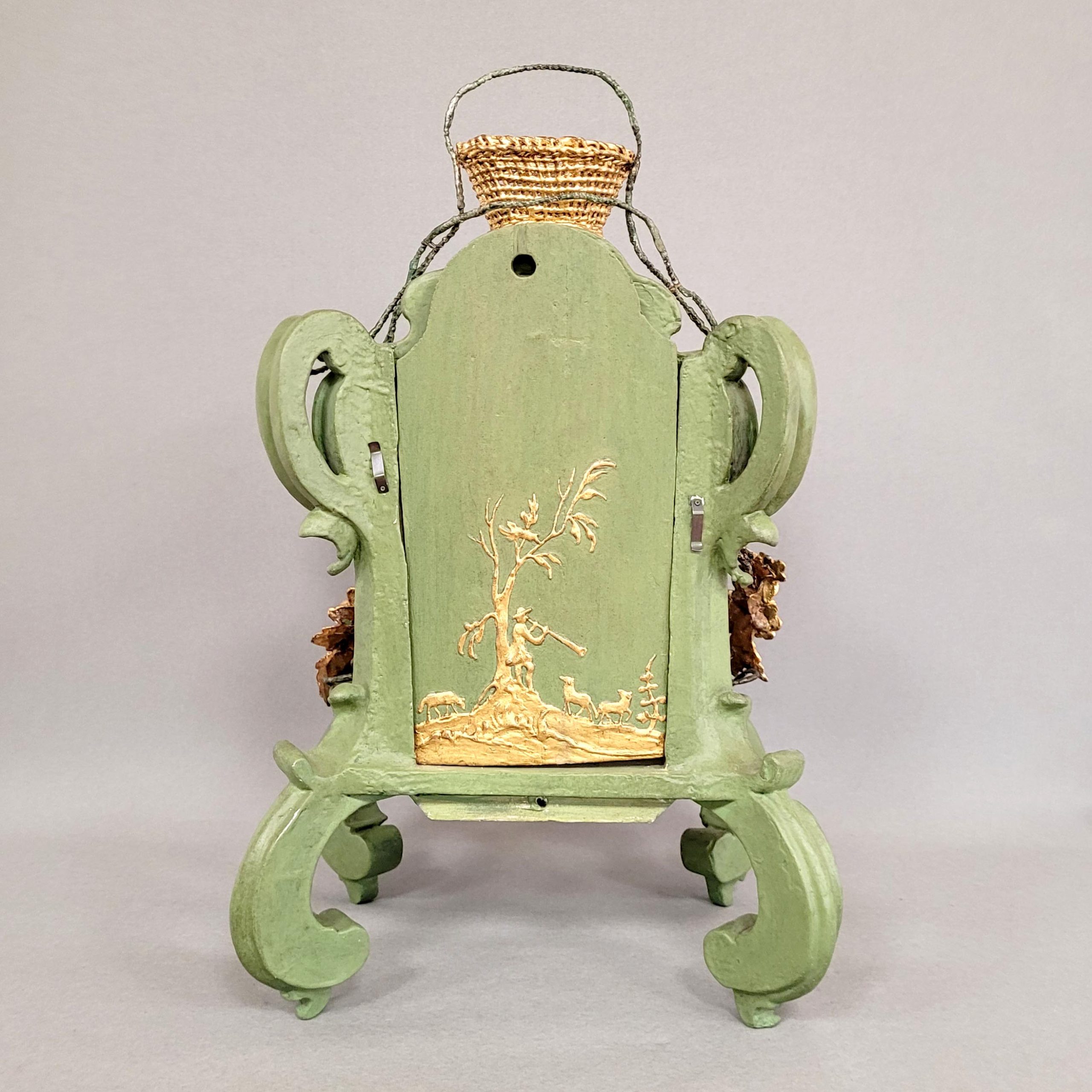 Gehäuse Holz, geschnitzt, grün gefasst und vergoldet, Blüten- und Trauben, Verschlussbrett mit vergoldetem Relief eines Schäfers mit seiner Herde, Glasdeckel, Emaille-Zifferblatt mit römischer Stundenanzeige und Minutenbalken, Pendelwerk, Fadenaufhängung (Pendel fehlt), Halbstundenschlag auf Glocke, wohl Schweiz 18. Jahrhundert, Höhe 54 cm (Uhrwerk läuft an) Prov.: Bischer, München Wolf Inden, Jülich)