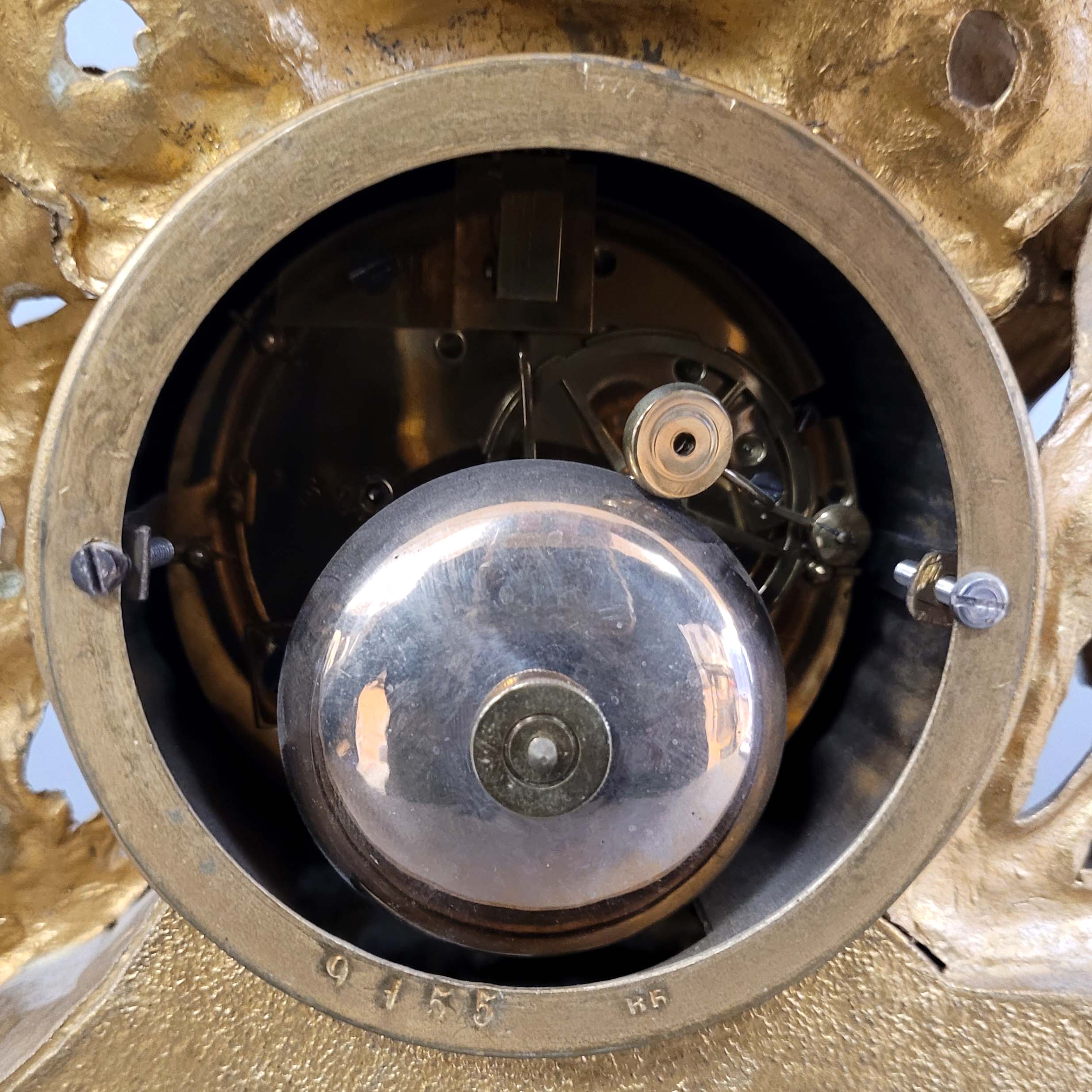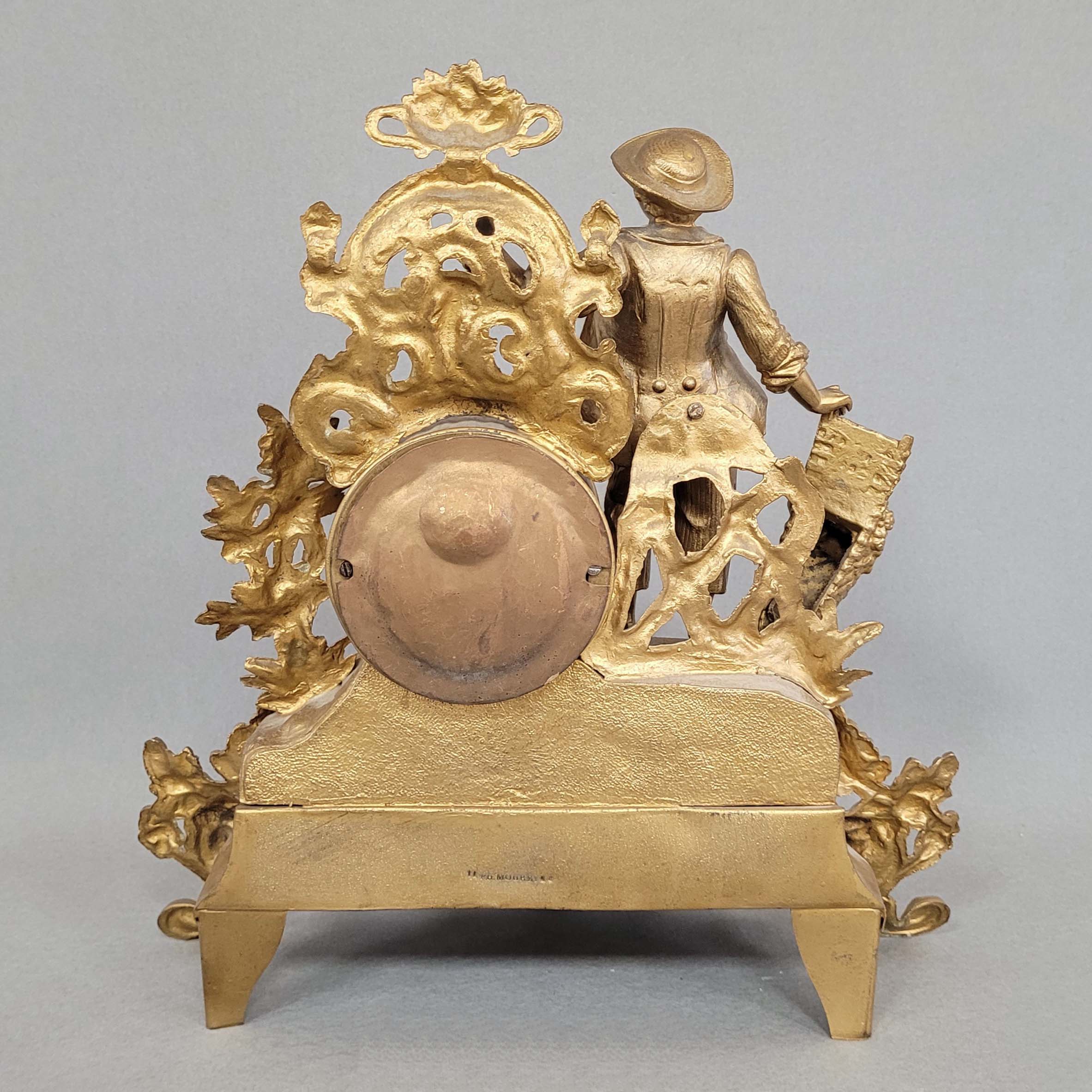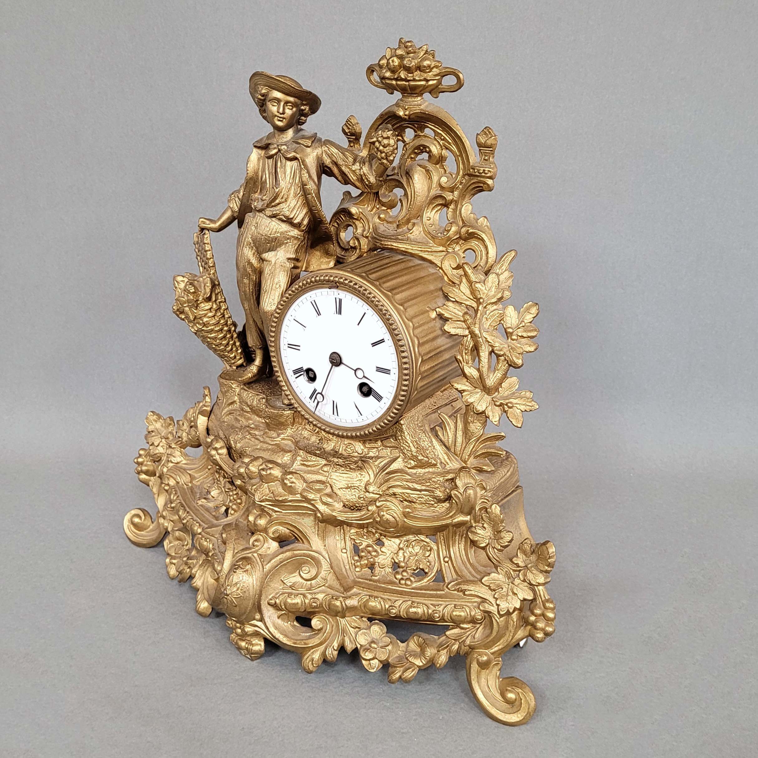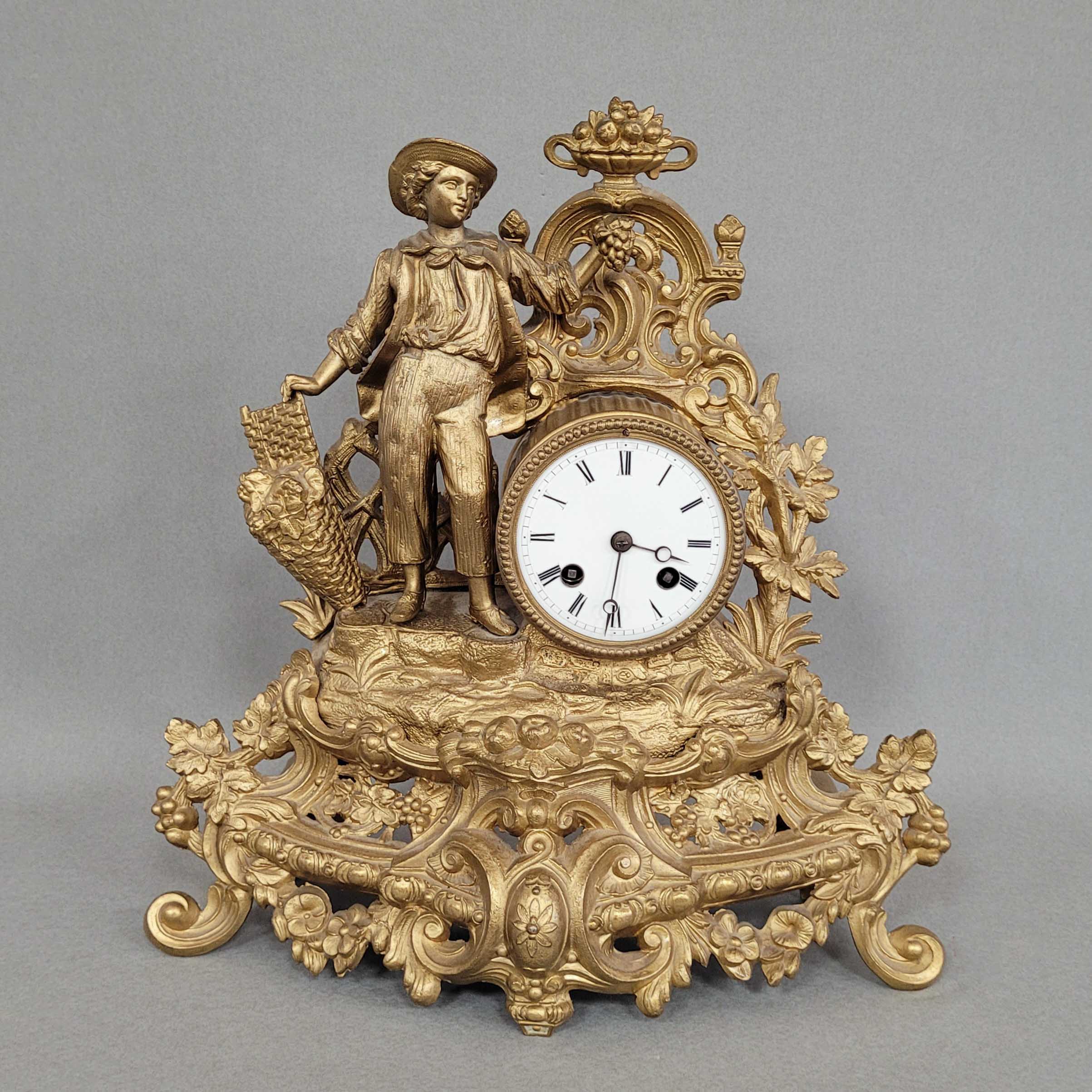 Gehäuse, Spritzguss, bronziert, mit Winzerfigur, Emaille-Zifferblatt mit römischer Stundenanzeige und Minutenbalken, 8-Tage-Pendelwerk, Schlag auf Glocke, Frankreich, Ende 19. Jahrhundert, Höhe 34 cm (Uhrwerk läuft an, Uhrwerk überholt 2007)