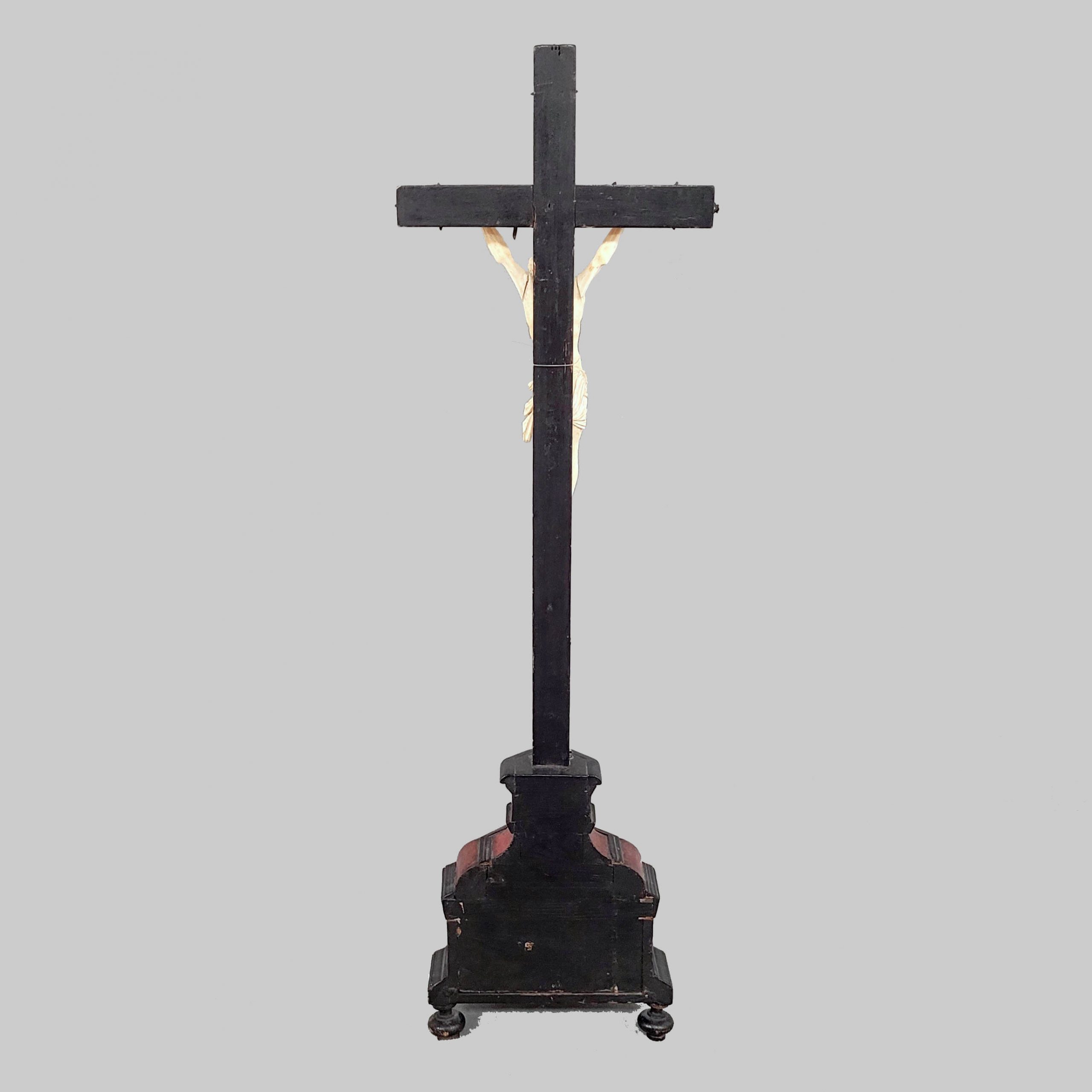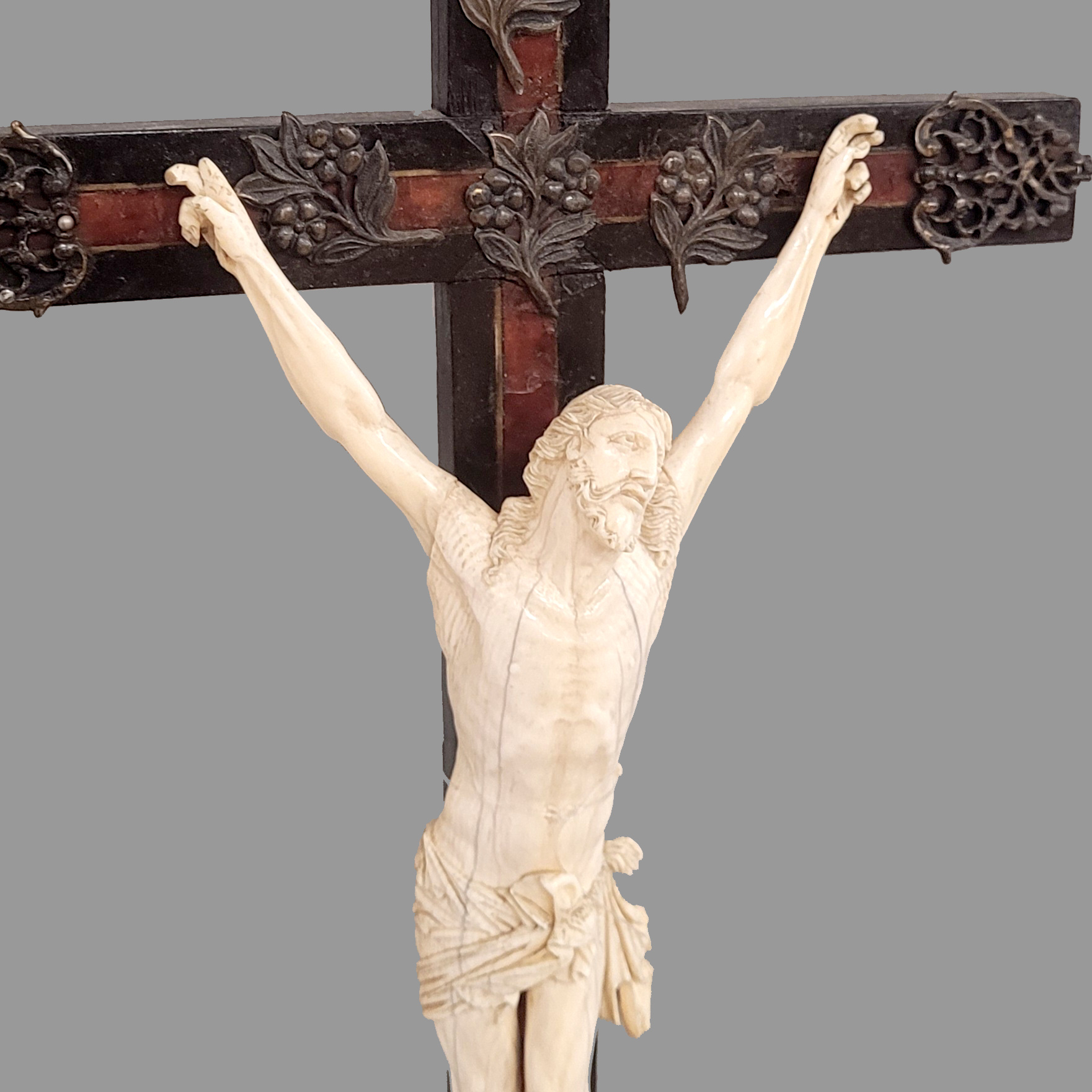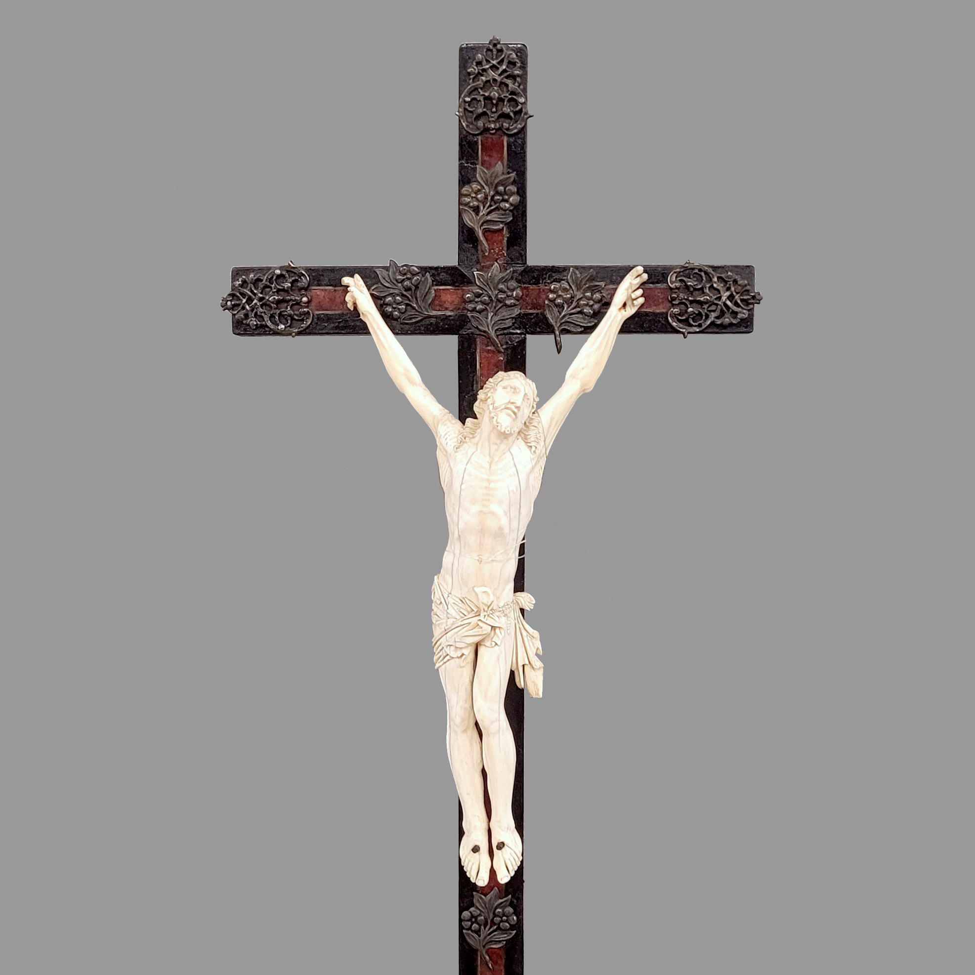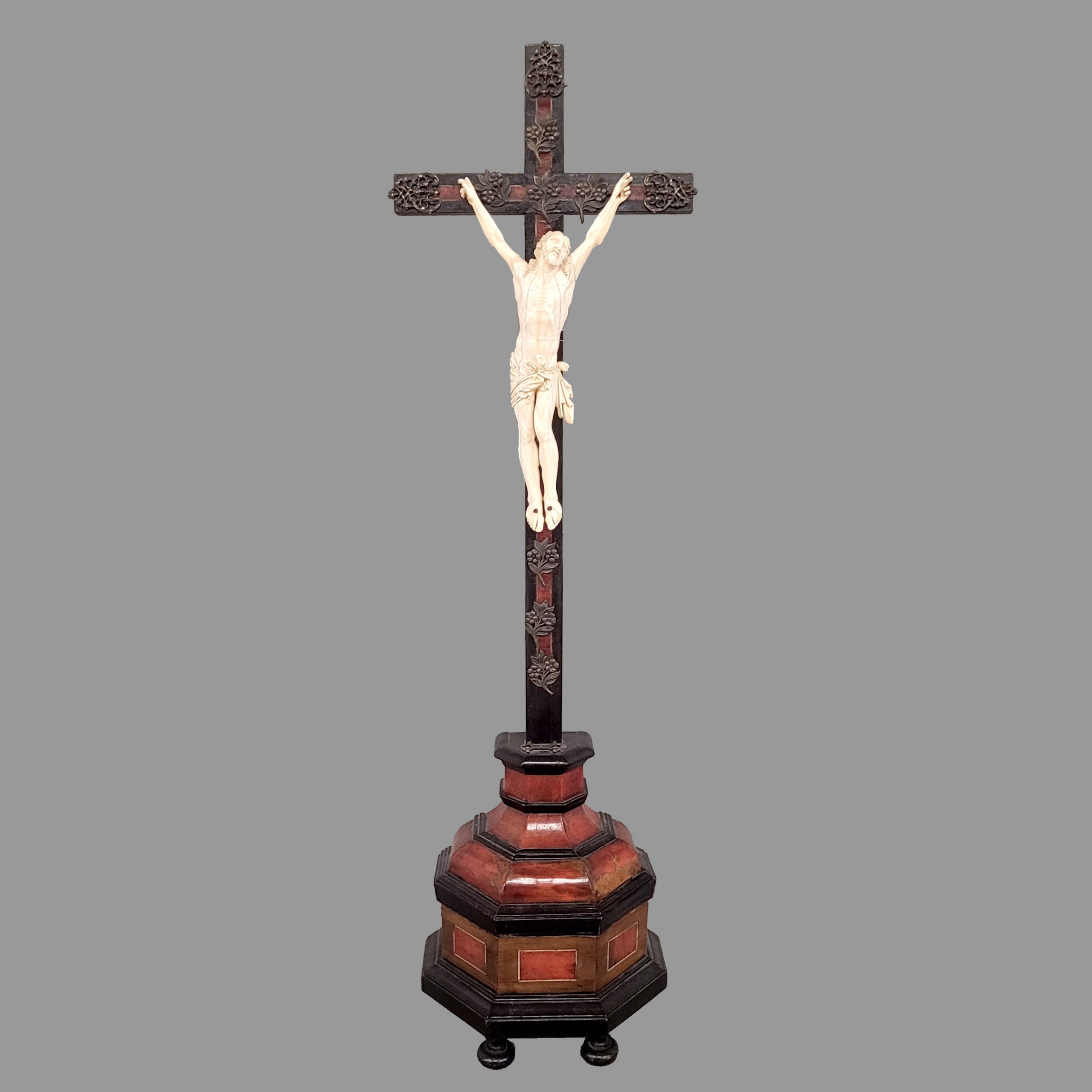 StandkreuzFuß und Kreuz, Holz, partiell geschwärzt, Schildpatt-Imitat, Perlmuttfadenintarsien, silberne Beschläge, Corpus Elfenbein, vollrund geschnitzt, Flämisch, um 1700, Höhe Corpus 23,5 cm, Gesamthöhe 66 cm