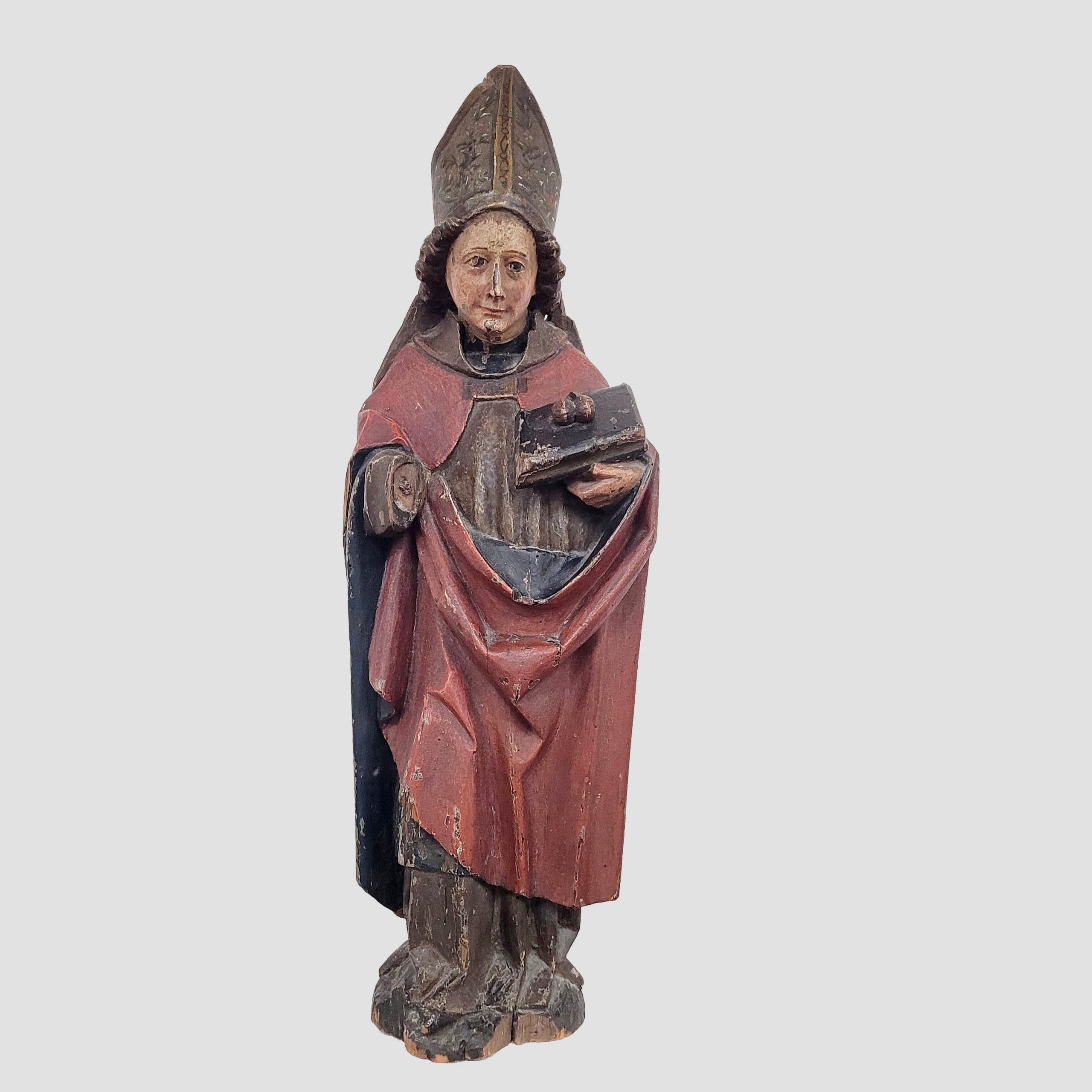 Heiliger BrictiusEiche, vollrund geschnitzt, ältere, zum Teil barocke farbige Fassung, Flämisch, um 1480, Höhe 63 cm