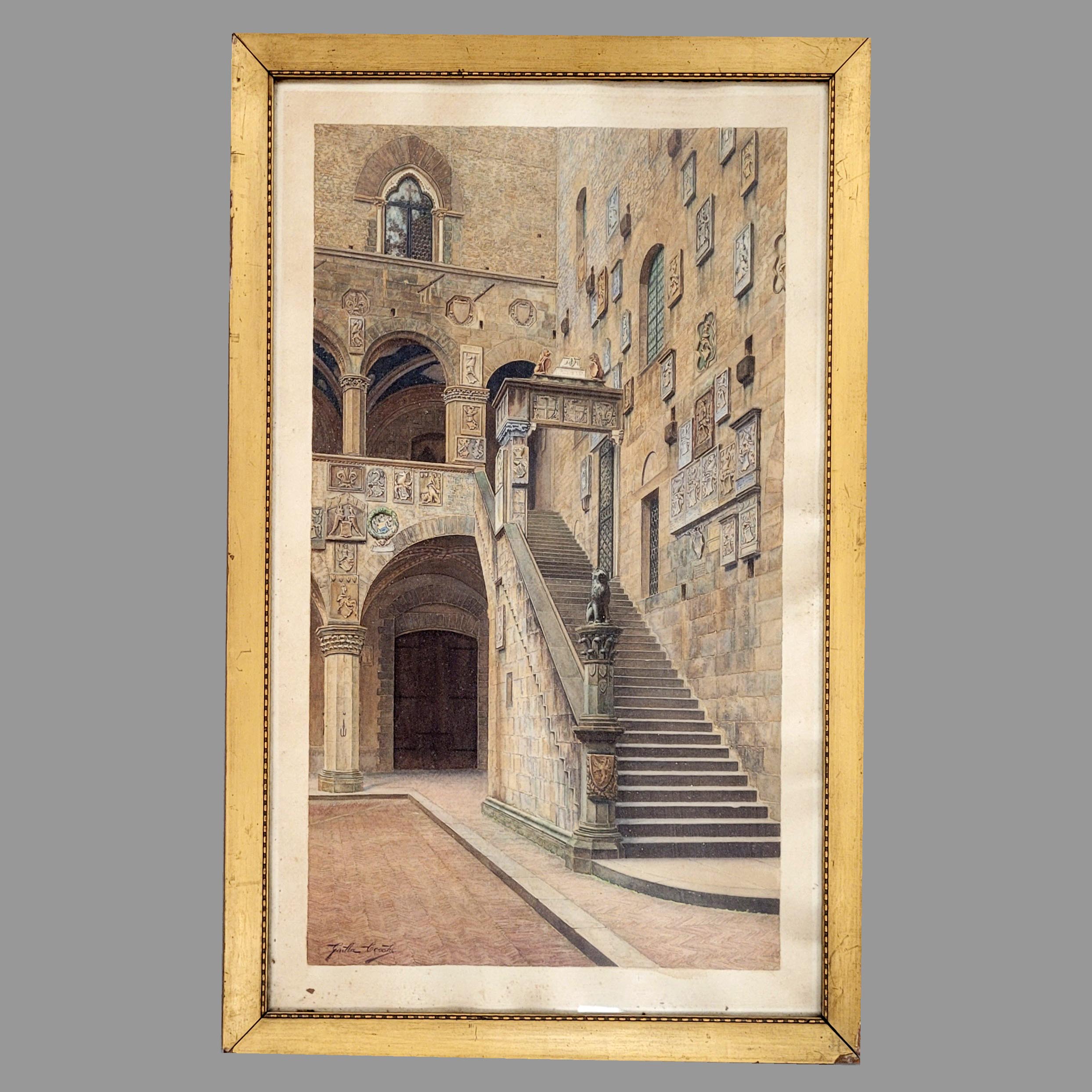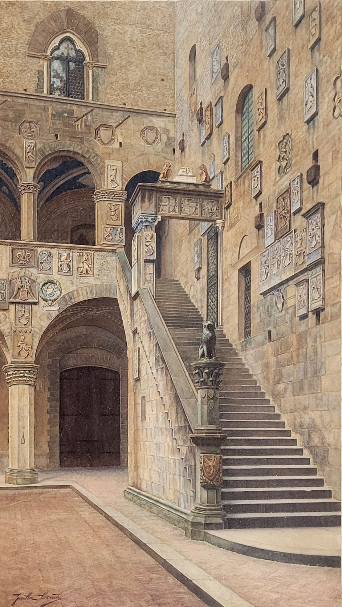 CECCHI, Giulia (tätig 19. Jh.): Treppe im Innenhof des Palazzo Bargello in FlorenzAquarell auf Papier, signiert unten links, 73 x 43 cm, gerahmt unter Glas (etwas lichtrandig)
