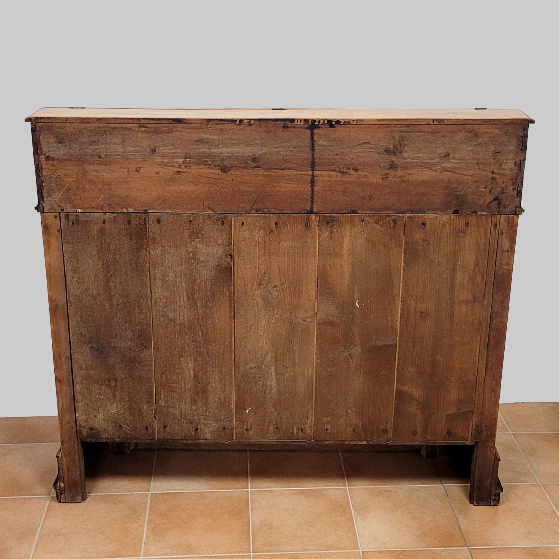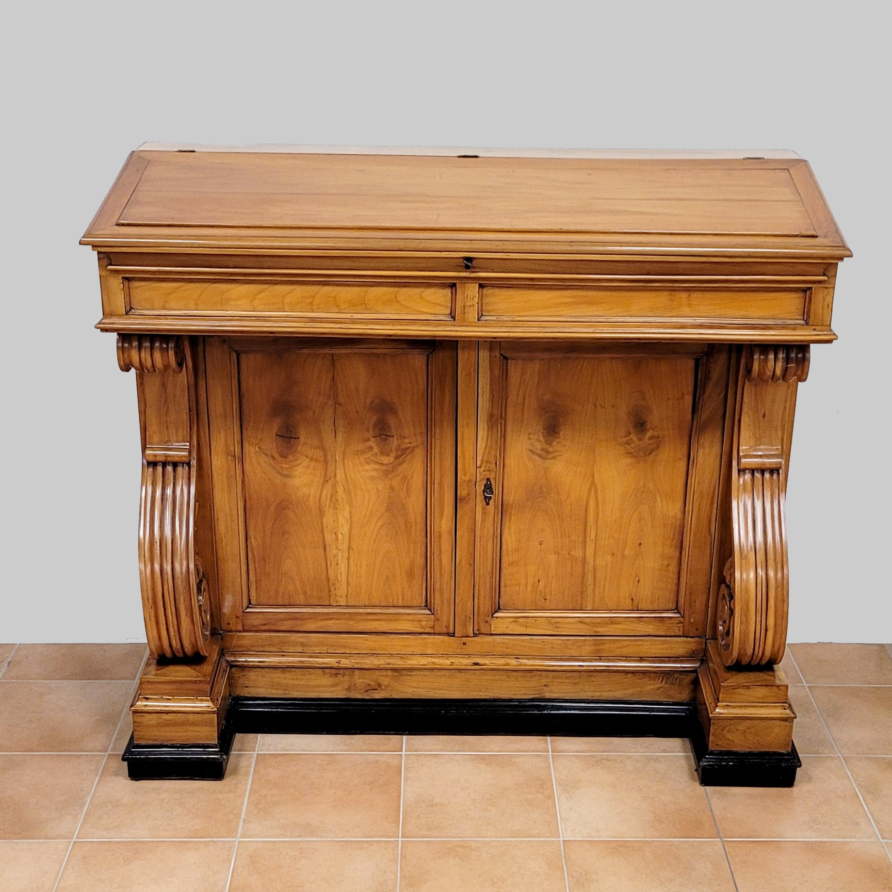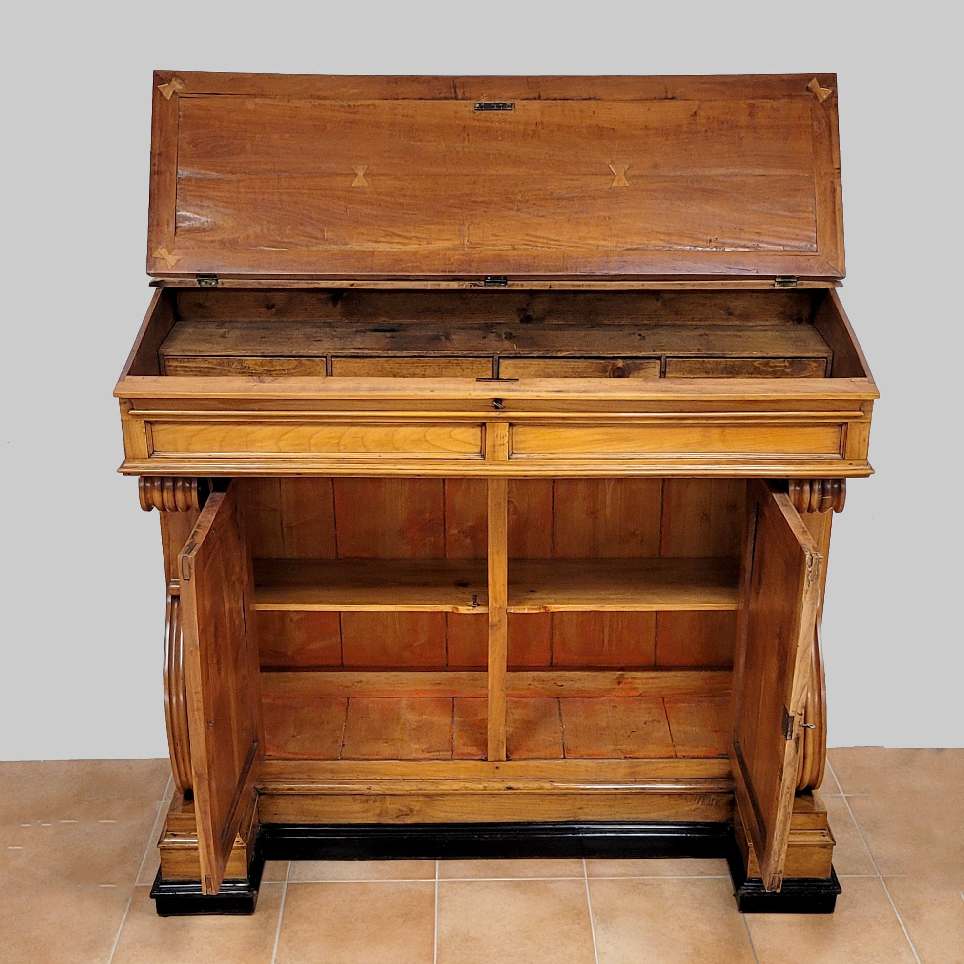 Kirschholz furniert auf Weichholz, ausgestellte Sockelplatte aus ebonisiertem Holz, Volutenbeine (eines leicht gelöst), Unterbau zweitürig, Schrägklappe als Schreibfläche, innen Schubfächer, Süddeutsch, 19. Jahrhundert, 119 x 131 x 54 cm
