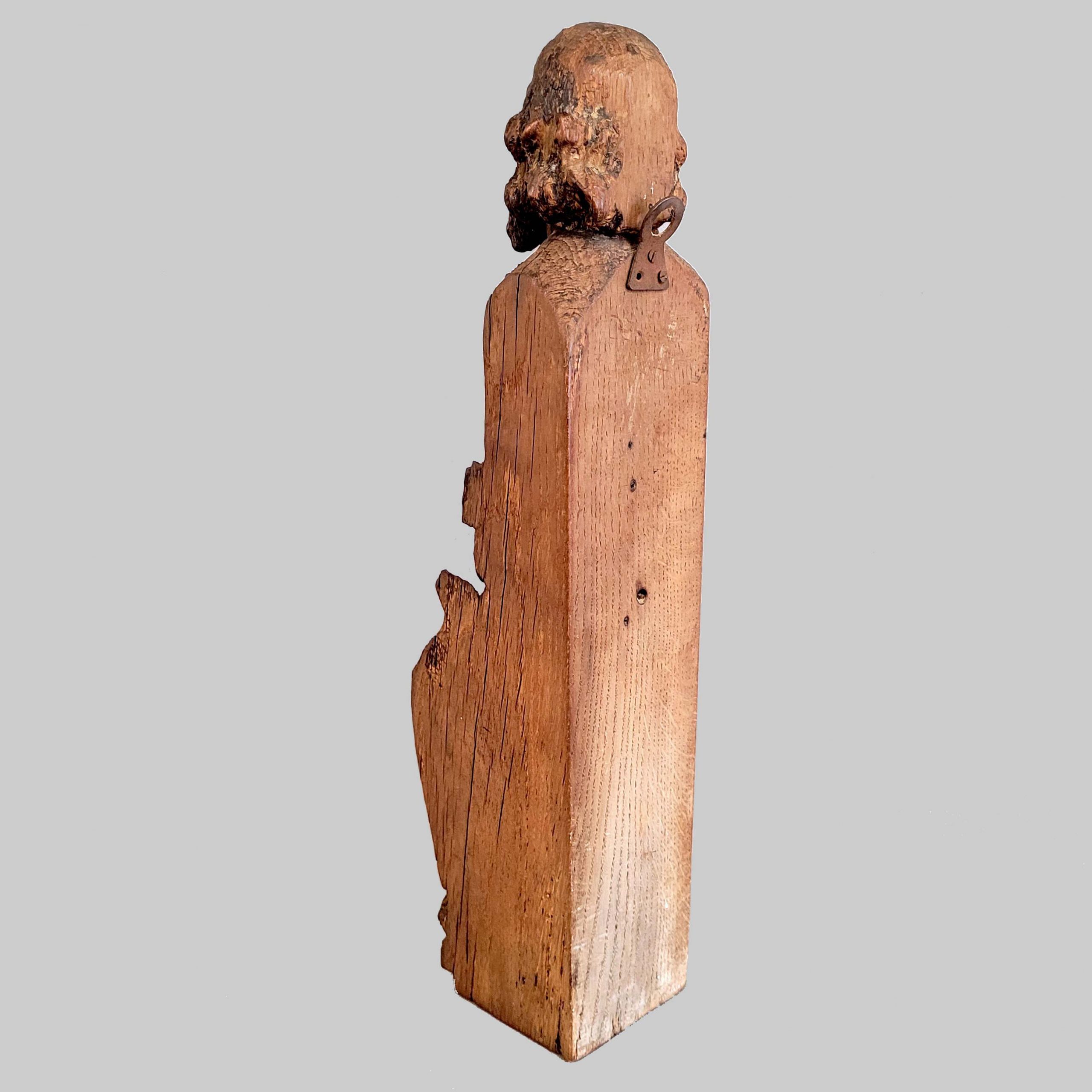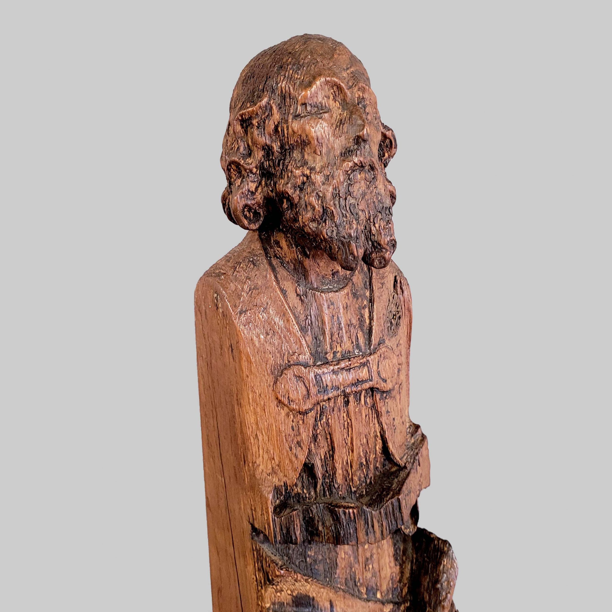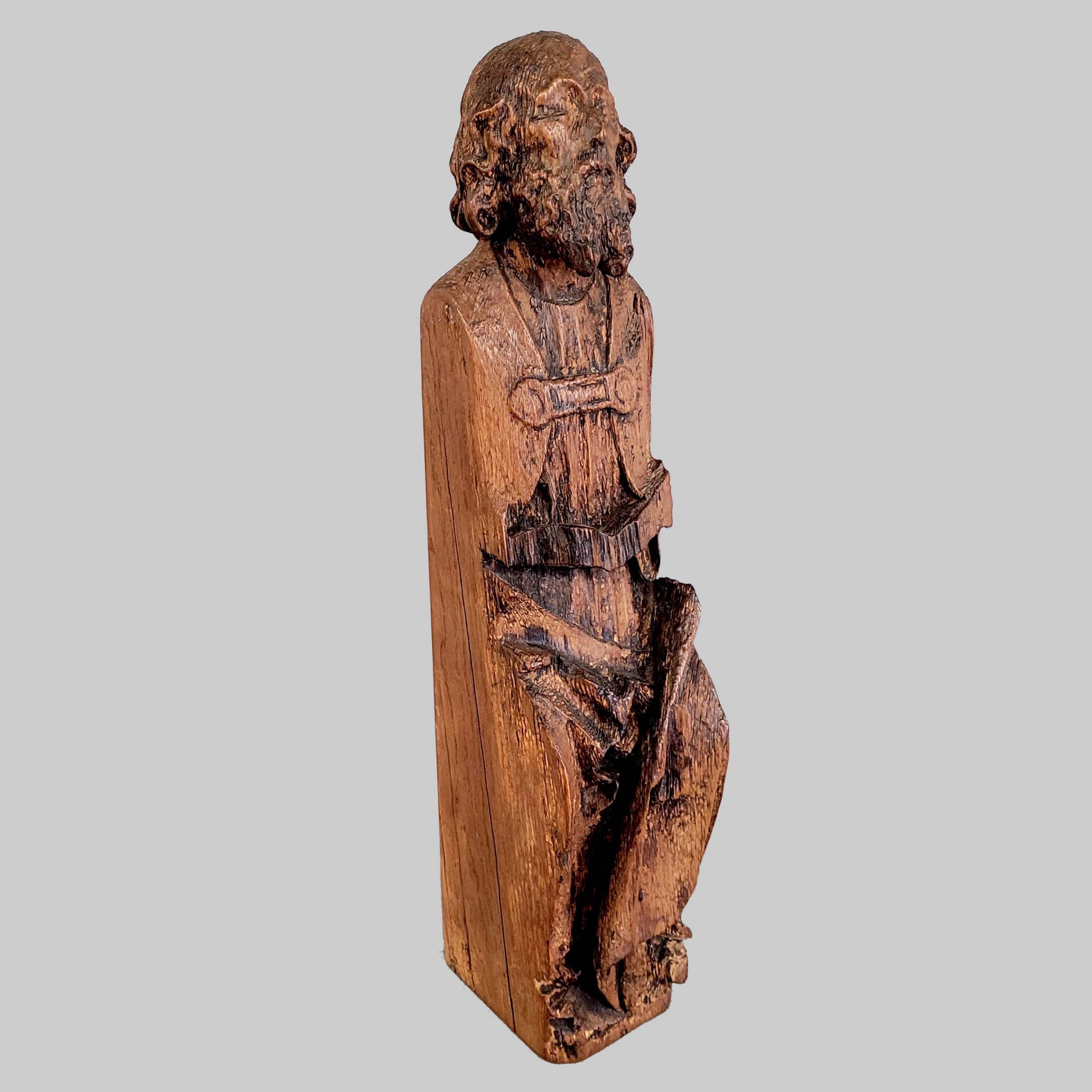 Sitzender ProphetEiche, geschnitzt, Reste von Patinierung, Teil einer Deckenkonstruktion oder eines Möbels, Flämisch / Rheinland, wohl 14. Jahrhundert, Höhe 52 cm