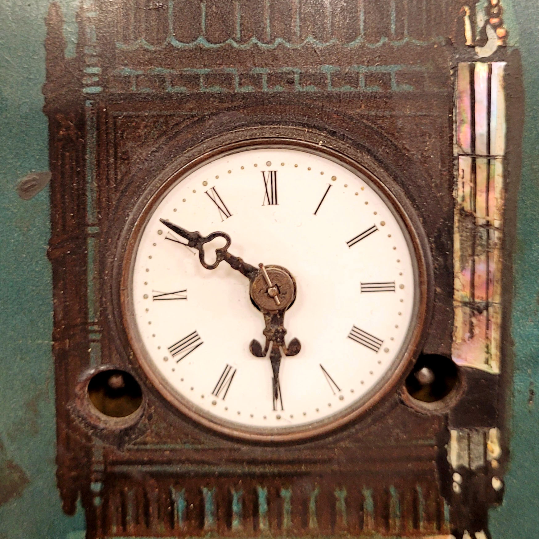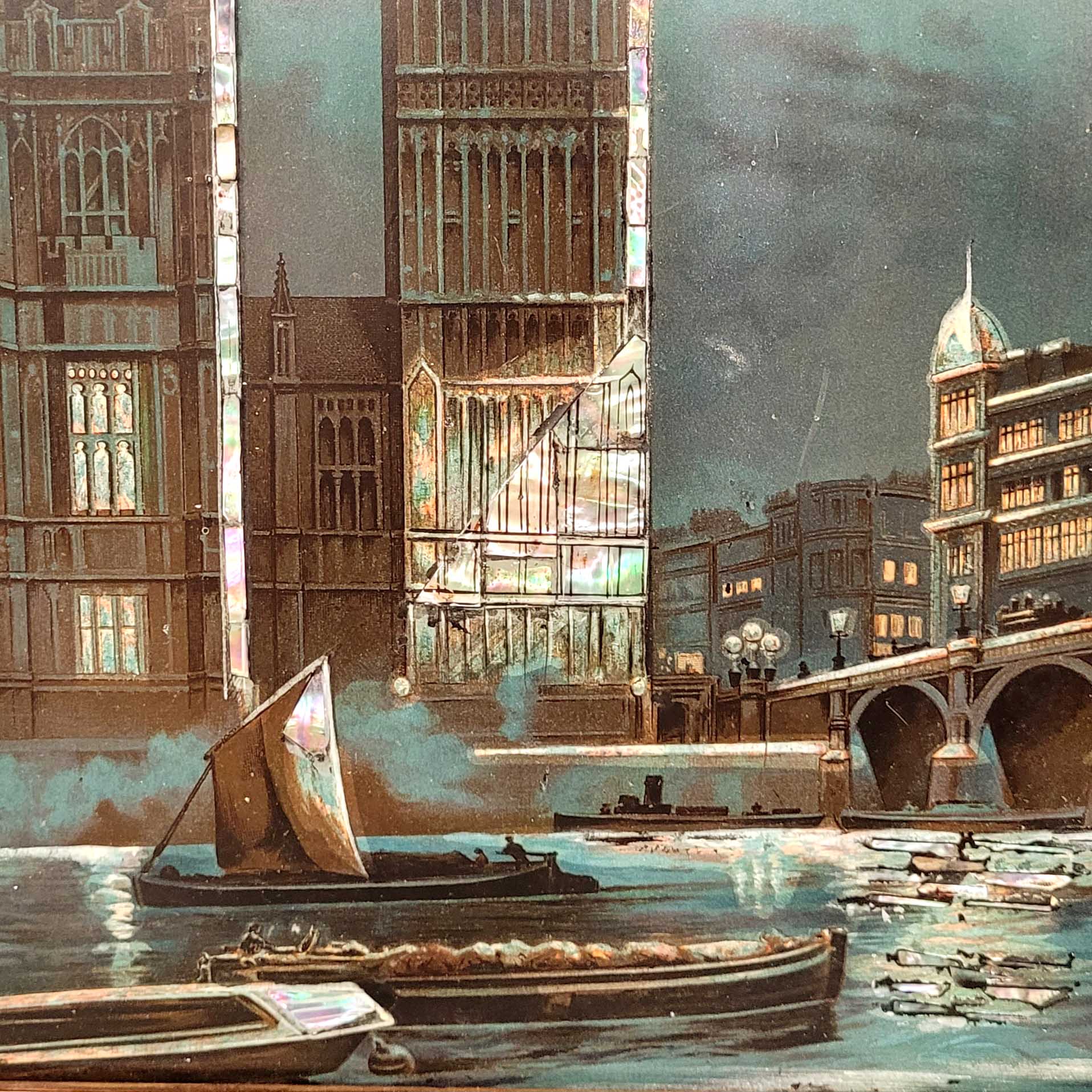 Bilderuhr mit Big Ben und Westminster Palace bei NachtLithographie auf Karton, partiell handkoloriert und mit Perlmutt-Einlagen versehen, Uhrwerk im Turm eingelassen (Uhrwerk läuft nicht an), Rahmen mit Metallbeschlägen, 69 x 54 cm