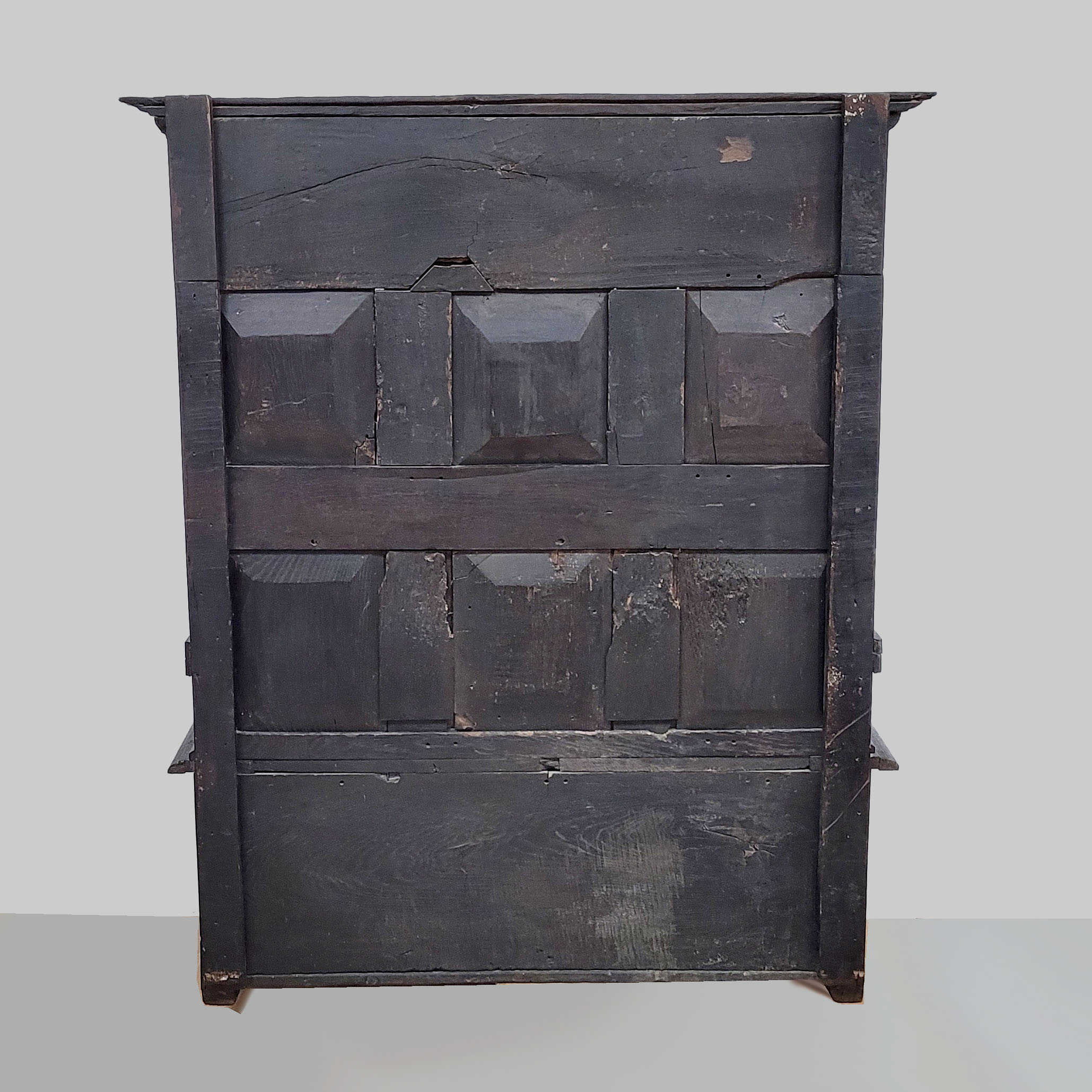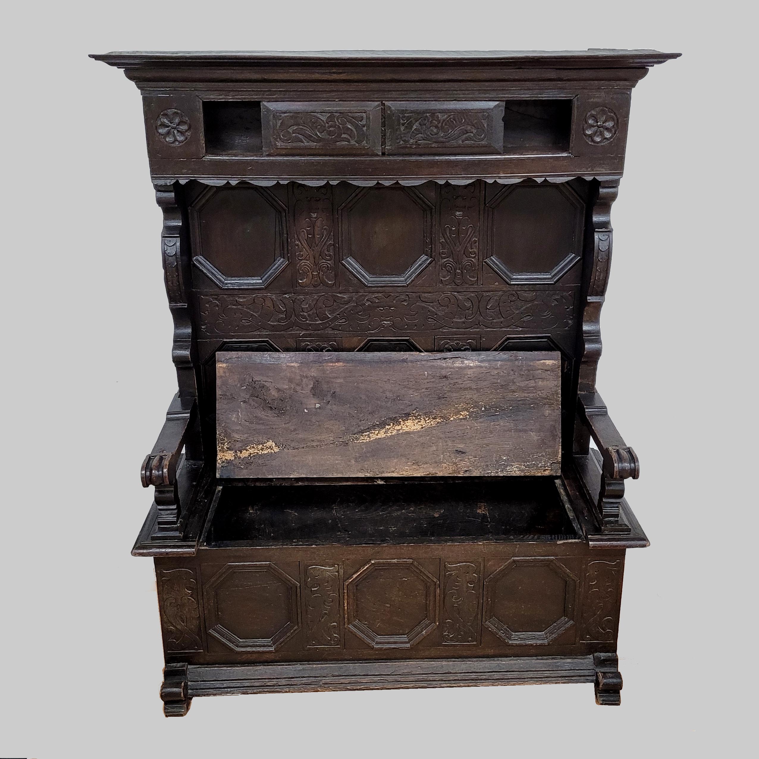 Eiche, geschnitzt, Kufenfüße, hohe reich geschnitzte Rückenlehne, Armlehnen, Gesims der Rückenlehne mit Schubfächern, Truhe mit drei Felderfüllungen, Norddeutsch, wohl Ende 18. Jahrhundert, 172 x 146 x 63 cm