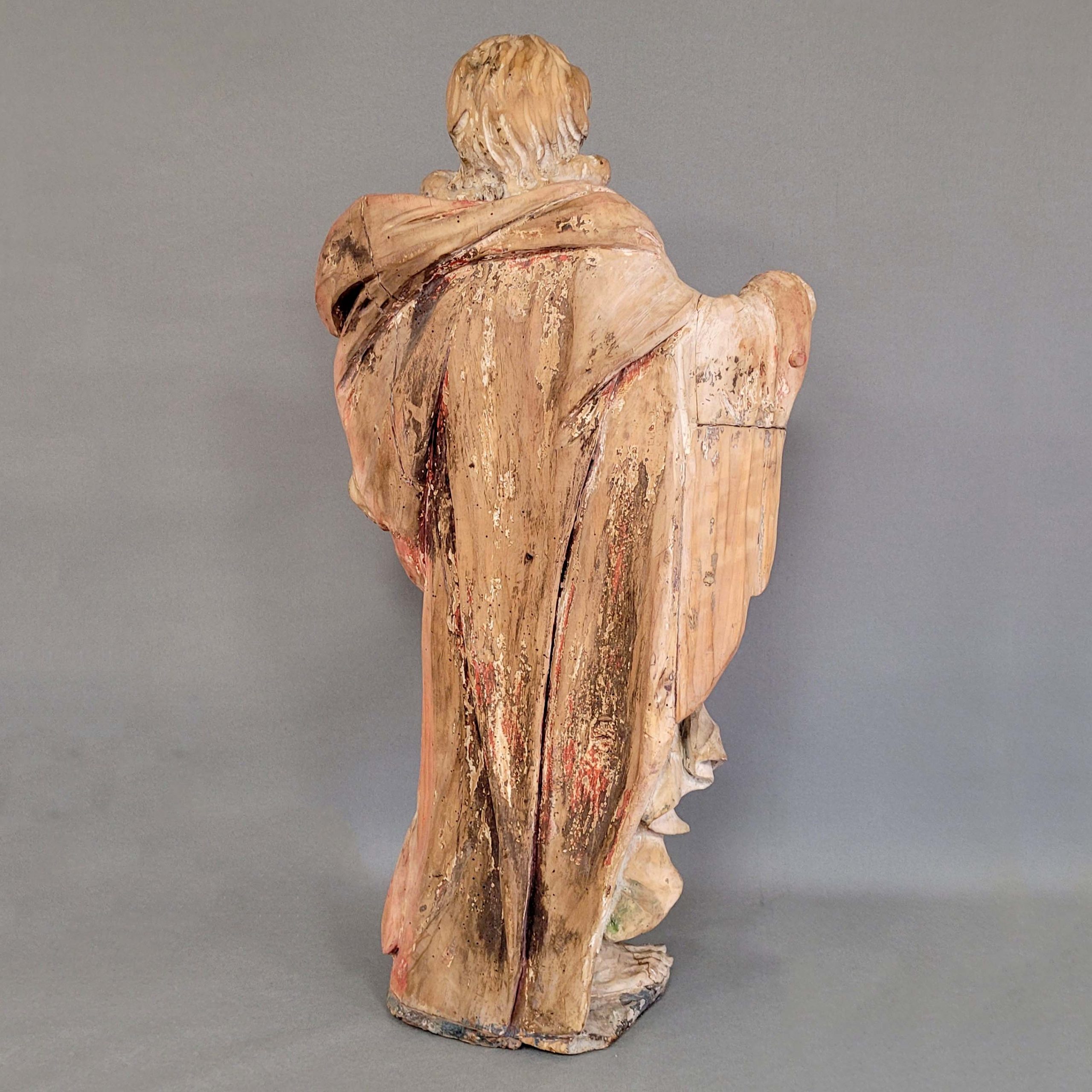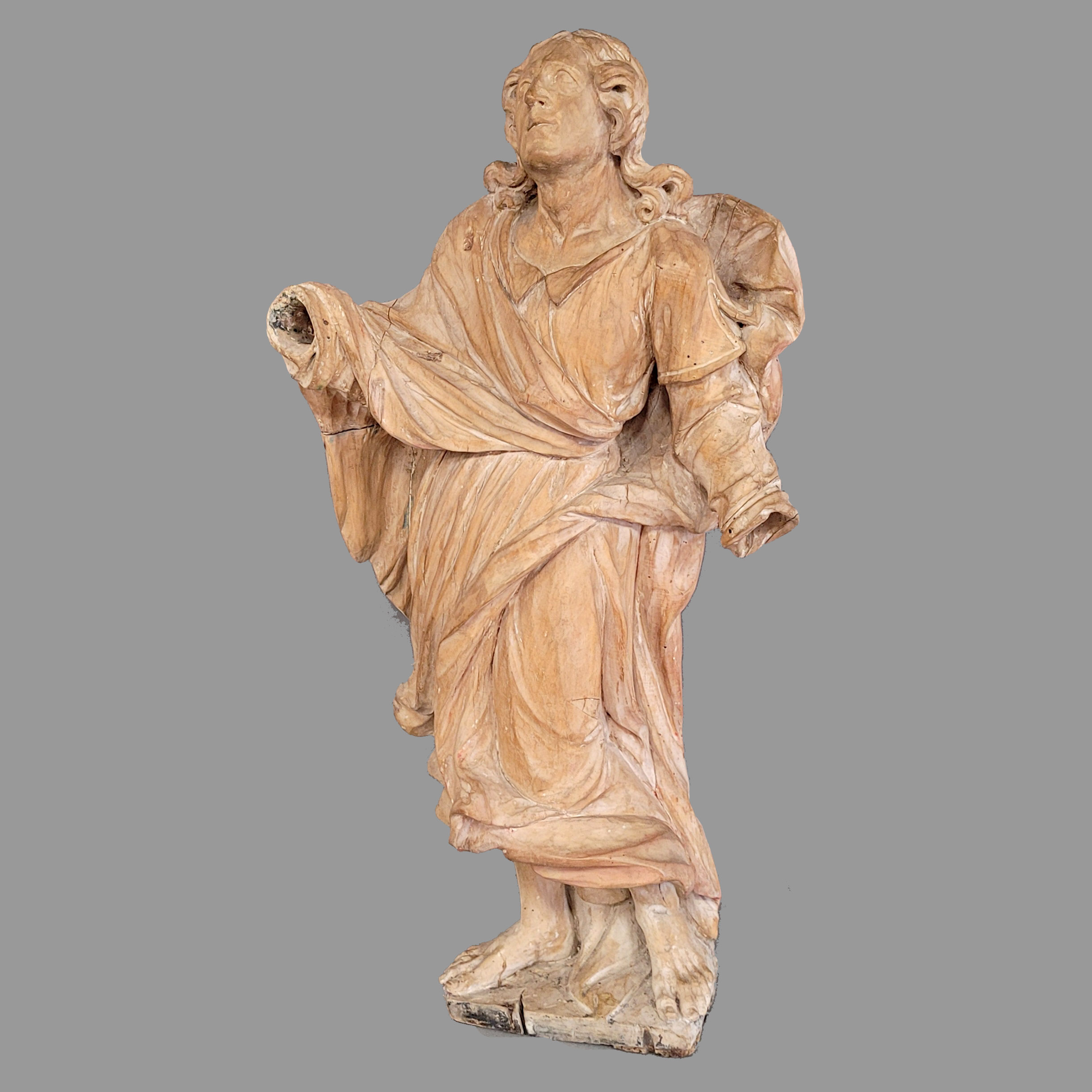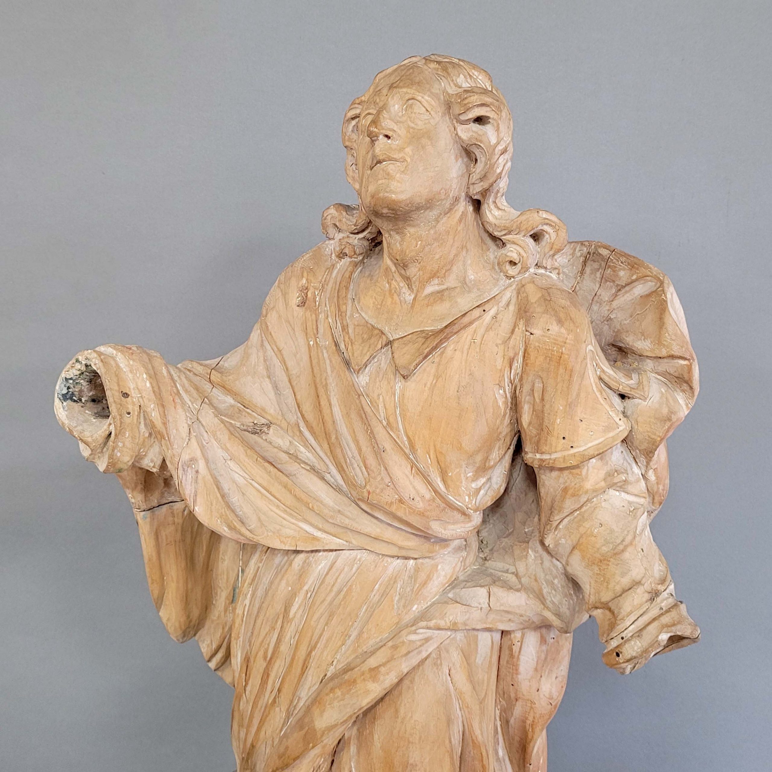 Heiliger Evangelist JohannesHolz, vollrund geschnitzt, geringe Reste einer alten Fassung, Tirol 17. Jahrhundert, Höhe 93 cm (neu geschnitzte Hände liegen bei)