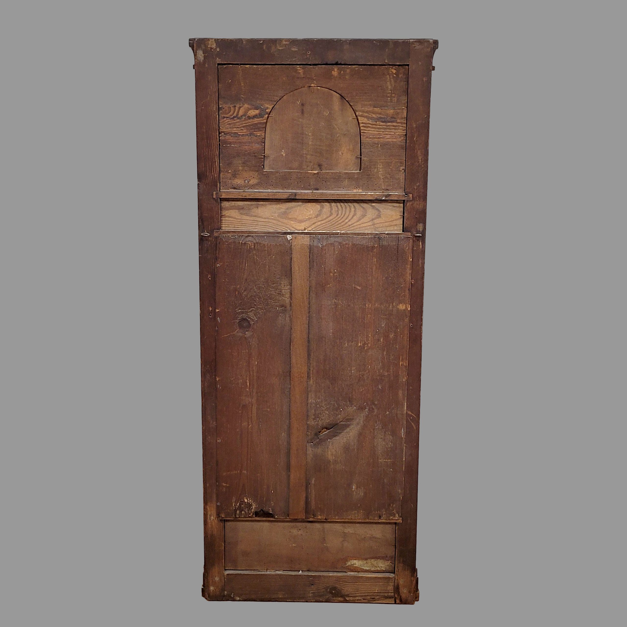 Kirschbaum, Kirschbaum Wurzelholz, ebonisiertes Holz furniert auf Weichholz, partiell vergoldet, Bronzebeschläge, im Giebel „Herkules beim Gastmahl der Hera auf dem Olymp“, modernes Spiegelglas, Süddeutsch, um 1820, 135 x 55 cm