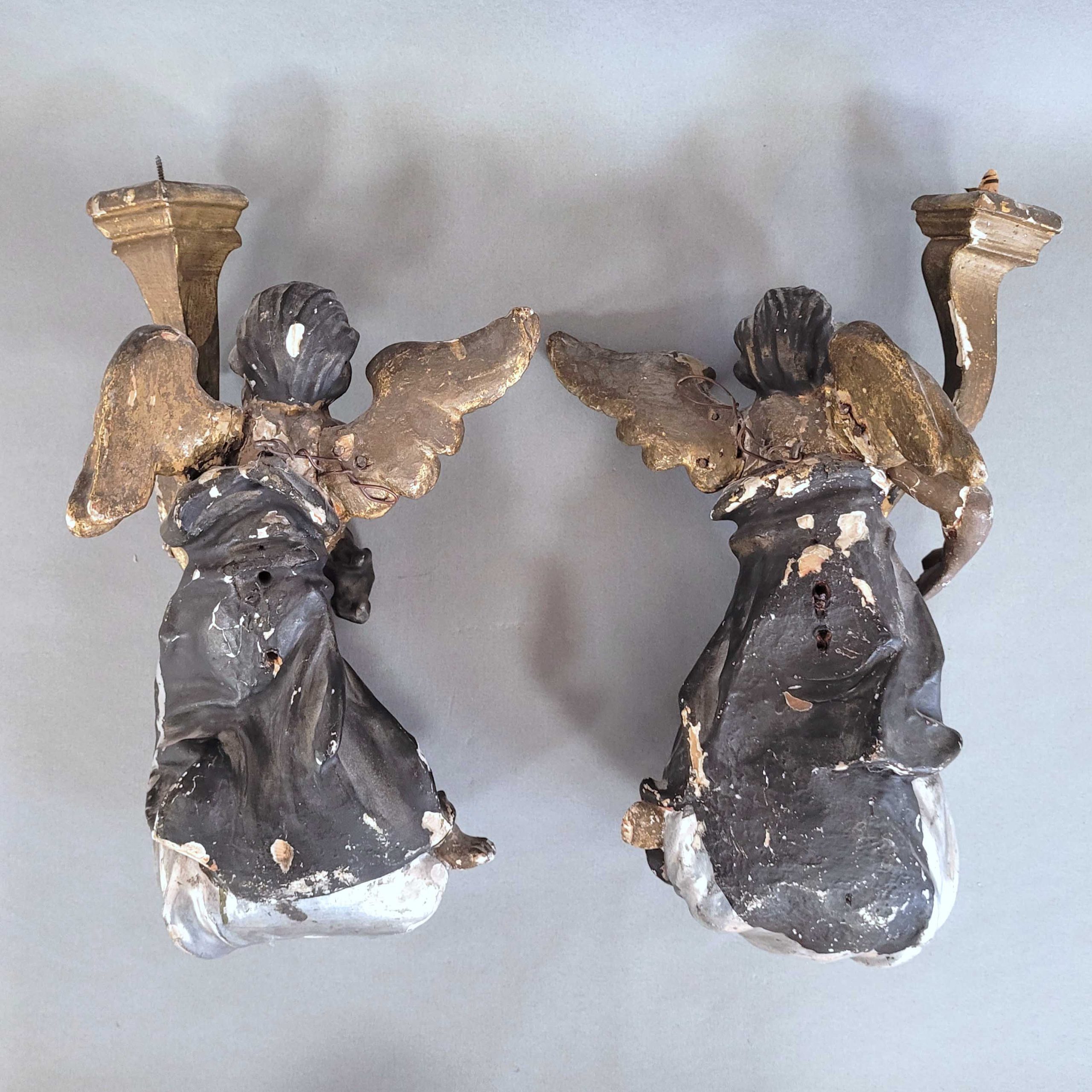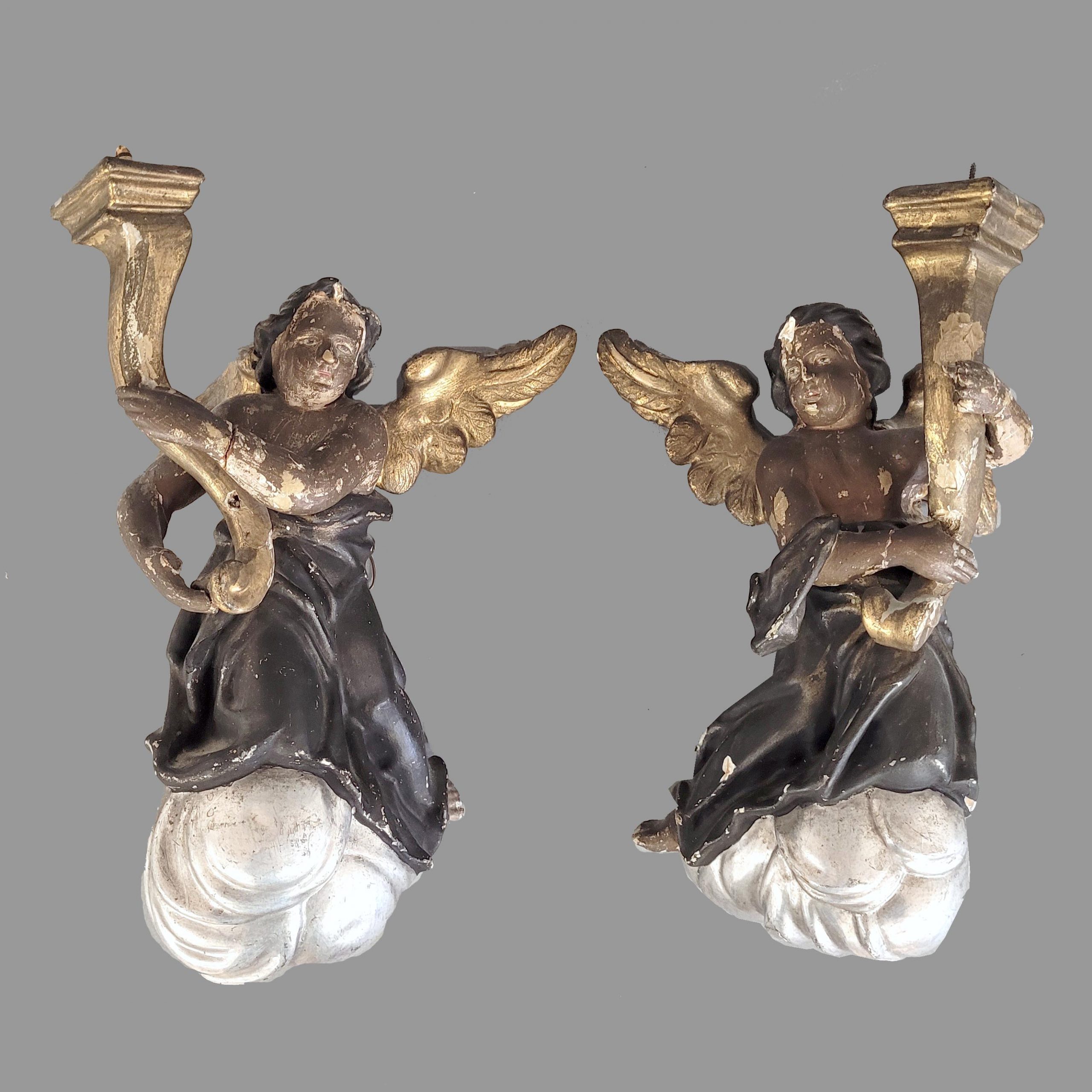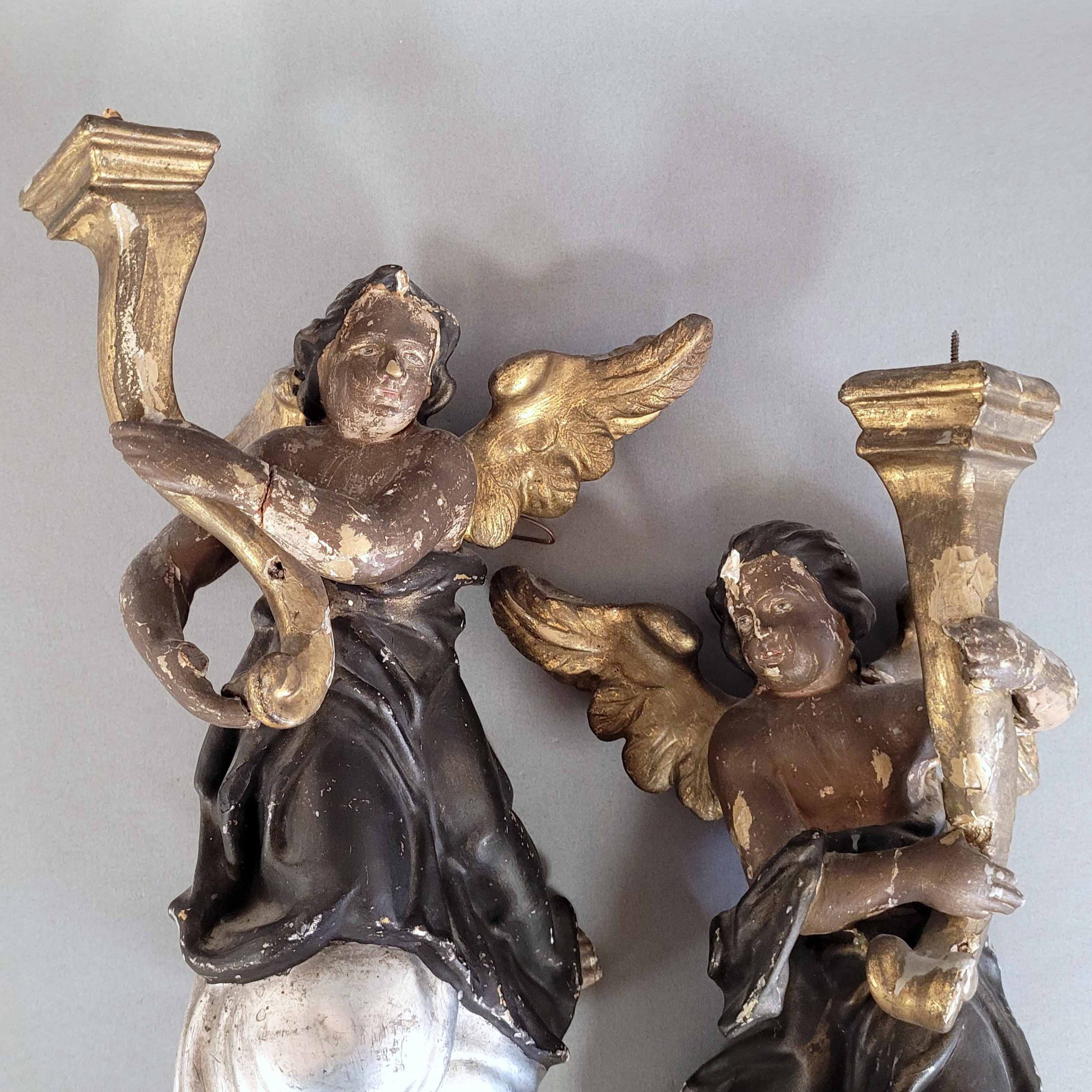 Paar Leuchterengel auf WolkenHolz, vollrund geschnitzt, ältere Fassung, Vergoldung und Versilberung, Deutsch, Ende 18. Jahrhundert, Höhe ca. 38 cm (Fehlstellen)